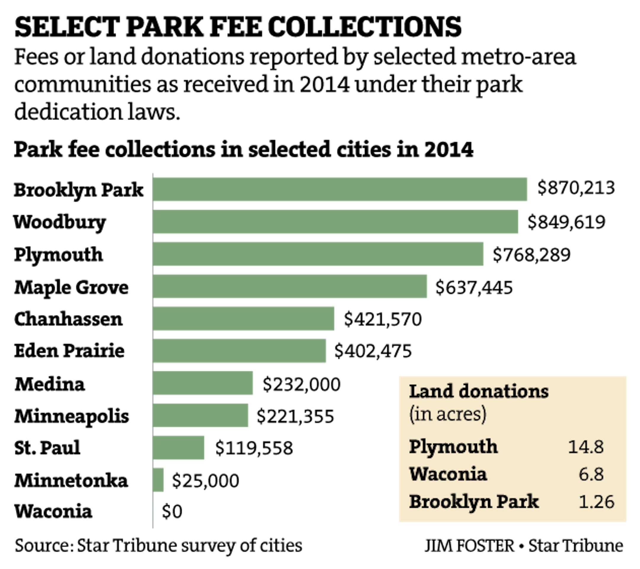Fees or land donations reported by select metro-area communications as received in 2014 under their park dedication laws.