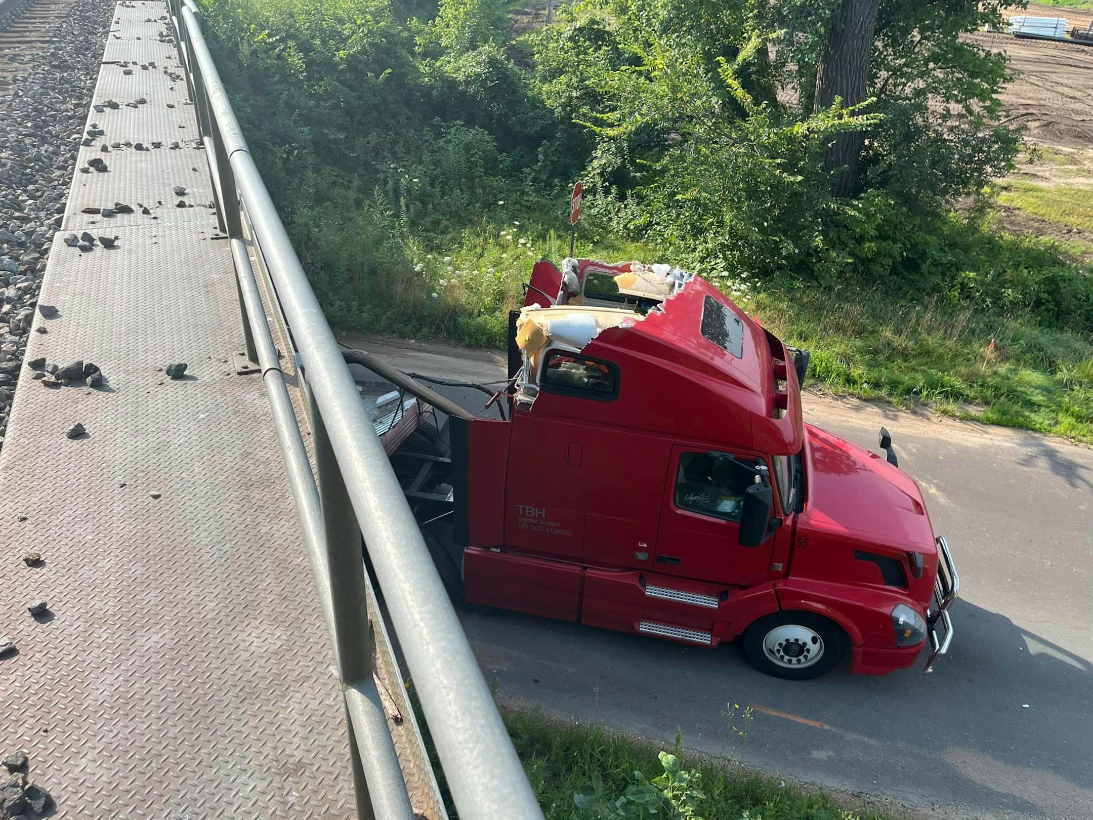 Police in Cottage Grove posted to Facebook photos of the crash showing the trailer wedged underneath the bridge and the cab’s roof scraped off in the Grey Cloud Island area.