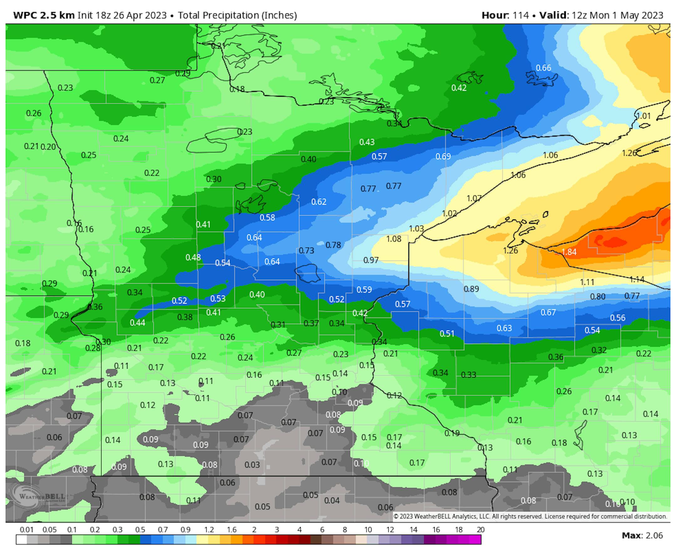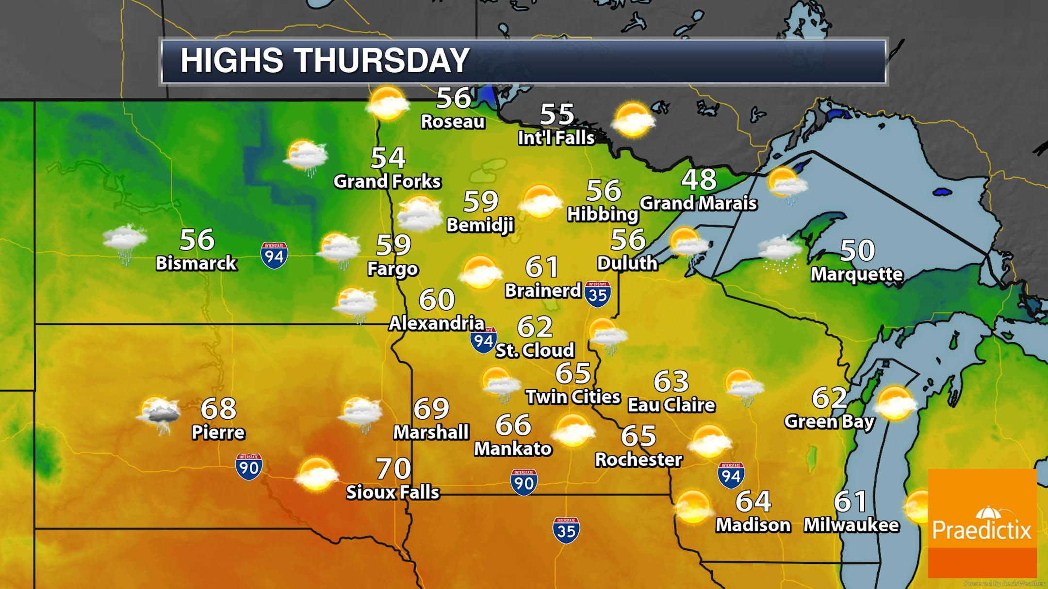 As a slower-moving area of low pressure moves through the region during the second half of the week and through the Great Lakes this weekend, we will see rounds of at least scattered showers from Wednesday Night onward. The periods with the best chances of rain in the metro will be Wednesday Night (with an inch or two of snow possible in the far northeastern part of the Arrowhead), Thursday afternoon through Friday afternoon, Saturday from the mid-morning hours to the evening, and again Sunday midday/afternoon.