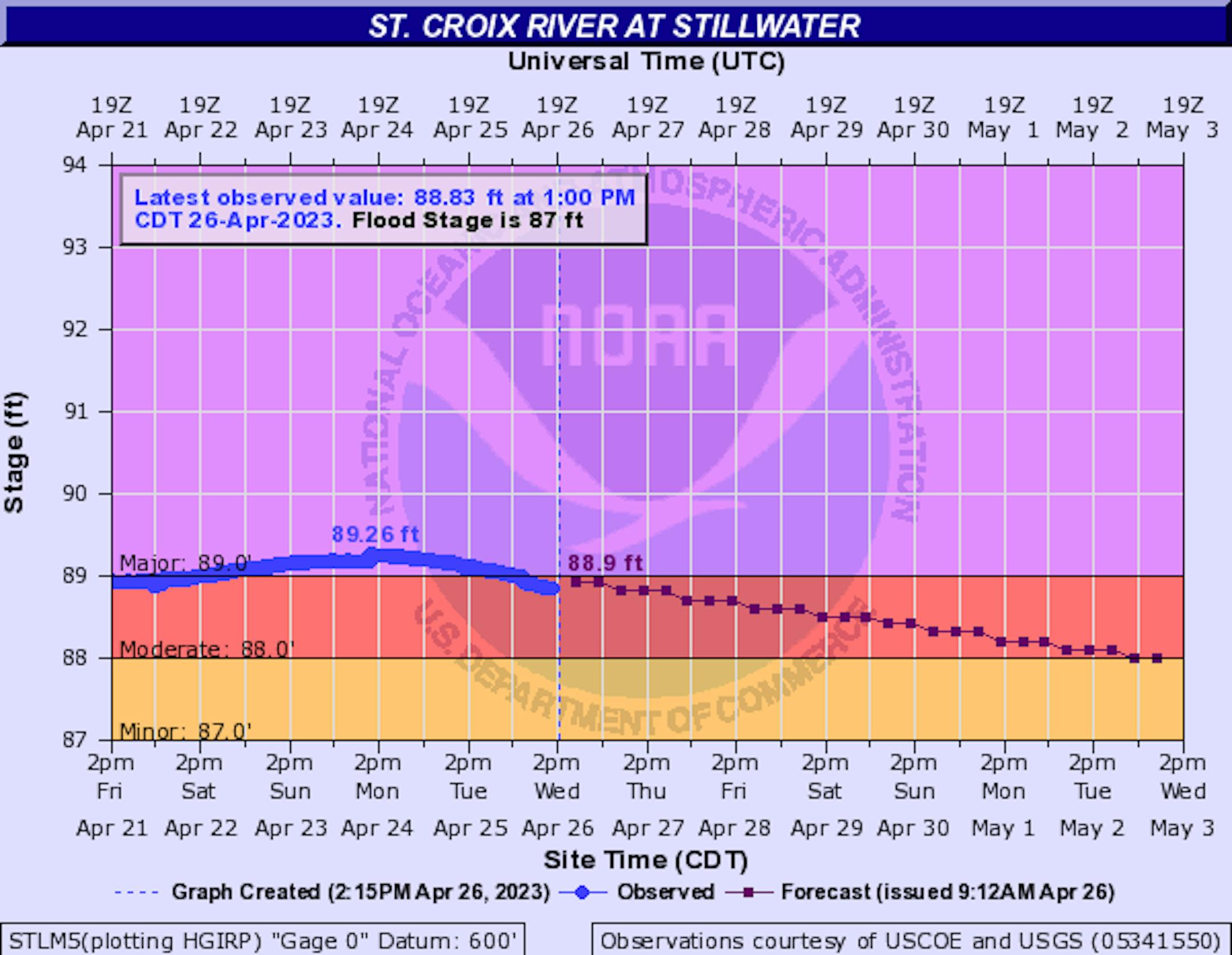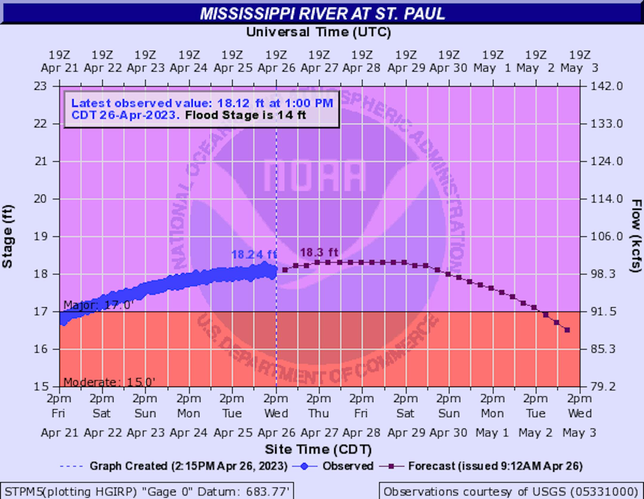 Looking at the Mississippi River at St. Paul, water levels are starting to level off some, with only a slight additional rise expected over the next couple of days before levels start to fall this weekend and early next week.