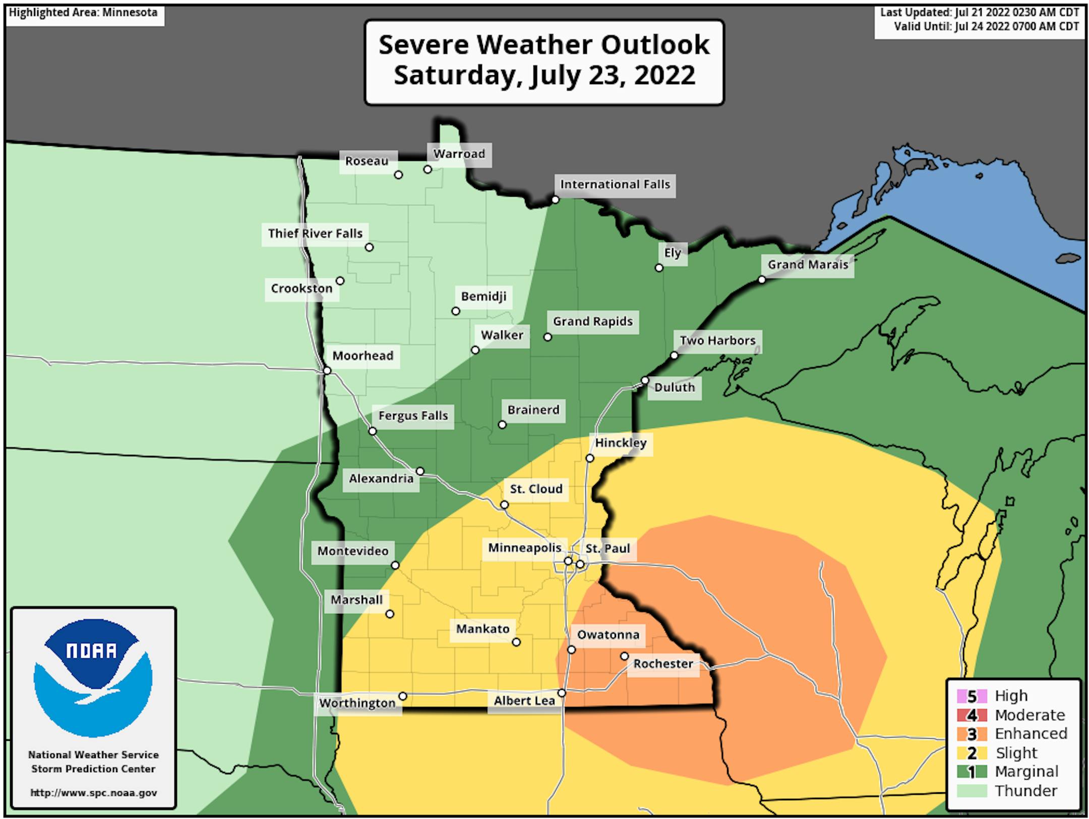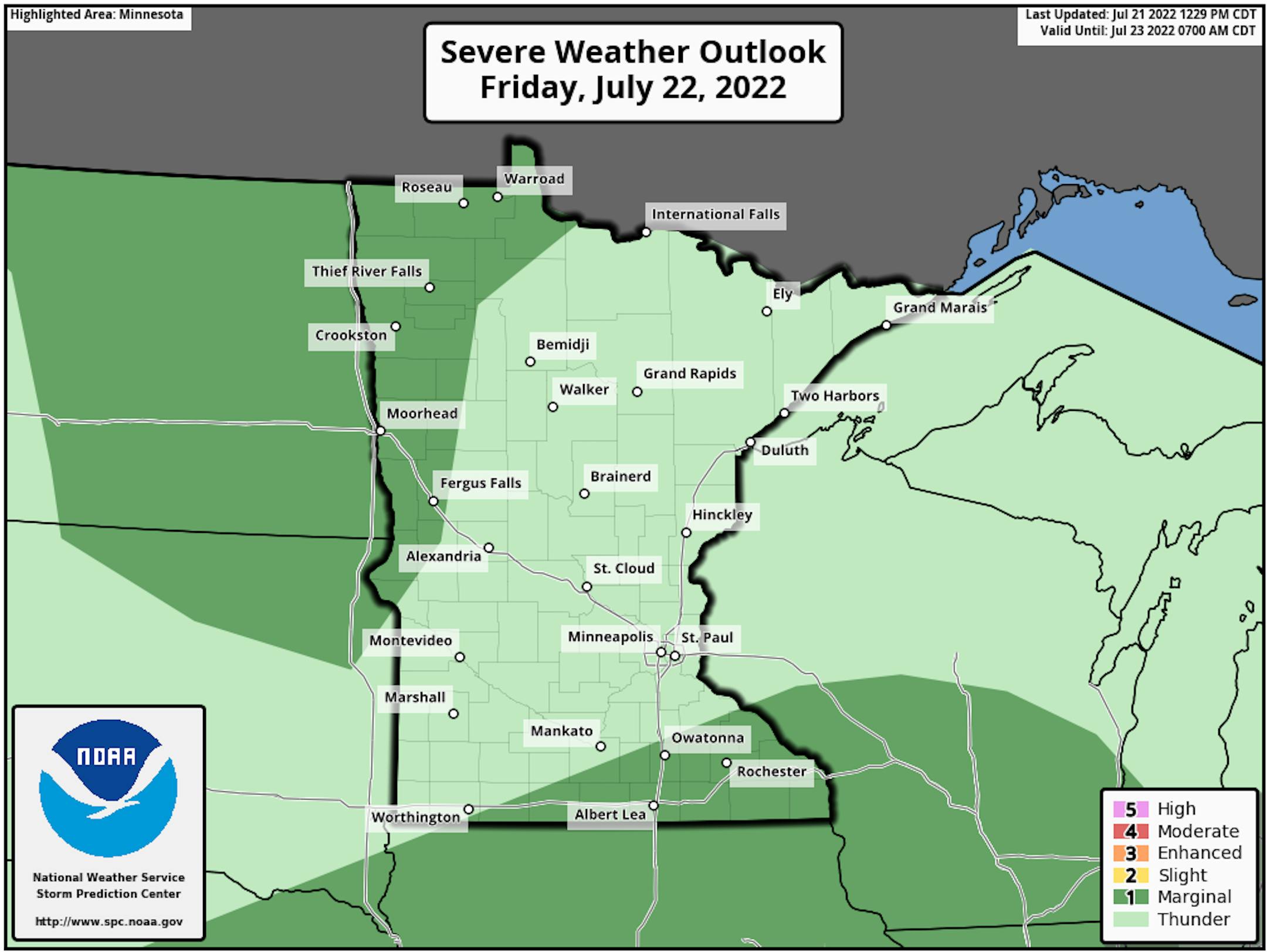 A few of the storms across southeastern Minnesota could be strong on Friday and Friday Night, with a Marginal Risk (threat level 1 of 5) in place. Damaging winds and large hail will be the main threats. A Marginal Risk is also in place in northwestern/western Minnesota for Friday Night, with hail and wind the main threats as well.