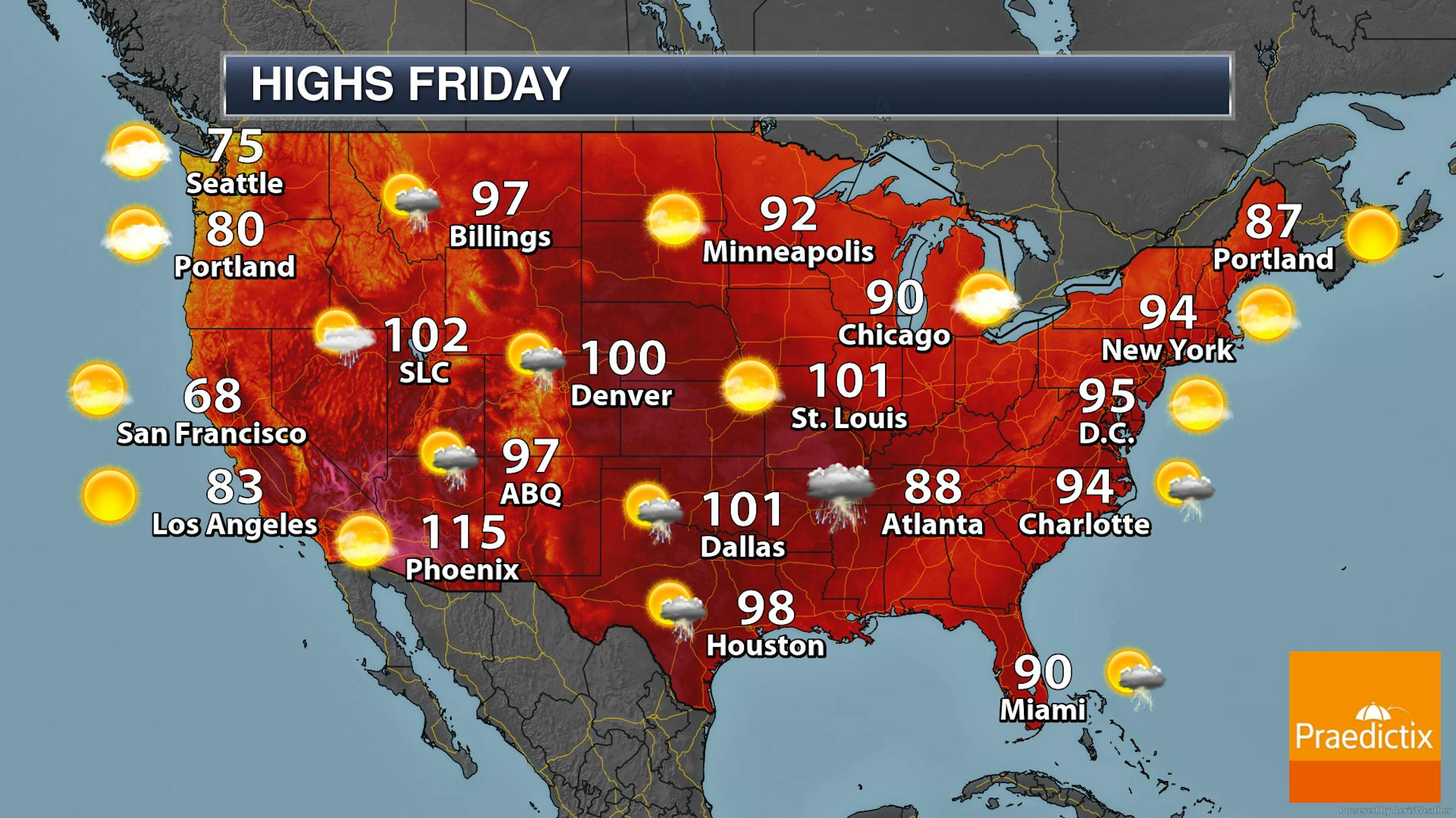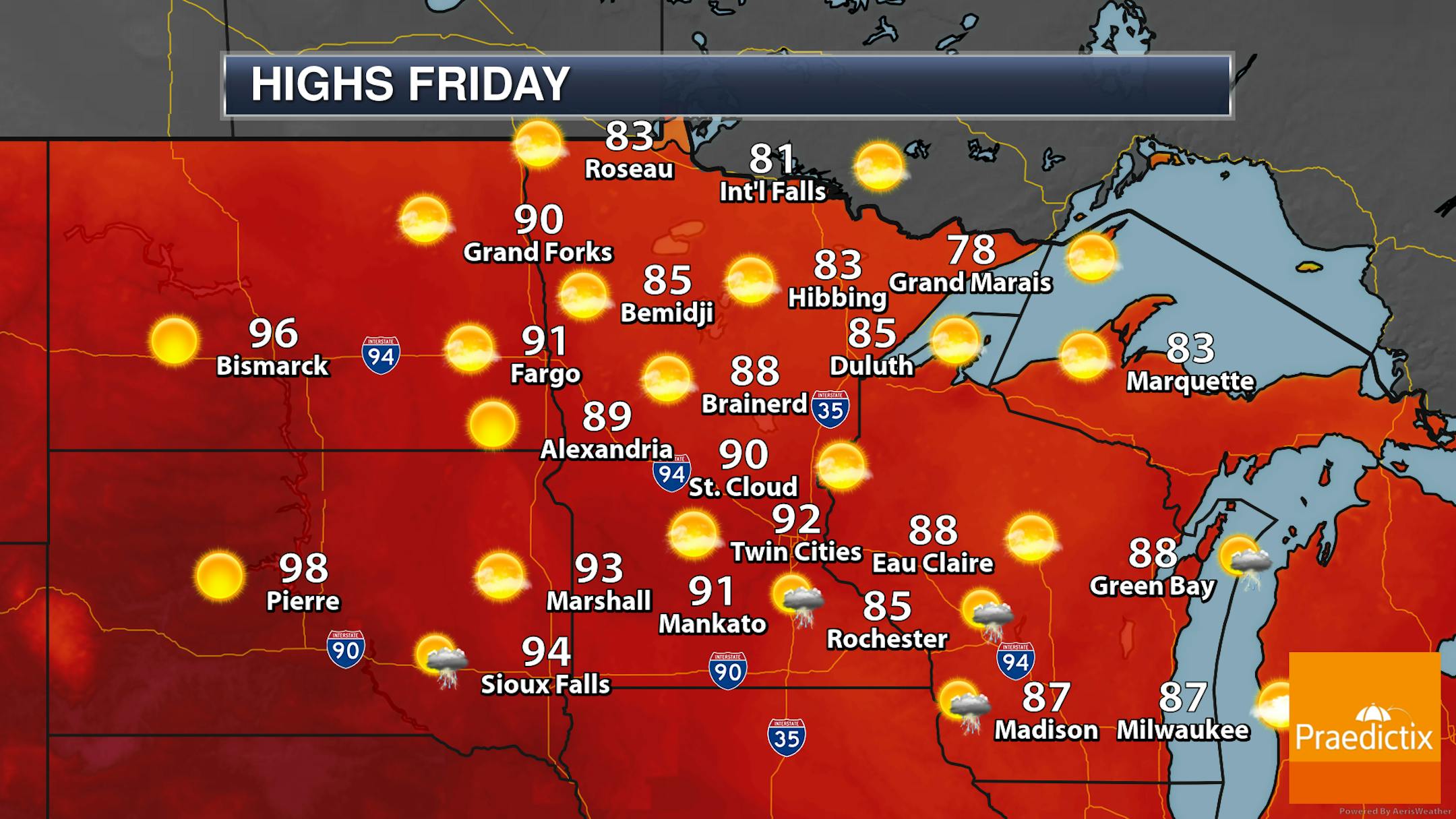 For the most part, it'll be a hot and sunny day across the state on Friday but a few isolated storms can't be ruled out in southeastern Minnesota into Wisconsin. Temperatures for the most part will be in the 80s and 90s across Minnesota, with a few stragglers in northern parts of the state and the North Shore hanging in the 70s.