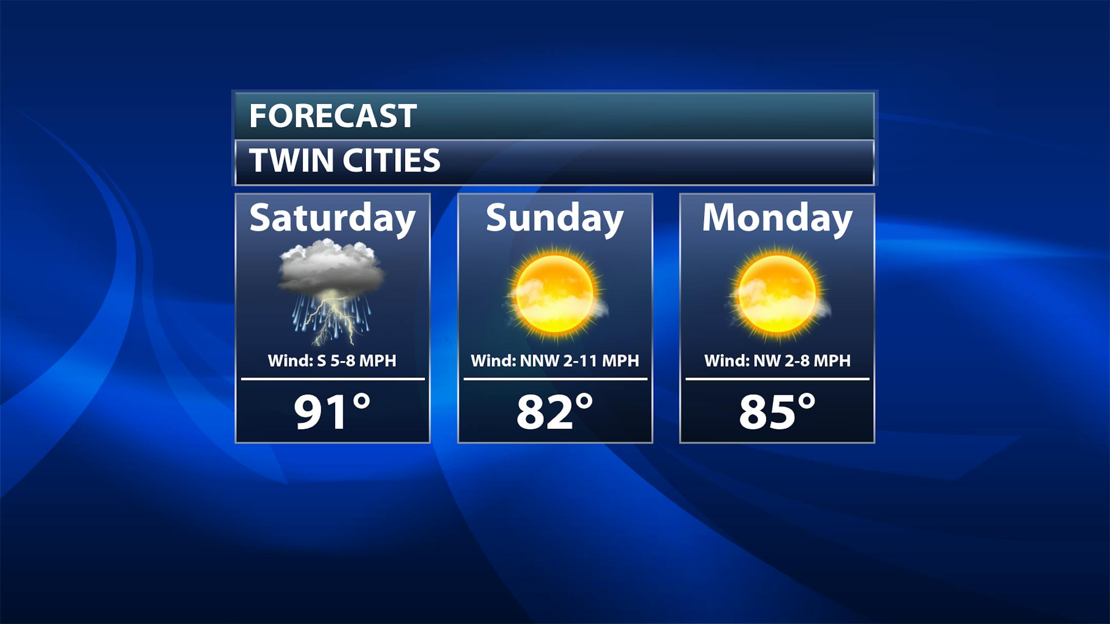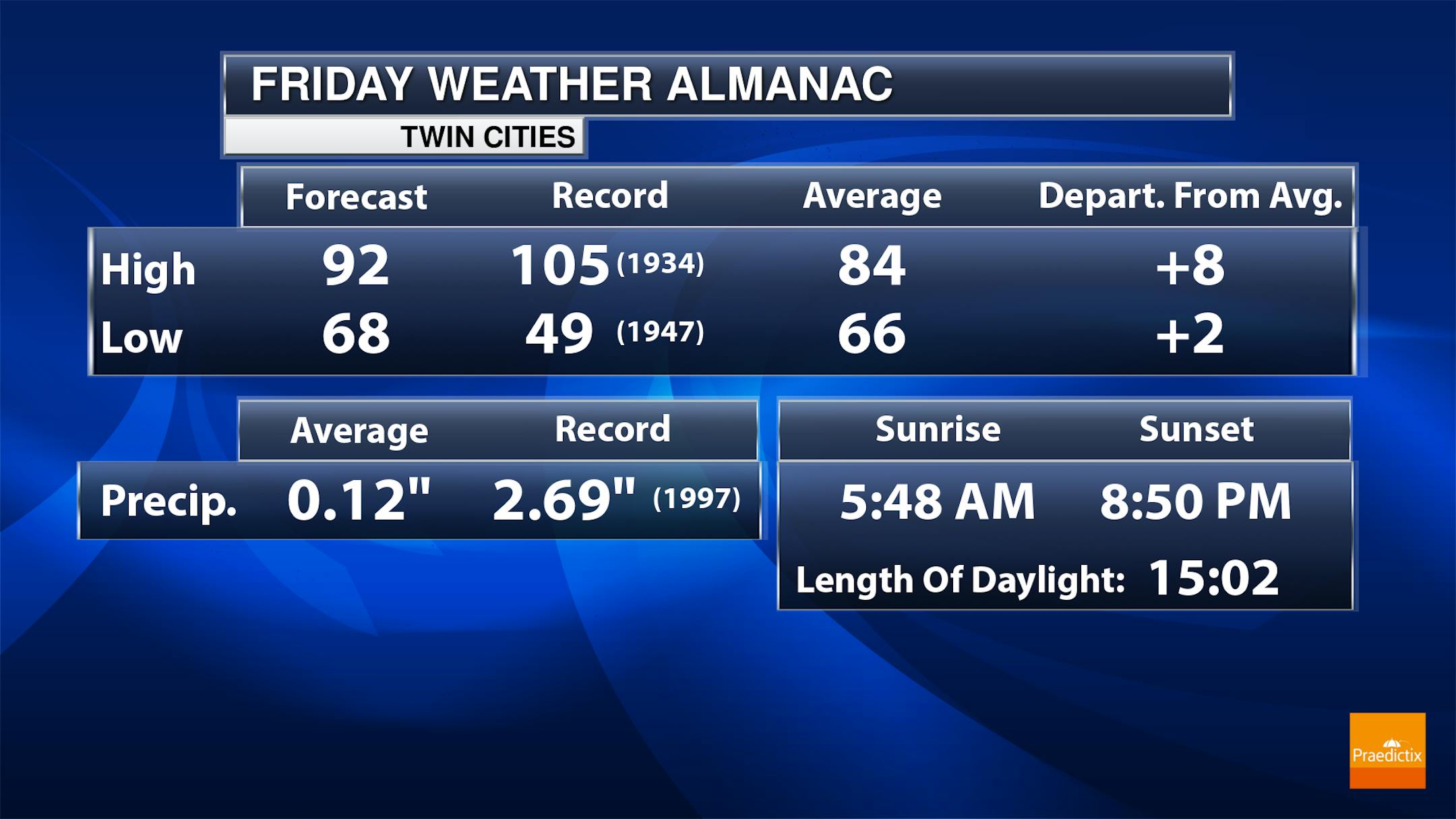 Chalk up another 90F degree day for Friday in the metro under mainly sunny skies (though we could see a few clouds, especially in the morning due to some overnight showers/storms that mainly pass south and west of the Twin Cities). Morning temperatures start off around 70F before we climb to the low 90s for highs. With dew points around 60F, feels like temperatures won't factor in too much.