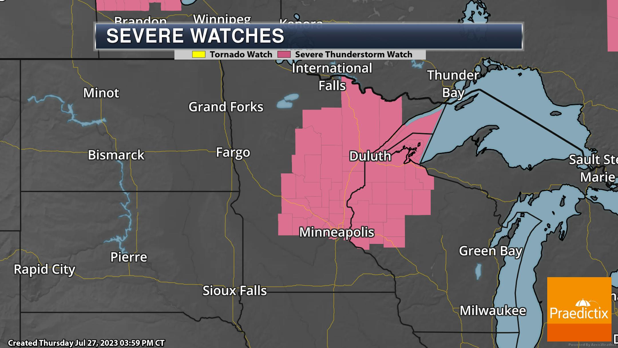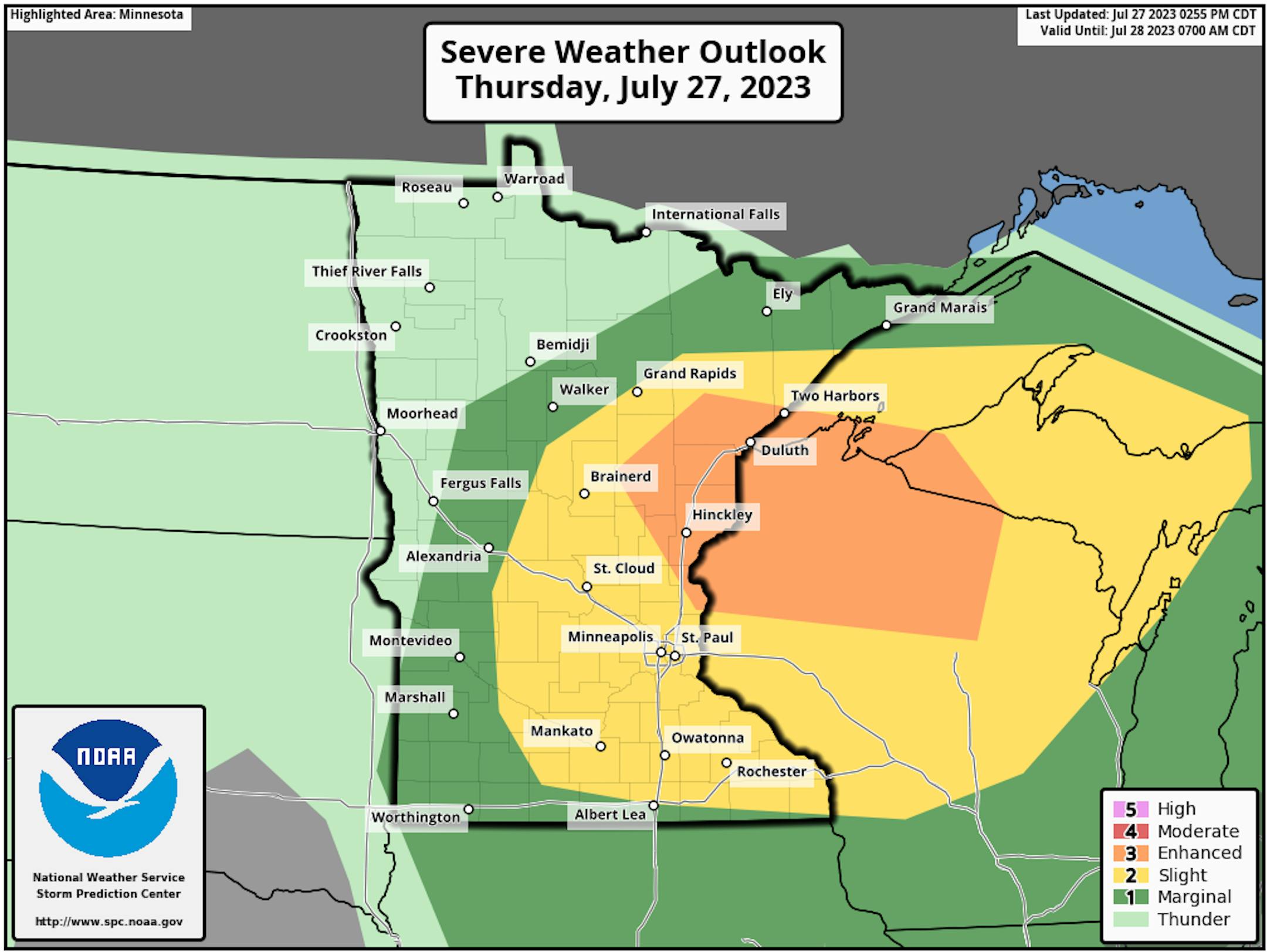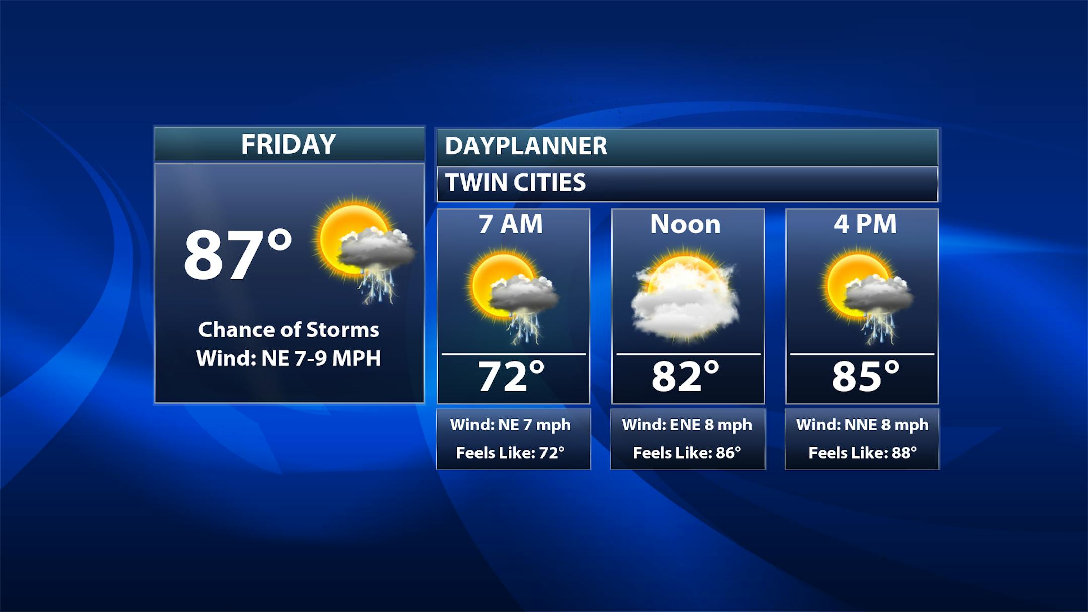 As we head through the rest of Thursday into Thursday Night, we are tracking the likelihood of severe weather - especially in the eastern half of the state and into Wisconsin. Storms as they form and move through will be capable of very large hail (2"+ in diameter), destructive winds (potentially 75+ mph gusts), and up toward where that Enhanced Risk is an isolated tornado threat. The severe threat includes the metro, where the best timing for storms appears to be from about the dinner hour to potentially around midnight.