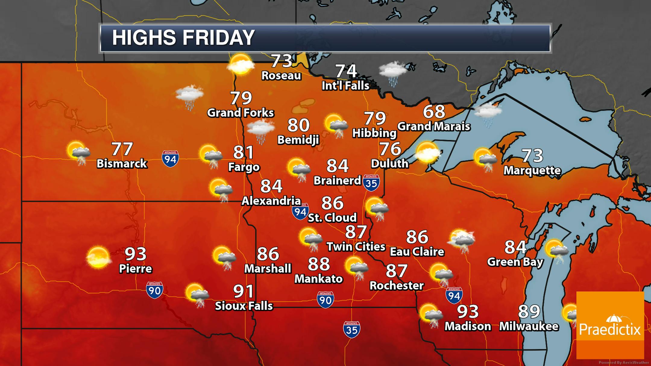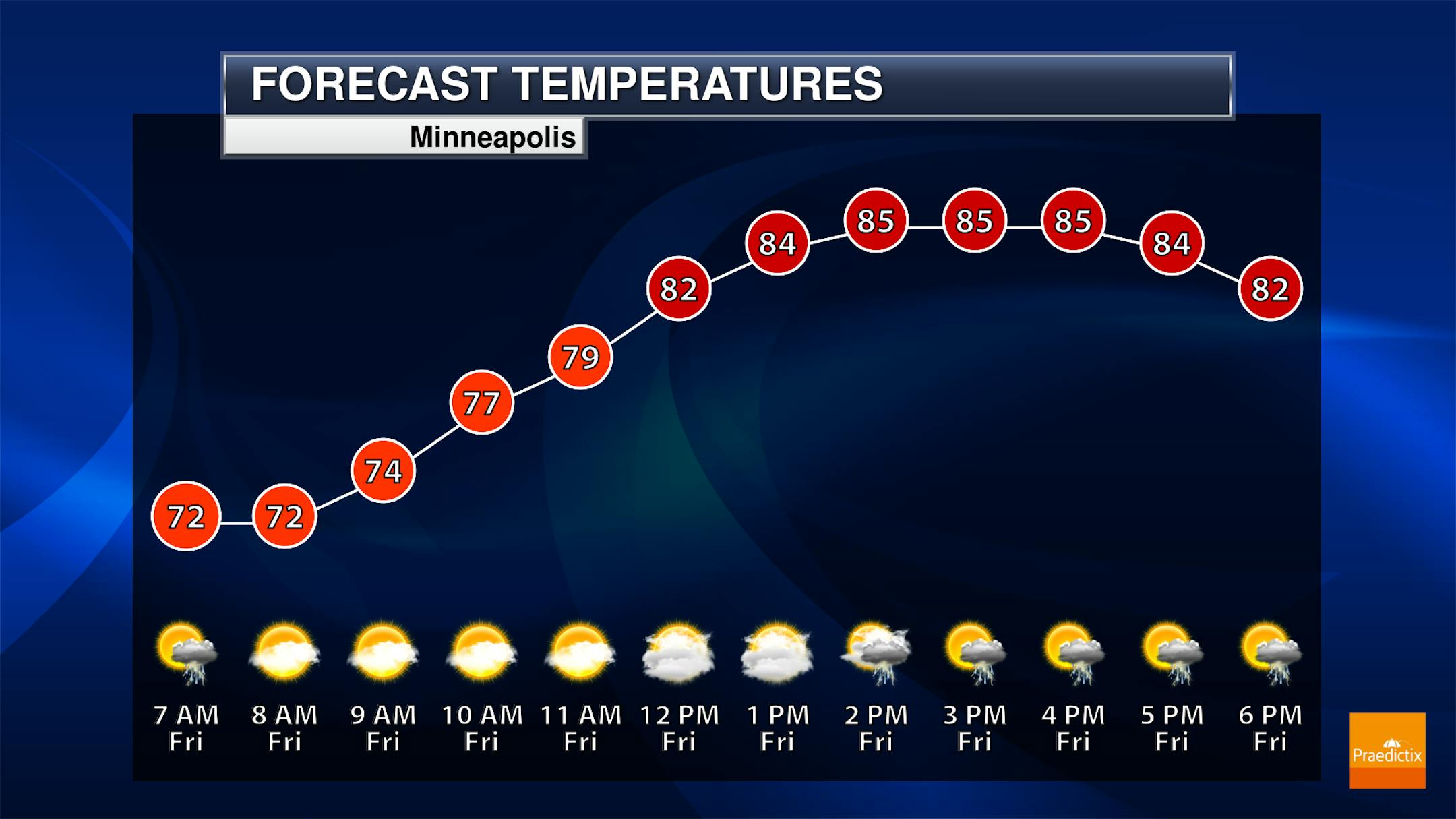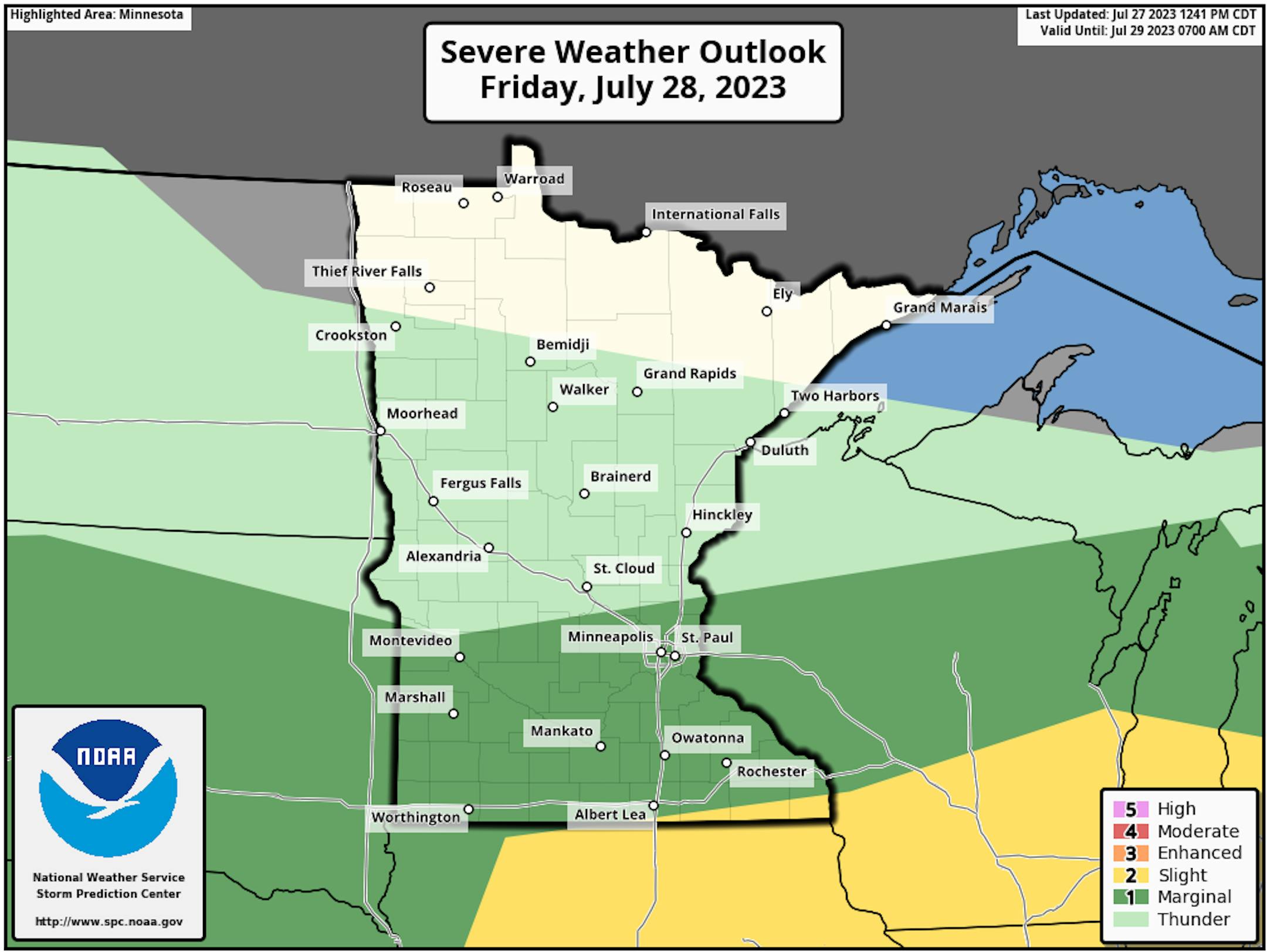 As we head through the rest of Thursday into Thursday Night, we are tracking the likelihood of severe weather - especially in the eastern half of the state and into Wisconsin. Storms as they form and move through will be capable of very large hail (2"+ in diameter), destructive winds (potentially 75+ mph gusts), and up toward where that Enhanced Risk is an isolated tornado threat. The severe threat includes the metro, where the best timing for storms appears to be from about the dinner hour to potentially around midnight.