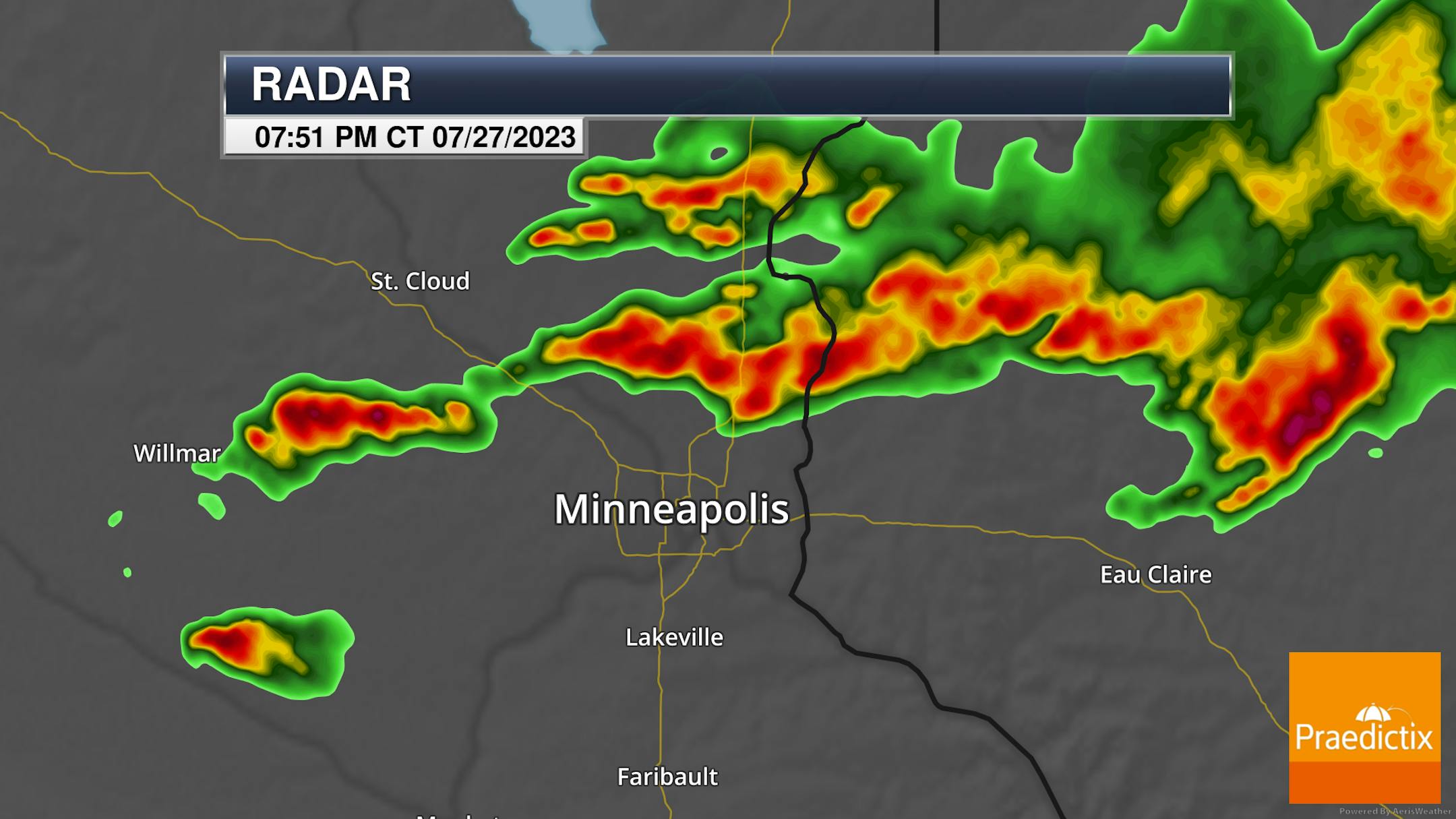 We're tracking strong storms stretching from Litchfield to the north of the metro and into Wisconsin that are producing heavy rain, lots of lightning, and the occasional potential for hail and stronger wind gusts.