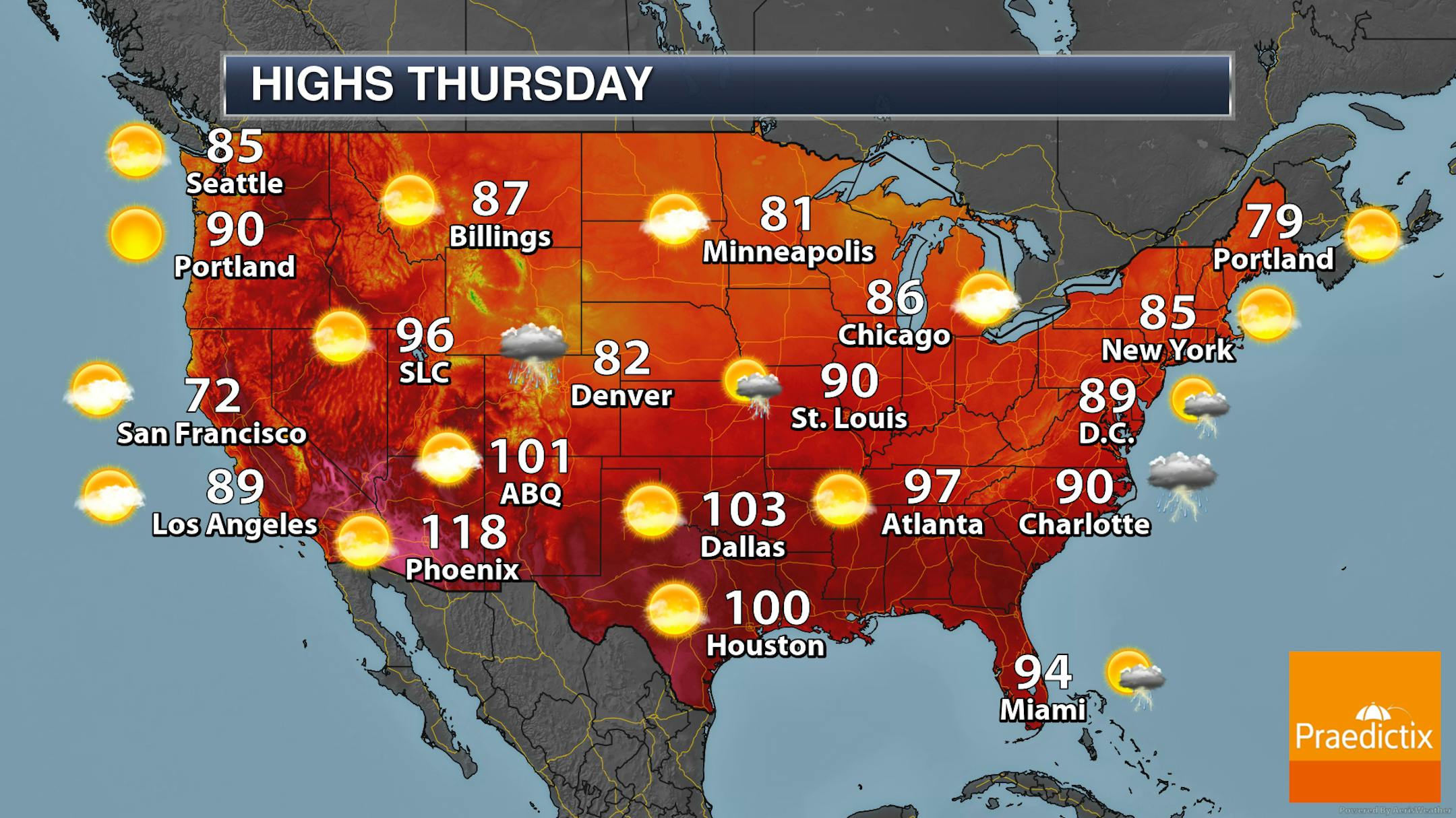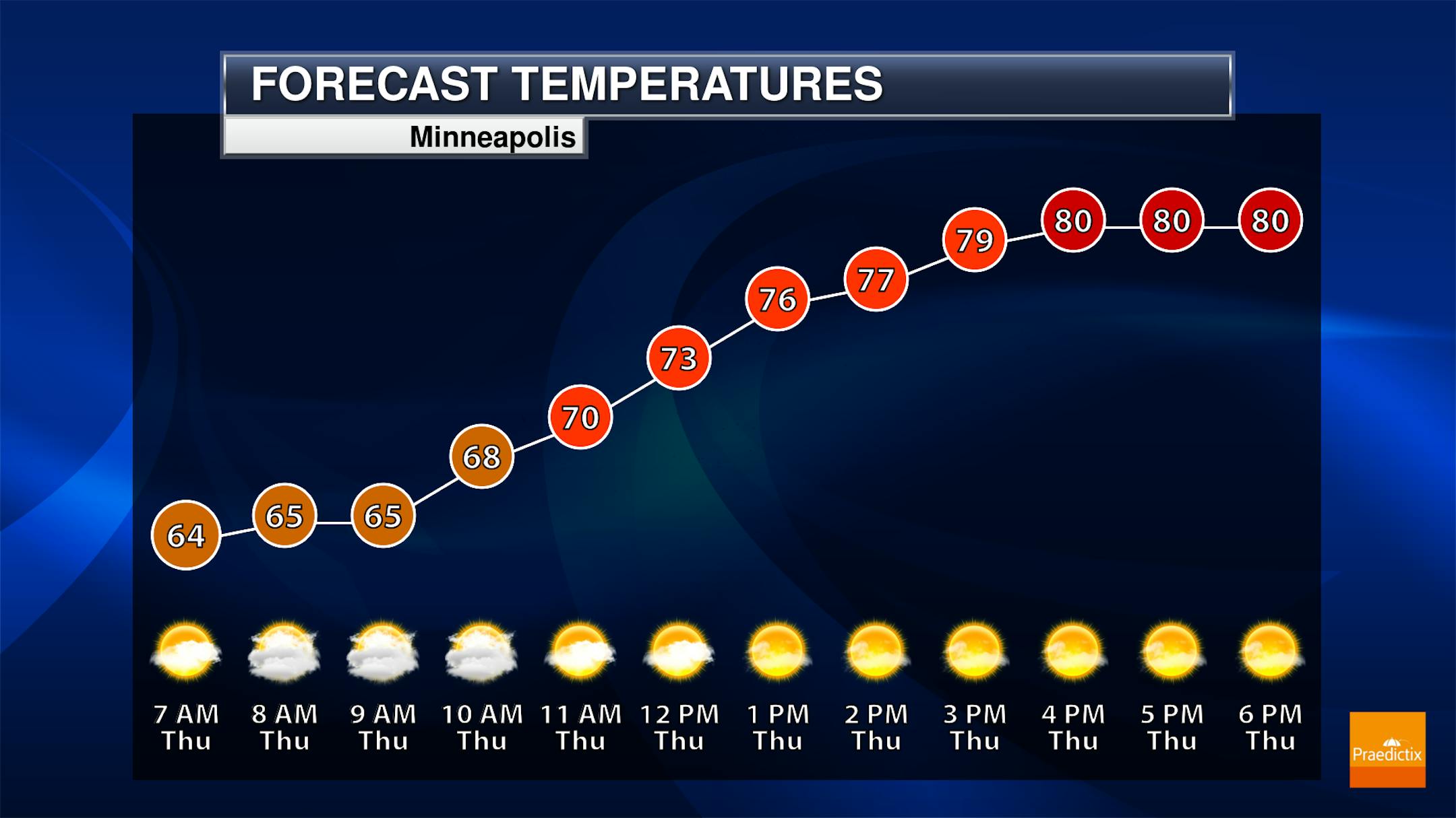 While Thursday is expected to start on the cloudy side on Thursday, we should see some clearing skies into the afternoon hours. Morning temperatures will start off in the mid-60s with highs climbing to around 80F.