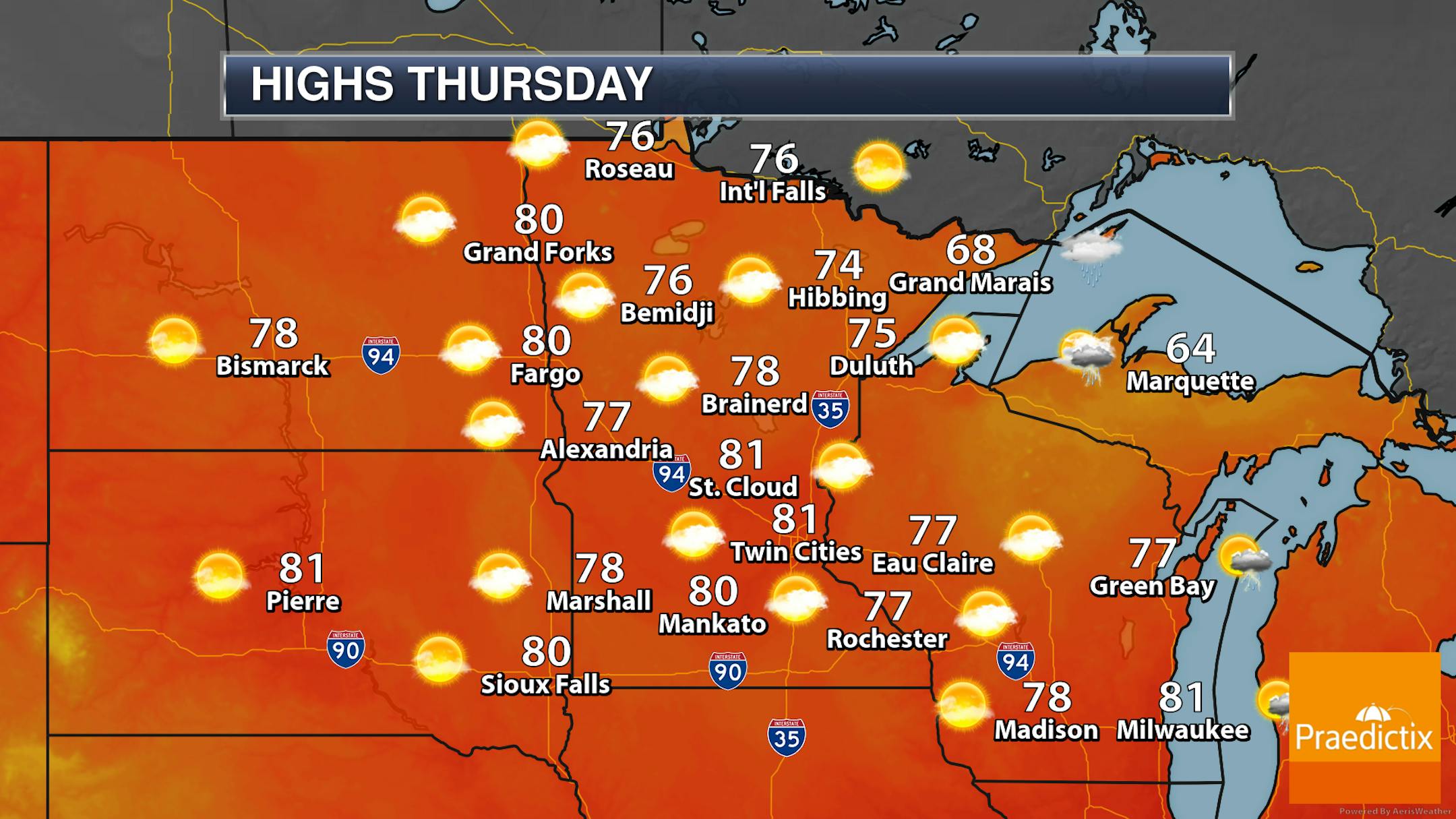 While there could be a little haze in the atmosphere Thursday, we aren't expecting to see smoke reach the ground. Most of the state will see a mix of sun and clouds to mainly sunny skies with highs ranging from the 60s along the North Shore to the low 80s in parts of western and southern Minnesota. The rain chance up toward Grand Marais is mainly early in the morning.