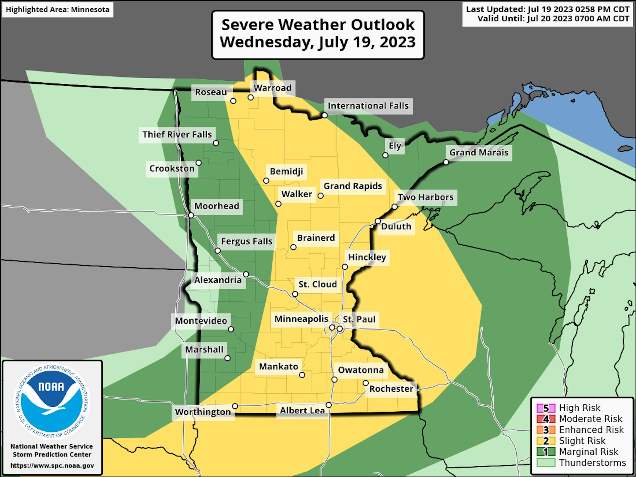 Due to the continued threat of severe weather through Wednesday evening, a Slight Risk of severe weather (threat level 2/5) is in place from north-central Minnesota to the eastern half of the state and many areas of southern Minnesota - including the metro. Very large hail and wind are the primary threats, but an isolated tornado or two can't be ruled out.