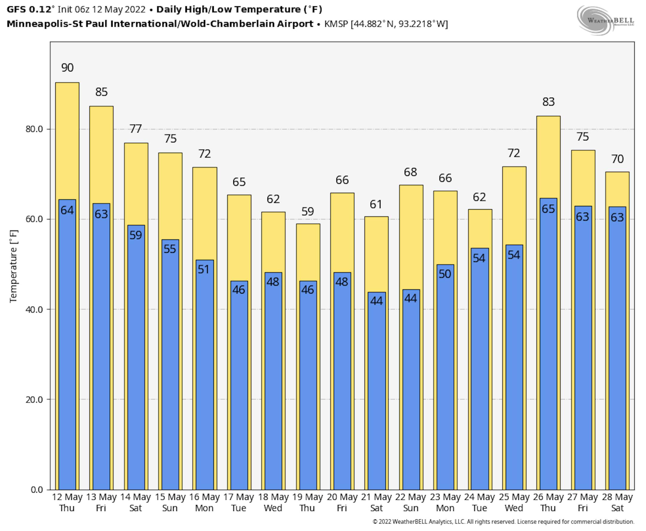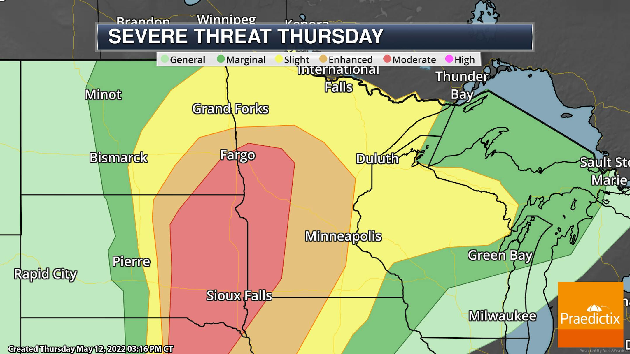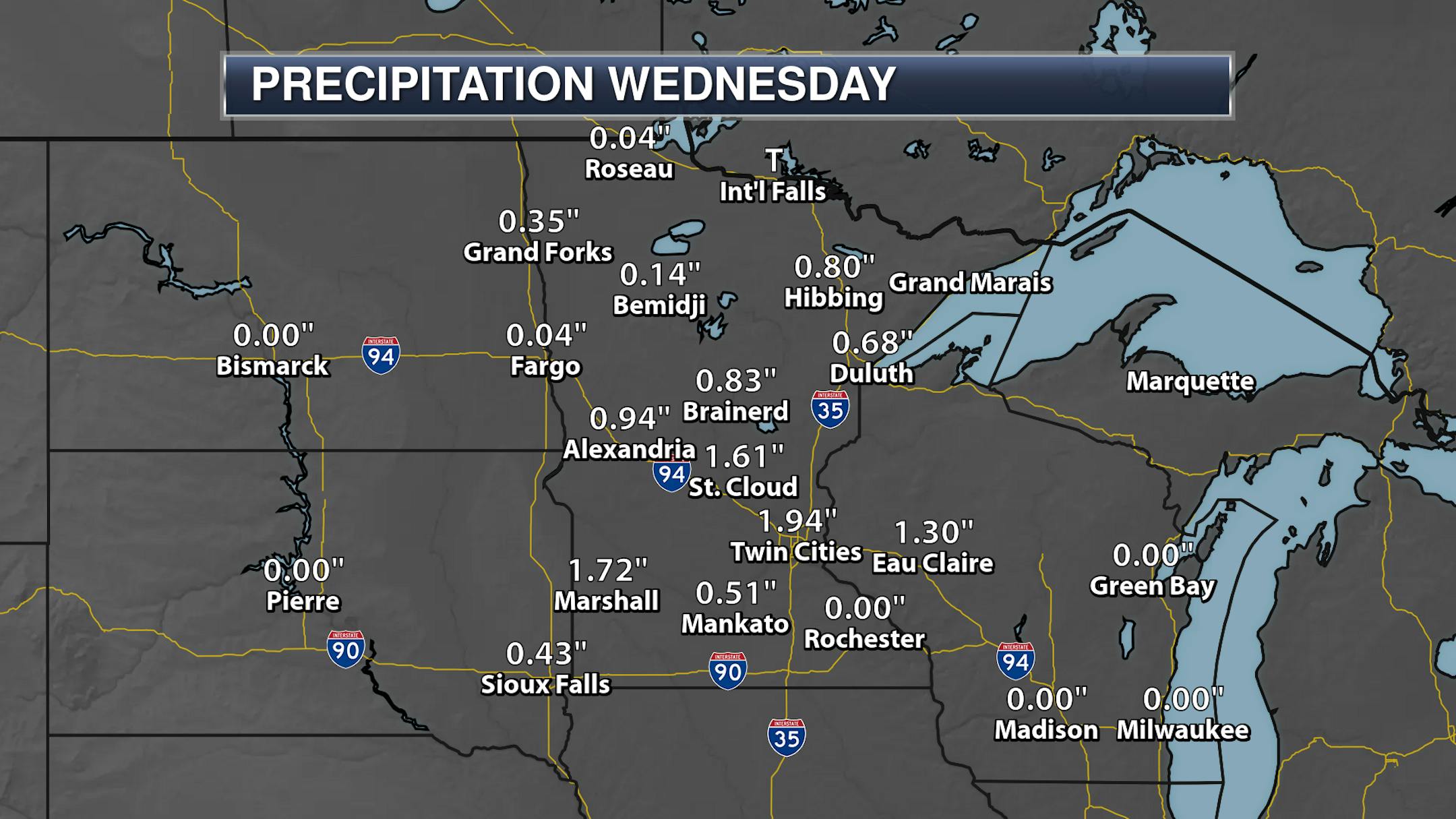 The multiple rounds of storms that rumbled across the region on Wednesday brought heavy rain with them, at times with 1-2" per hour reported. MSP set a record for Wednesday with 1.94" of rain falling - the previous record was 1.55" in 1935. The top airport rainfall report was in Buffalo, where 3.87" was reported. Meanwhile, a Granite Falls COOP observer reported a daily rainfall of 4.68" through 8 PM Wednesday. A CoCoRaHS observer out in Prinsburg (Kandiyohi County) reported 5.16" as of 6 AM Thursday.