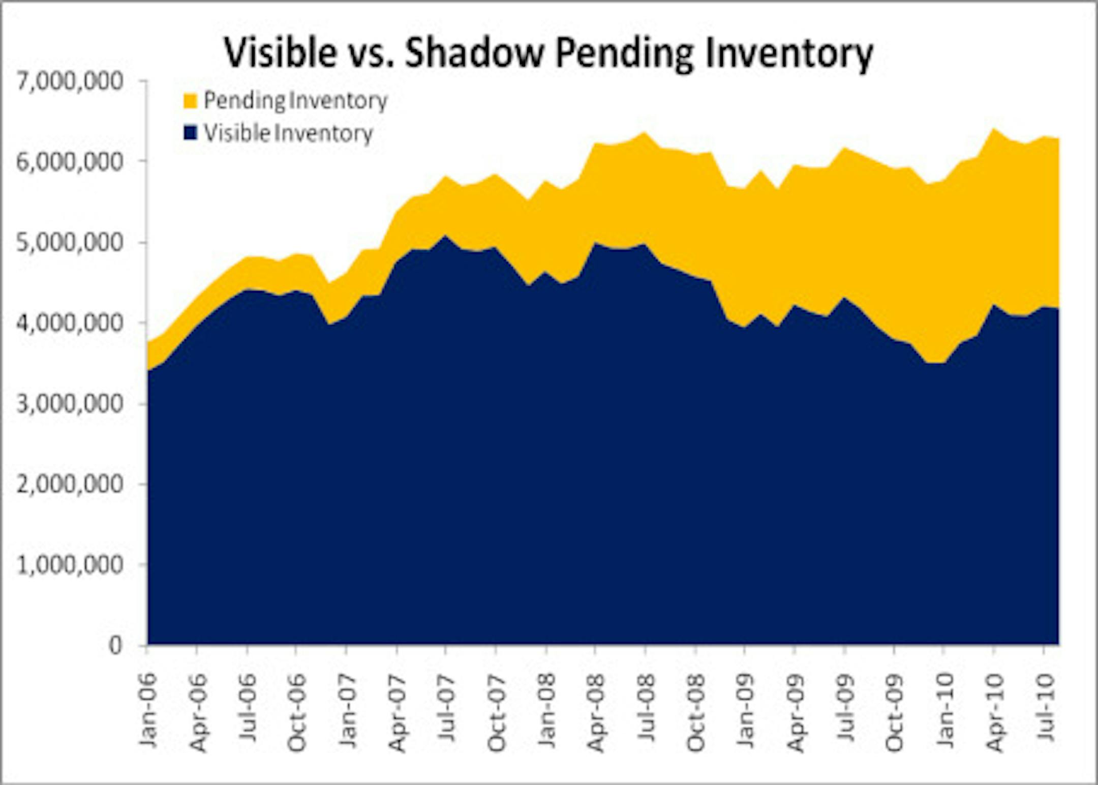 Here's another Just Listed market watch update: The number of unlisted bank-owned houses and potential foreclosures as of August 2010 rose 10 percent compared with last year at this time, according to CoreLogic, a real-estate research firm. The report is significant because it's an indication of how many additional homes might hit the market in the coming months. According to the latest data that shadow inventory now stands at an eight-month supply, up from five months a year ago. CoreLogic calls this "shadow inventory," or pending supply, and it looks at how many properties are seriously delinquent (90 days or more), in foreclosure or are bank owned but not currently listed on the MLS.