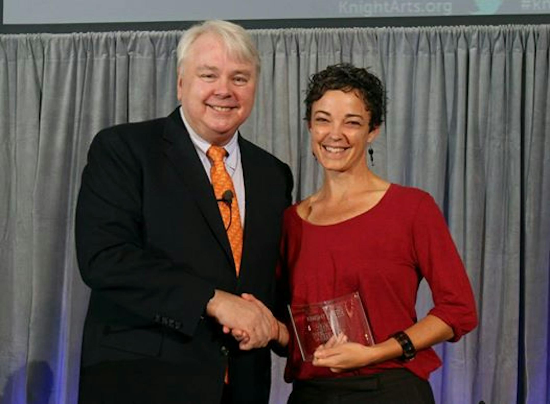 Wonderlust cofounder Leah Cooper, right, recently received a $35,000 Arts Challenge award from the Knight Foundation's Dennis Scholl, at left. That money will be used to stage a play about the State Capitol. The theater company is also in the early stages of crafting a play about adoption in Minnesota and invites the public to share their stories.