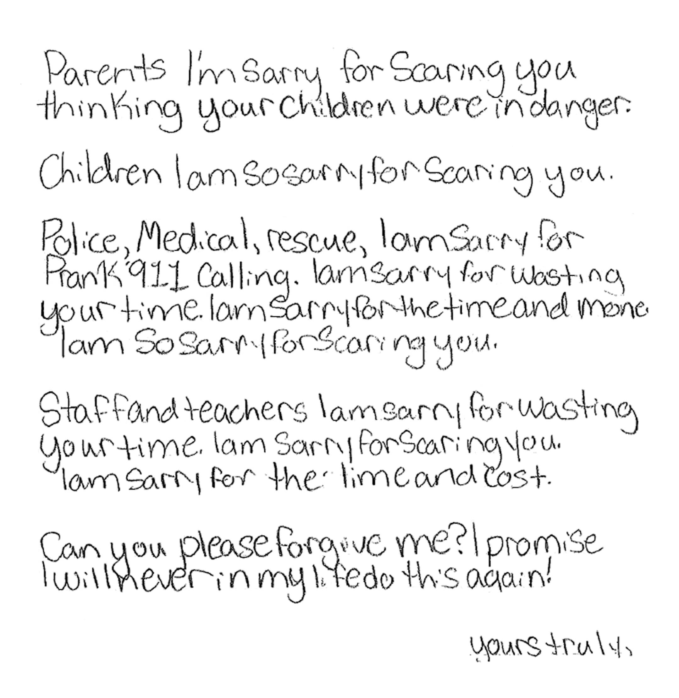 They also released a handwritten note from the boy which ended, "Can you please forgive me? I promise I will never in my life do this again!"