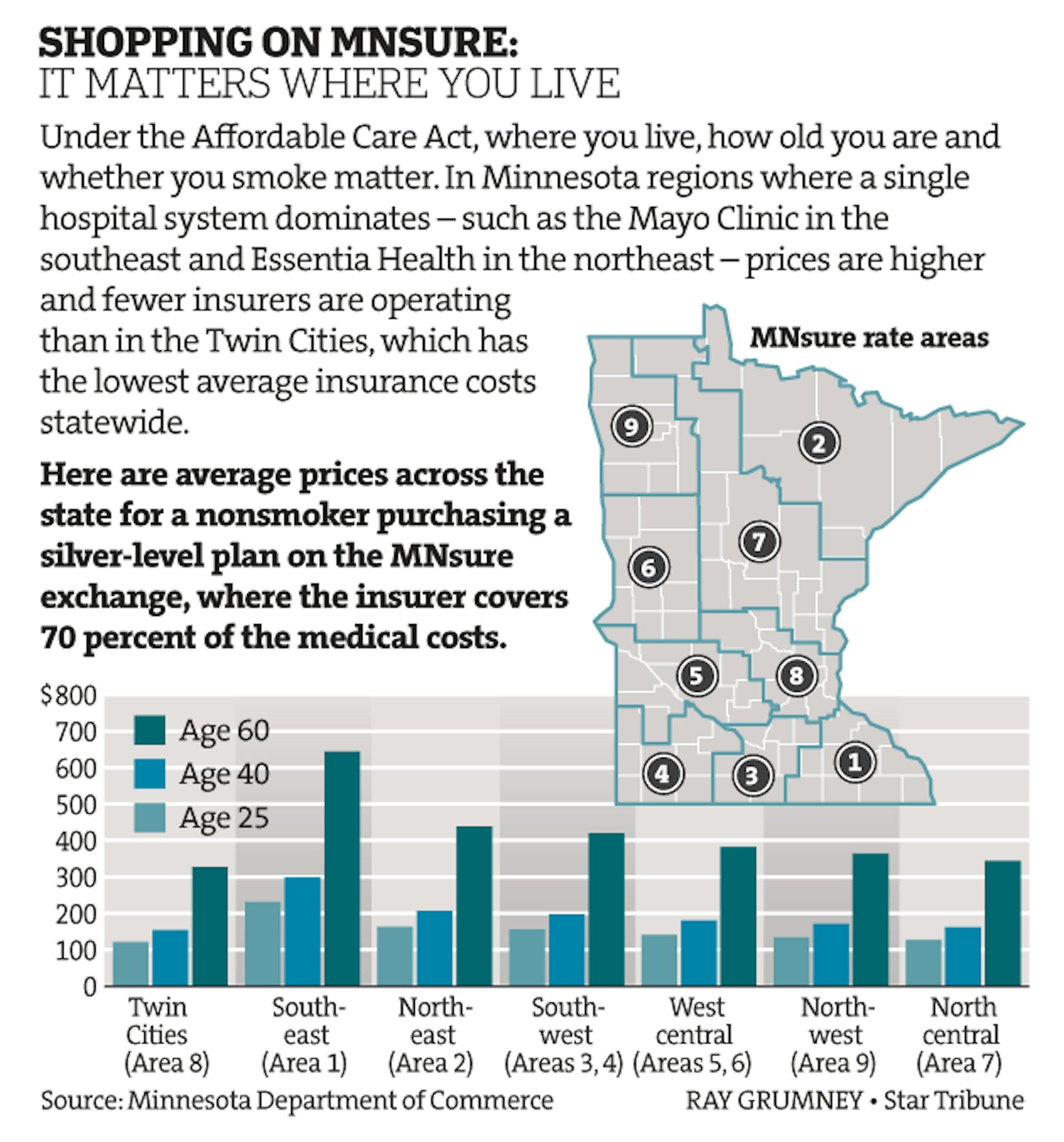 Under the Affordable Care Act, where you live, how old you are and whether you smoke matter. In Minnesota regions where a single hospital system dominates – such as the Mayo Clinic in the southeast and Essentia Health in the northeast – prices are higher and fewer insurers are operating than in the Twin Cities, which has the lowest average insurance costs statewide.