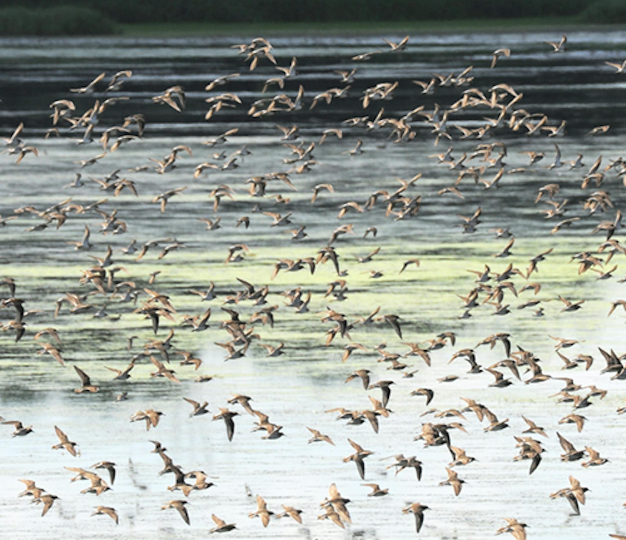 The recent heavy rains have created many good places to look for migrating shorebirds. Flooded farm fields are good. These birds were west of New Germany in Carver County, feeding and resting in the shallow edges of a wetland. They flush easily, most often flying a wide circle, returning to where they were. Migration should continue into September, depending on species.