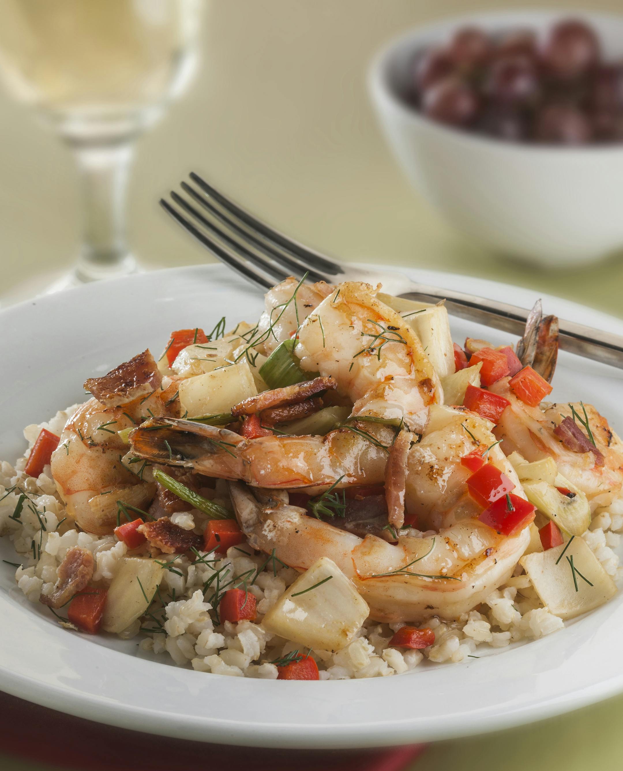 Yet, using just a little bacon, at about 70 calories and 6 grams of fat per slice, added a lot of flavor without taking the dish over the top. We split the dish between two of us, but a more realistic cook might make the recipe for four diners. (With that in mind, I increased the fennel to two bulbs and raised the amount of rice, as well.)