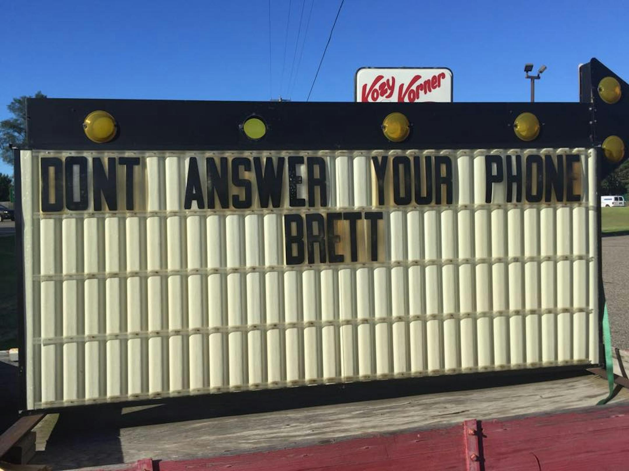 Logically, we all know there's no way Favre is coming back. But just in case, there are signs like this one just across the border in Hudson, Wis., to curb any comeback urges Favre might feel. It was tweeted out by Blake Fry, President of the Hudson Chamber of Commerce.
