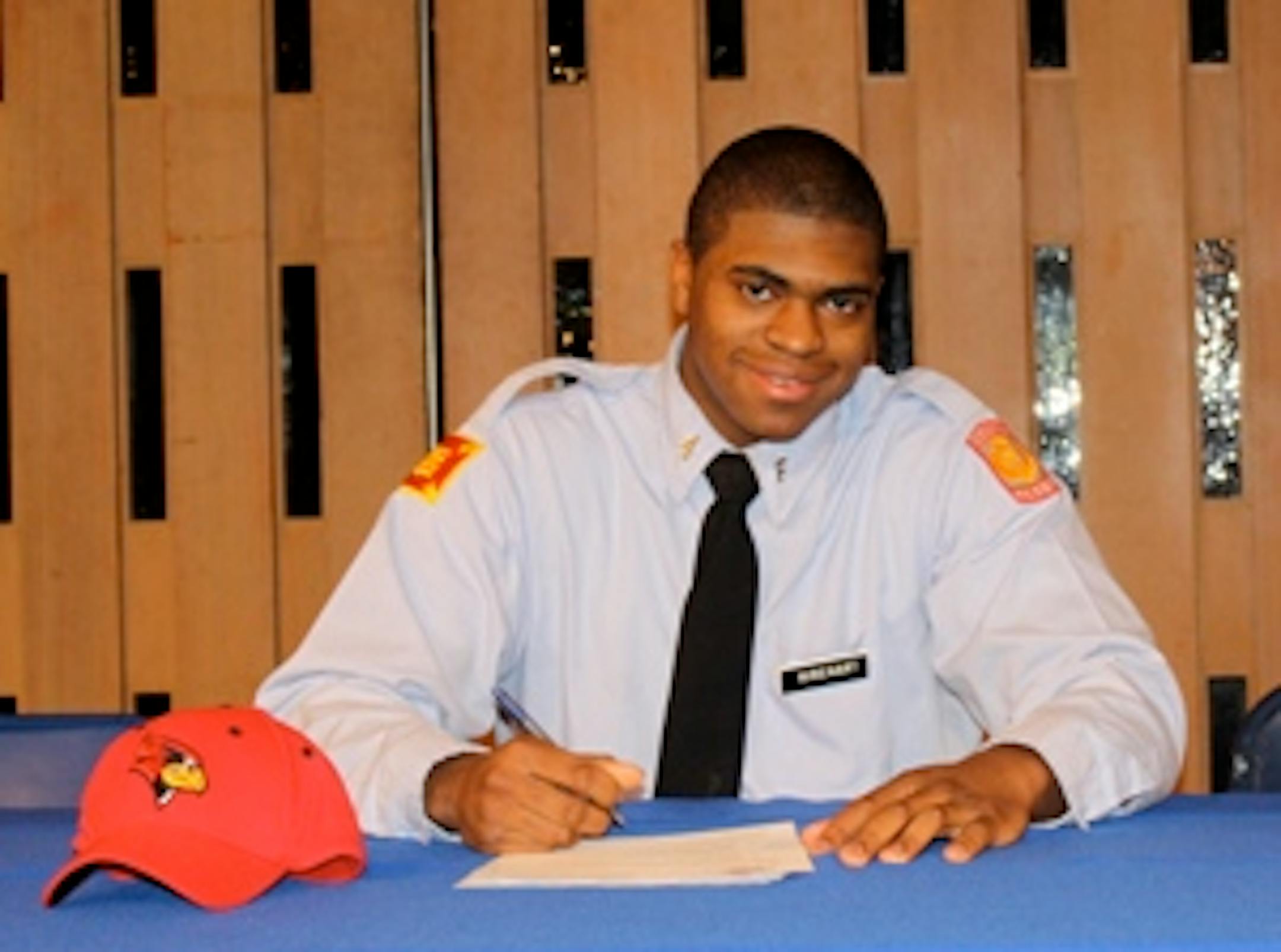 Below: Offensive tackle Isaac Rinehart from St. Thomas Academy is shown during his signing ceremony. He will play football at Illinois State.