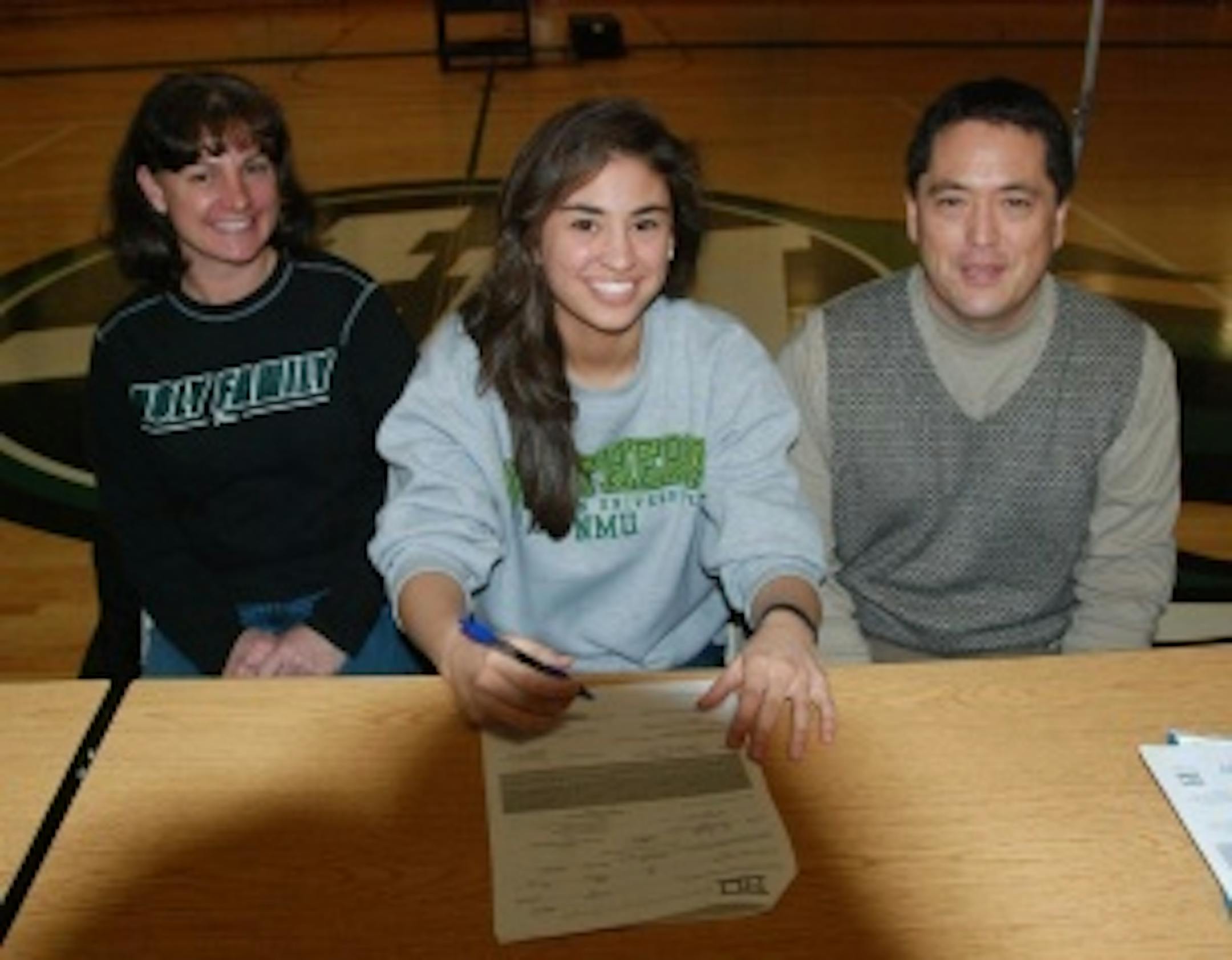 Holy Family's Kaylagh Hollen from Victoria, Minnesota, is shown with her parents Chris and Jonie Hollen, after signing her National Letter of Intent to play soccer and attend classes at The University of Northern Michigan.