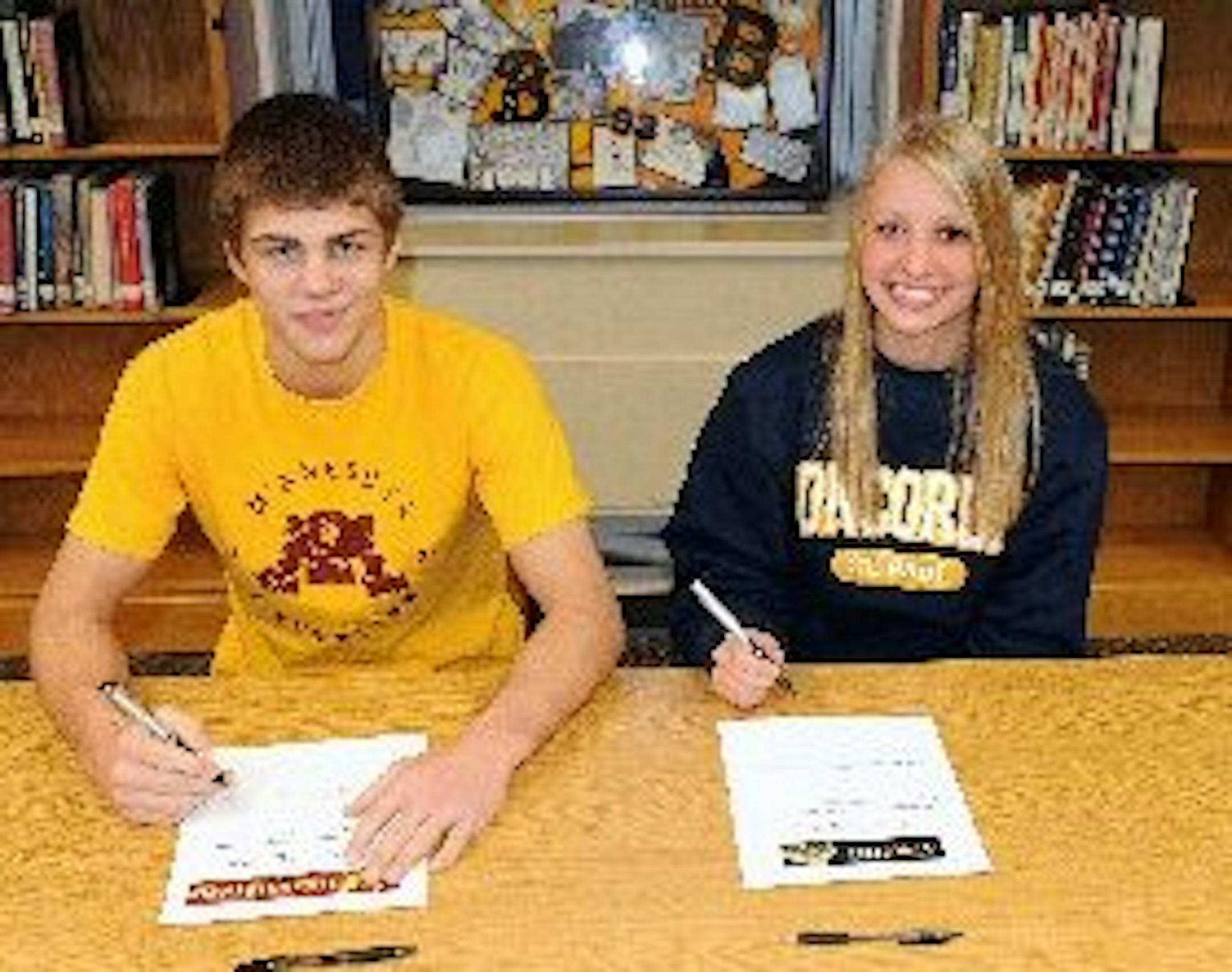 Dylan Ness and Rachel Skog of Bloomington Kennedy. Ness, a wrestler, signed with the Gophers in the fall but went through the ceremony at his school today. Skog, a soccer player, will continue her career at Concordia-St. Paul. (Photo courtesy of Brian Nelson)