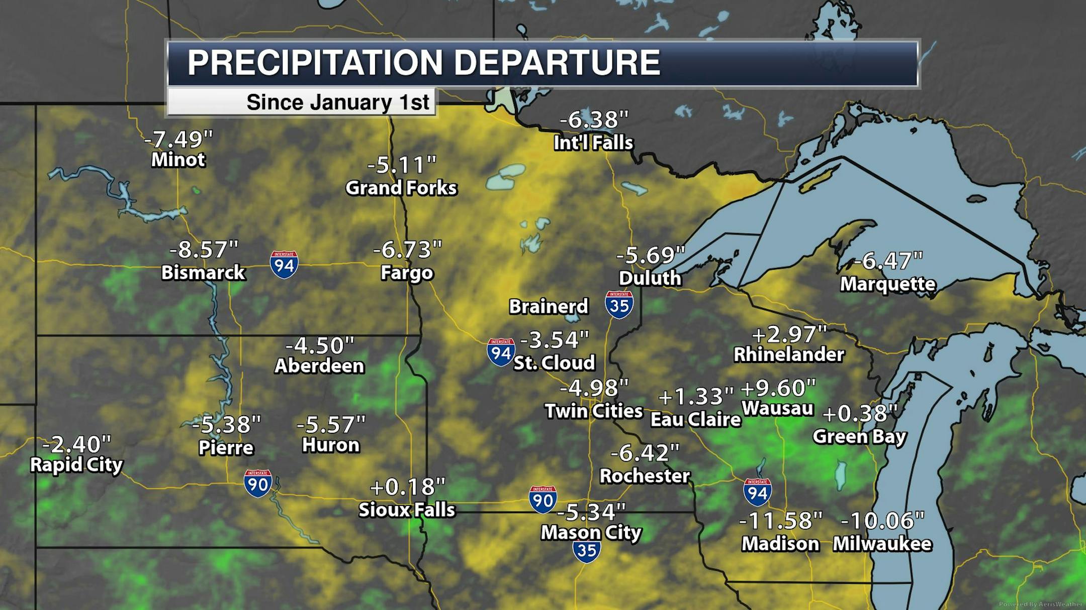 Here's a look at the precipitation departure from average since January 1st across the region and note that most locations are still several inches below average, including the Twin Cities. The metro is still nearly -5.00" below average since January 1st, which is the 55th driest January 1st - September 30th on record. Meanwhile, Wausau, WI is nearly +9.60" above average precipitation for the year and is sitting at their 3rd wettest start to any year on record.