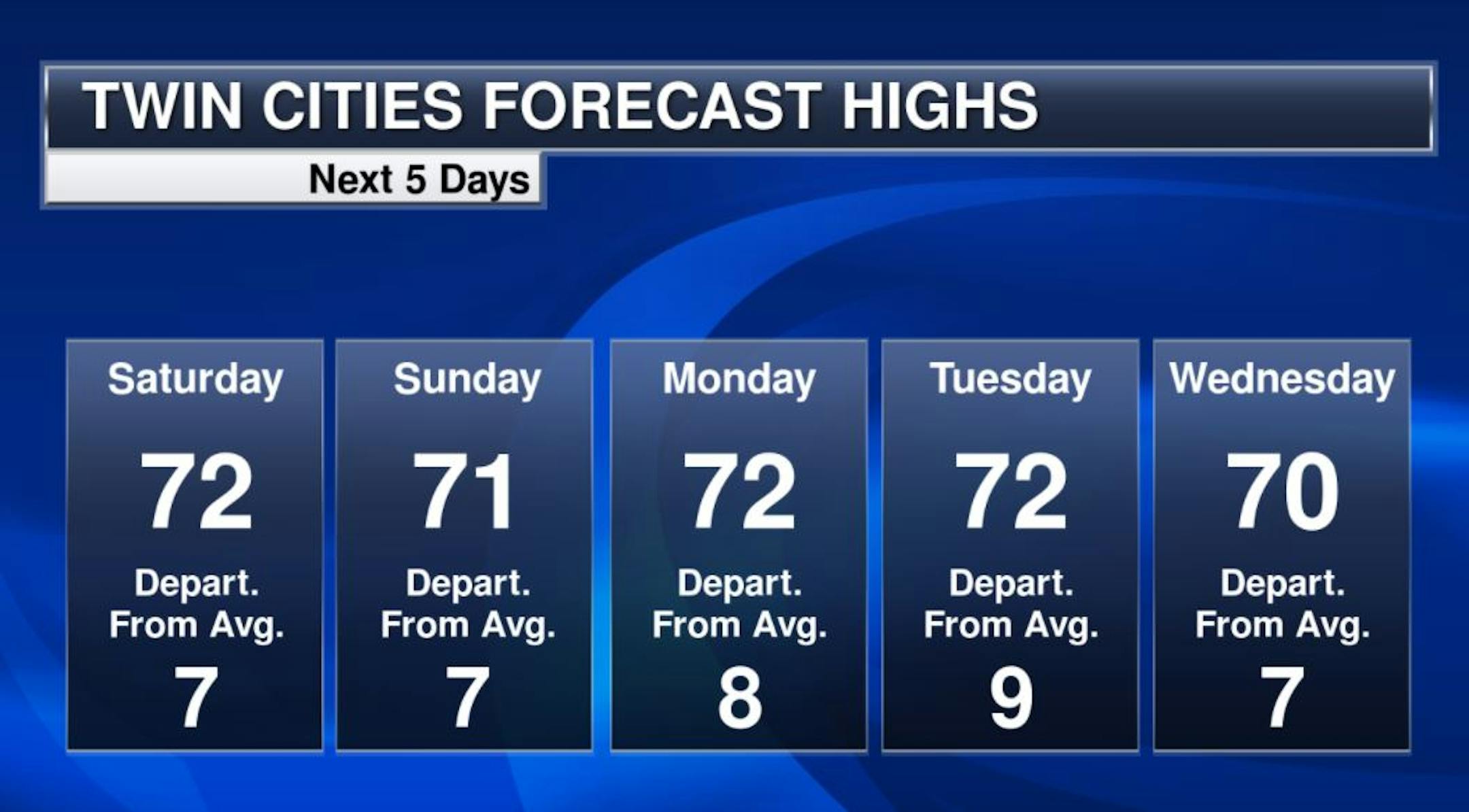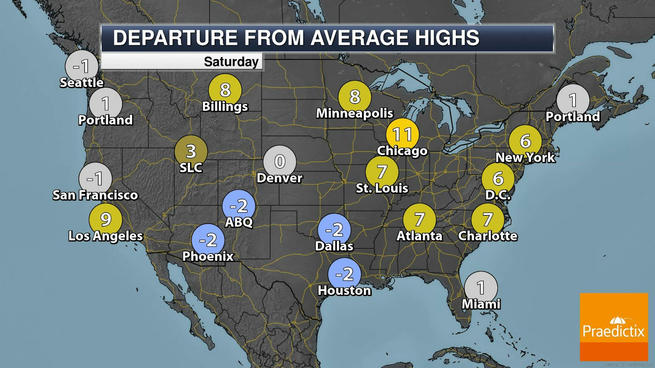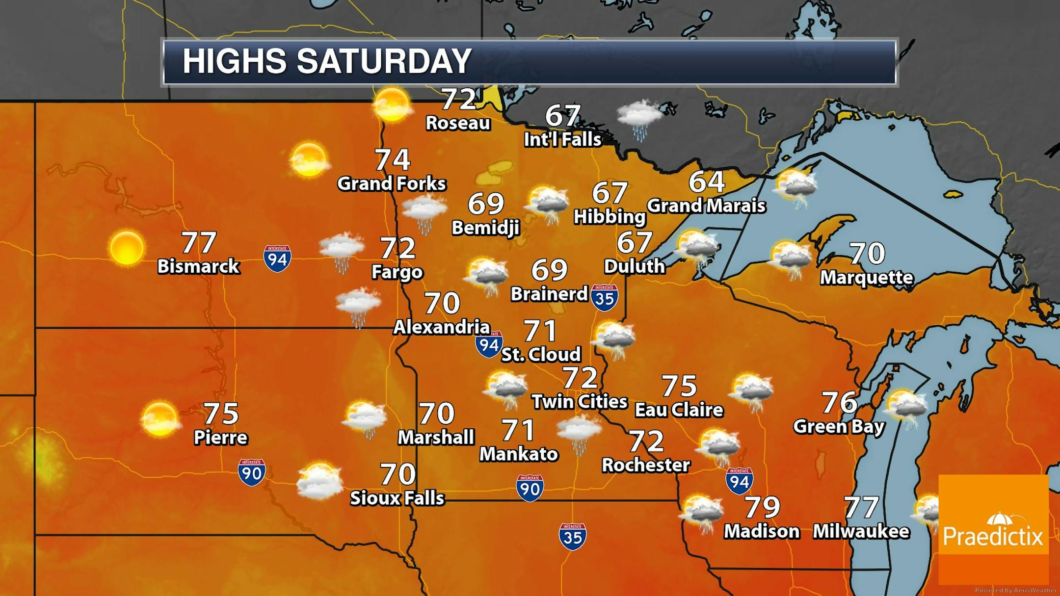 Highs on Saturday will be nearly +5F to +10F above average with readings warming into the upper 60s and lower 70s across the state. There will also be lingering showers and storms for some locations with pockets of locally heavy rainfall.