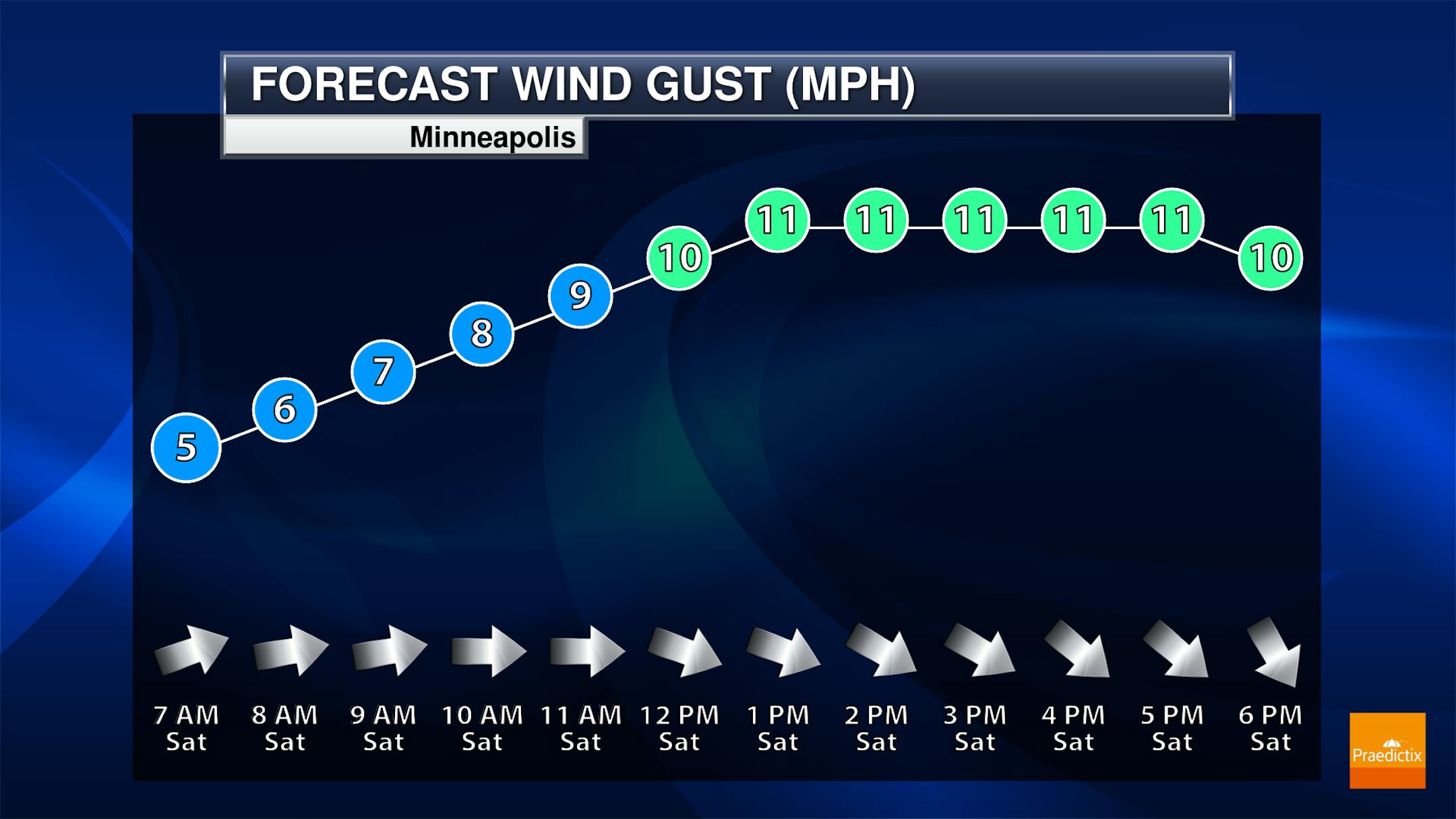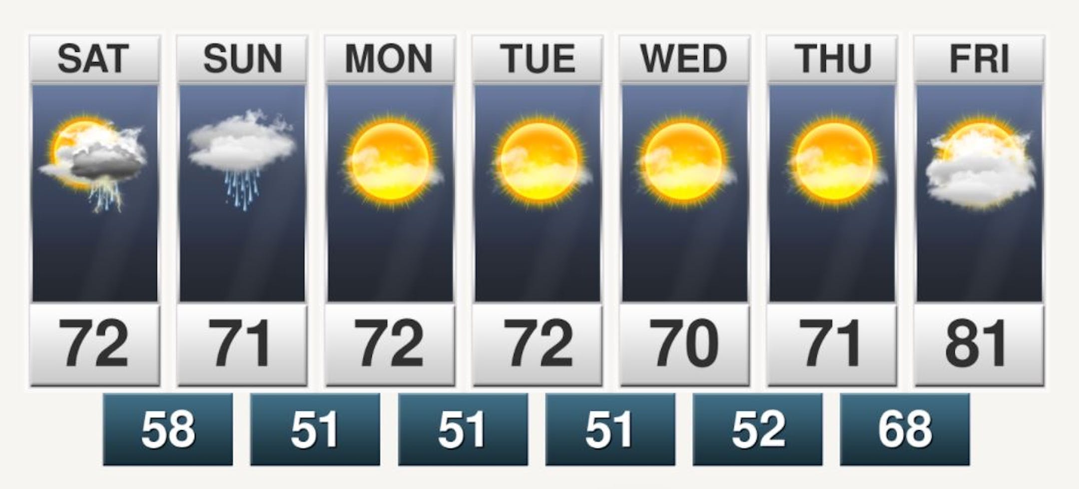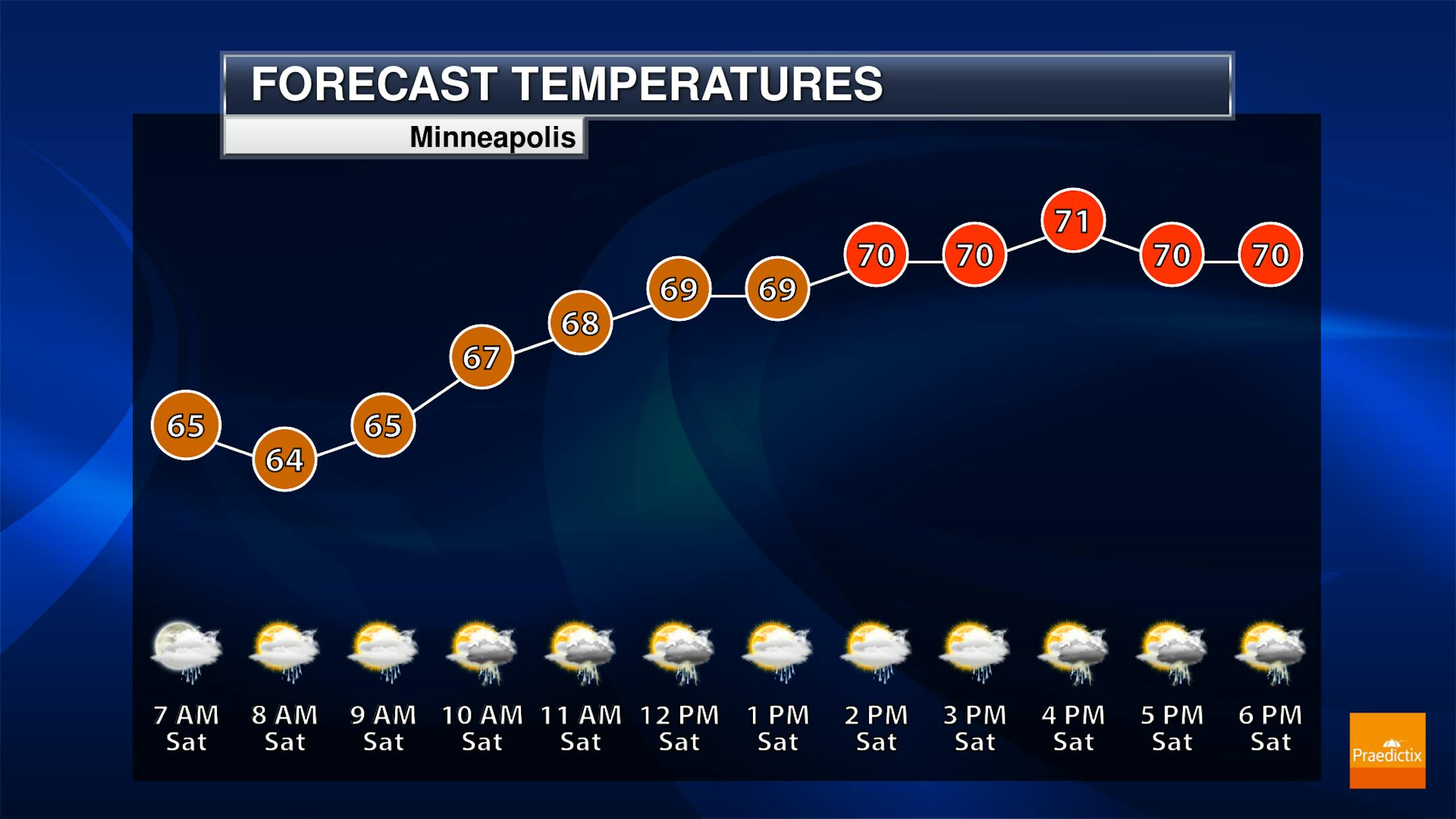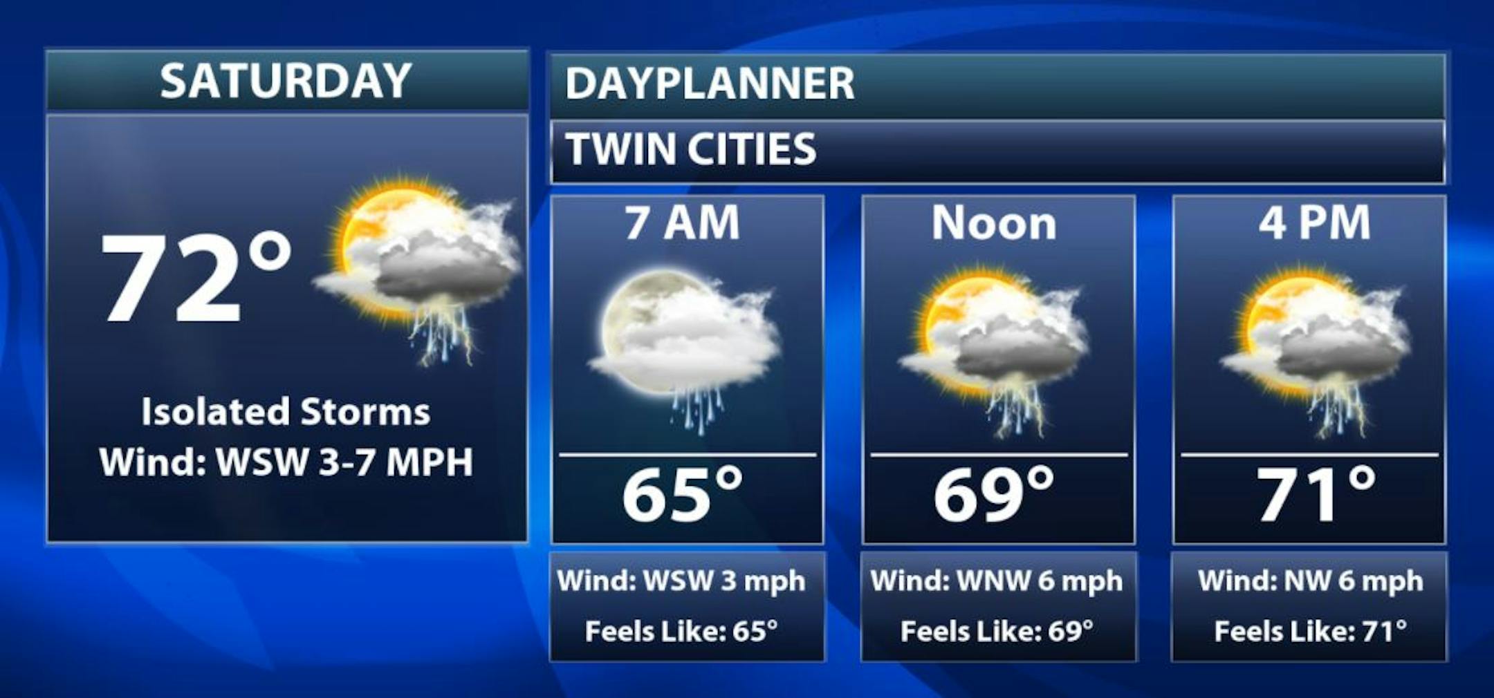 Weather conditions on Saturday will be a bit unsettled through the day with spotty showers and storms passing through the region. Temps will start in the mid 60s and will top out in the lower 70s. WNW winds will develop with gusts approaching 10-15mph at times.