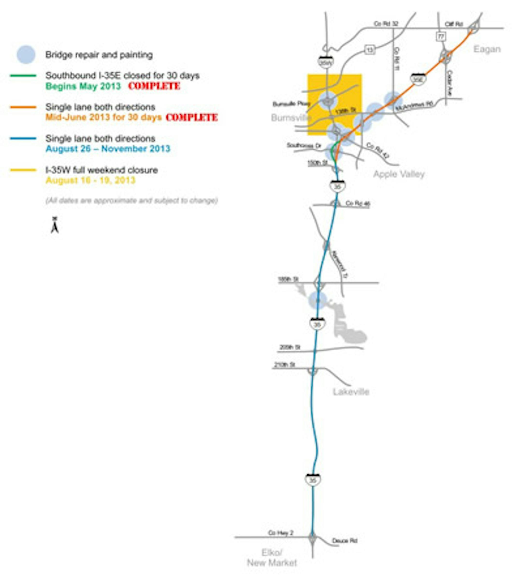 Starting on Sept. 23, the work zone will expand north to County Road 50. At that time, the ramp from 185th Street (County 60) to northbound I-35 will close. The ramp from northbound 35 to County 50 will be closed.