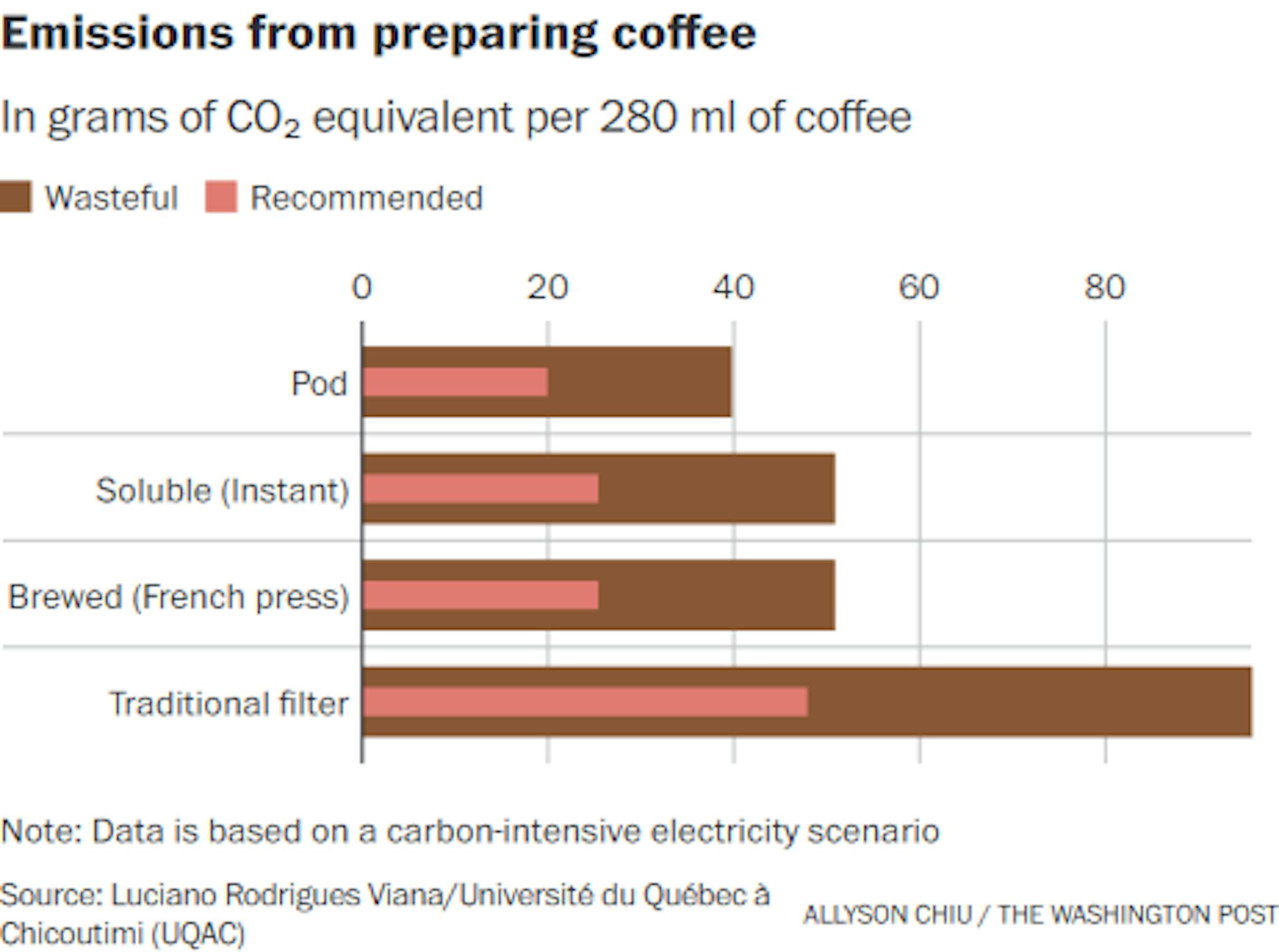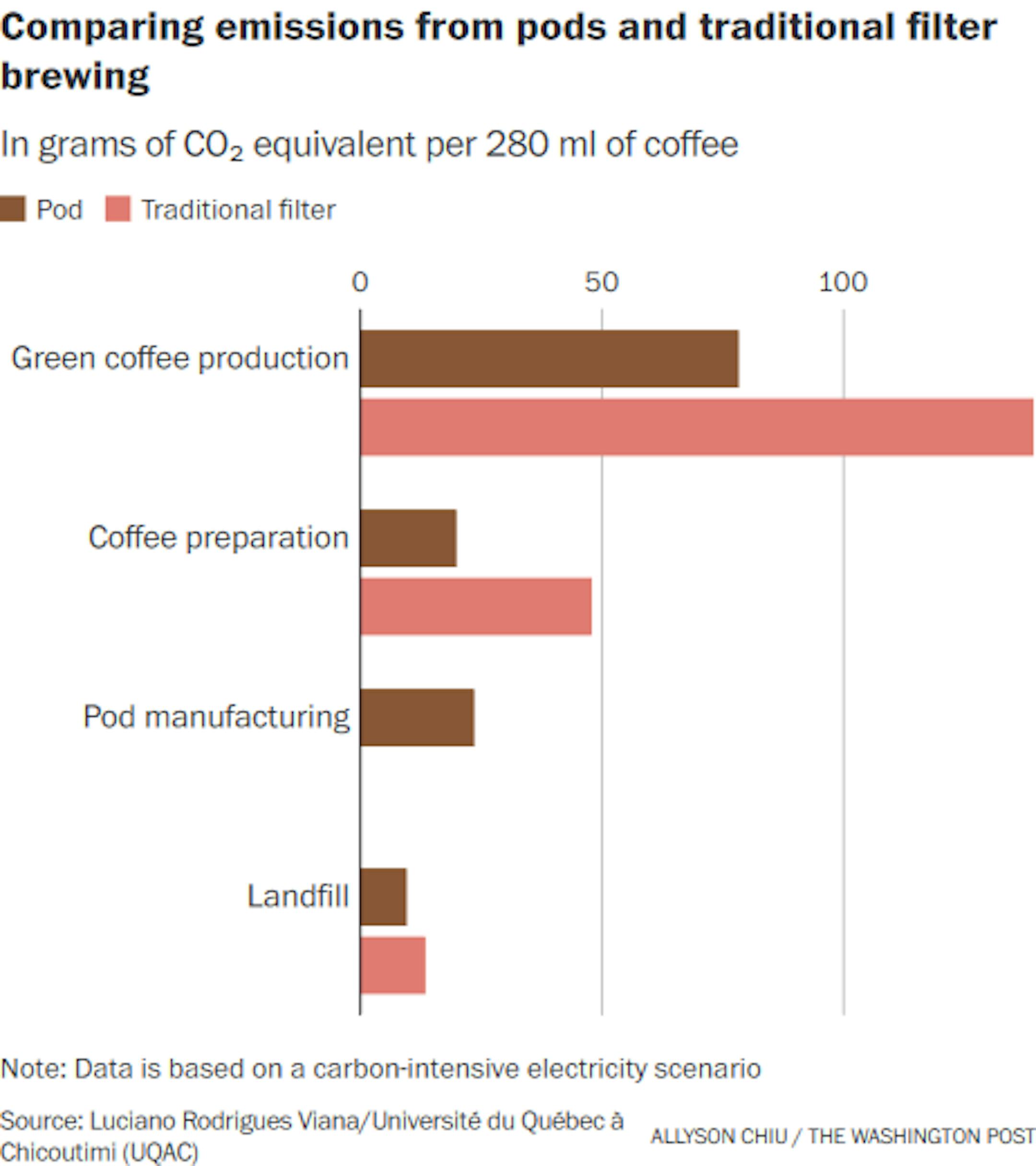 In some cases, brewing a cup of joe in an old-school filter coffee maker can generate roughly 1½ times more emissions than using a pod machine, according to an analysis by researchers at the University of Quebec at Chicoutimi in Canada.