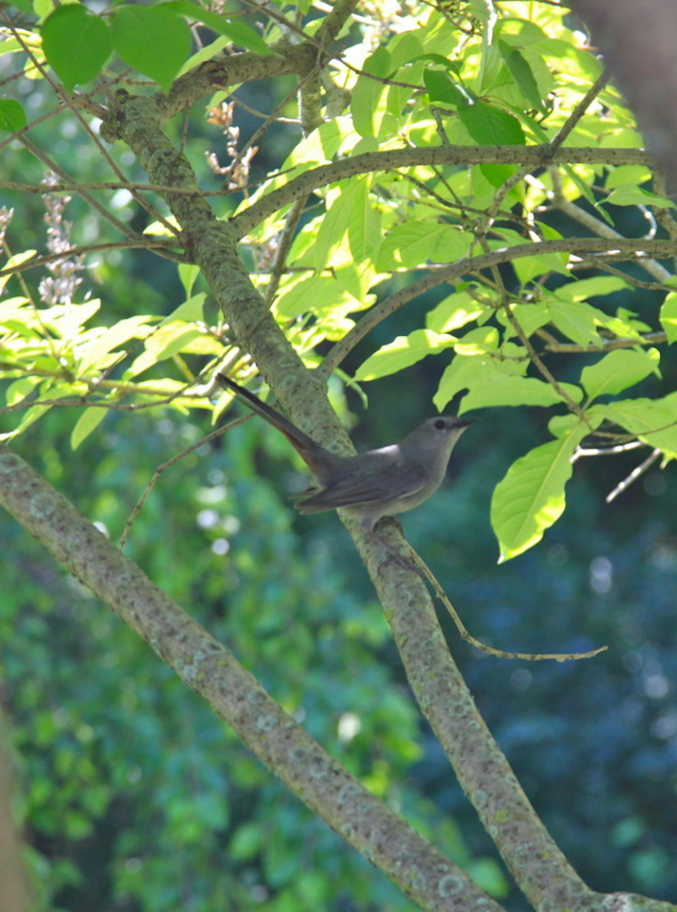 Turns out the tangled vegetation just beyond is the preferred nesting place of the Gray Catbird. More secretive, not as social as the robins, they are a steady presence in my garden announced by their frequent meows and burbling songs. As cousins to the mockingbirds they are capable of imitating other birds, frogs and even mechanical sounds. Astoundingly, their songs can last up to 10 minutes, trilling runs that even outdo Christina Aguilera.