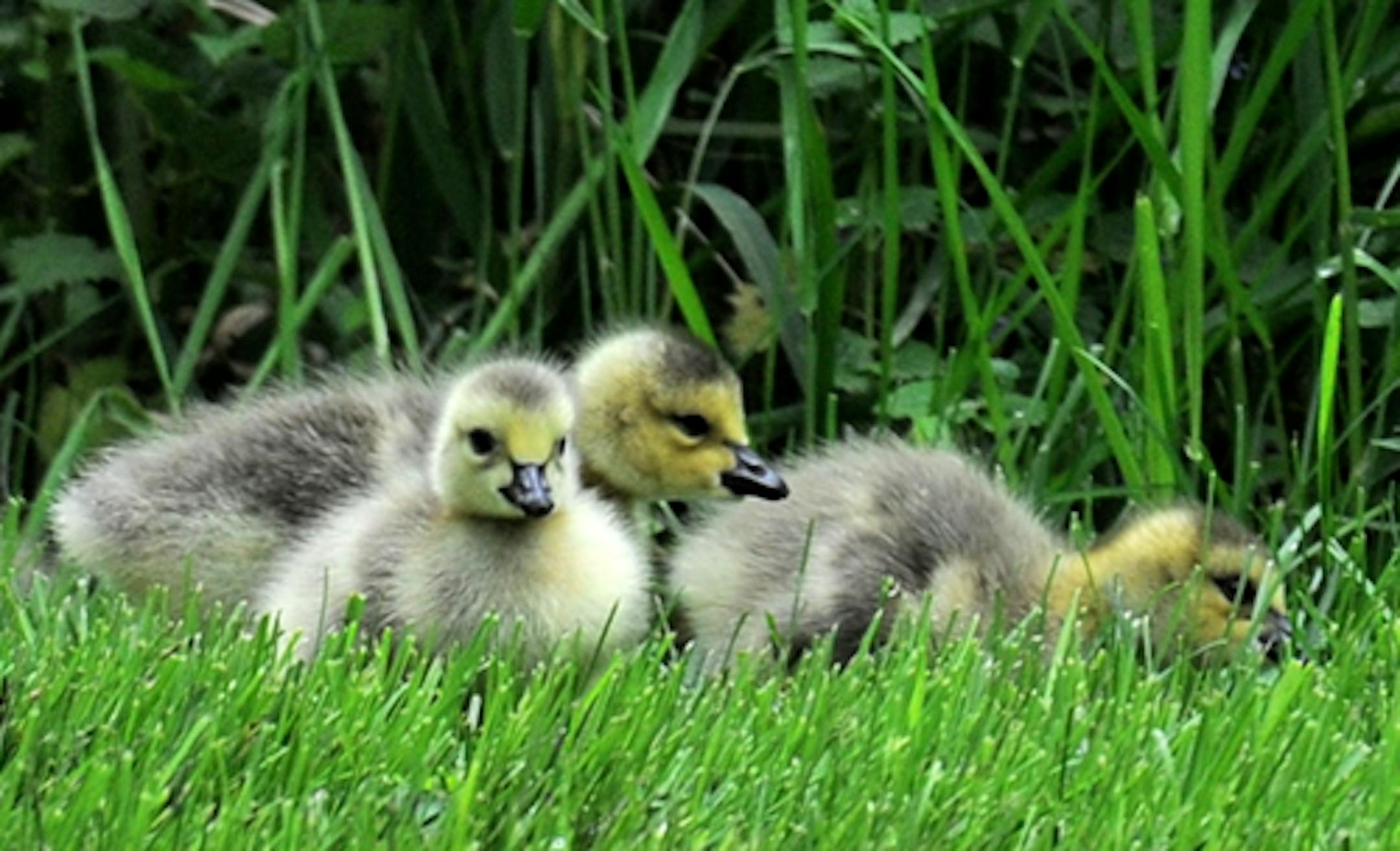 The pair of Canada Geese nesting on a platform in our pond brought six goslings ashore Monday morning. The goose gave up on incubation of a seventh egg. She kept at it for 36 hours beyond the appearance of the six that hatched. Strangely, while the egg was clearly visible in the nest during the birds' initial visit to our yard, it disappeared later in the day. I'm going to have to visit the nest to see if the goose buried it, pushed it into the water, or what else might have happened to it. The goslings were on land half a dozen times today to eat, meals of corn and sunflower seeds beneath our feeders alternating with next of greens and bugs along the pond shore. We have yet to see return of the Wood Duck and Hooded Merganser and their ducklings. I hope the geese stay here. They're fun to watch.