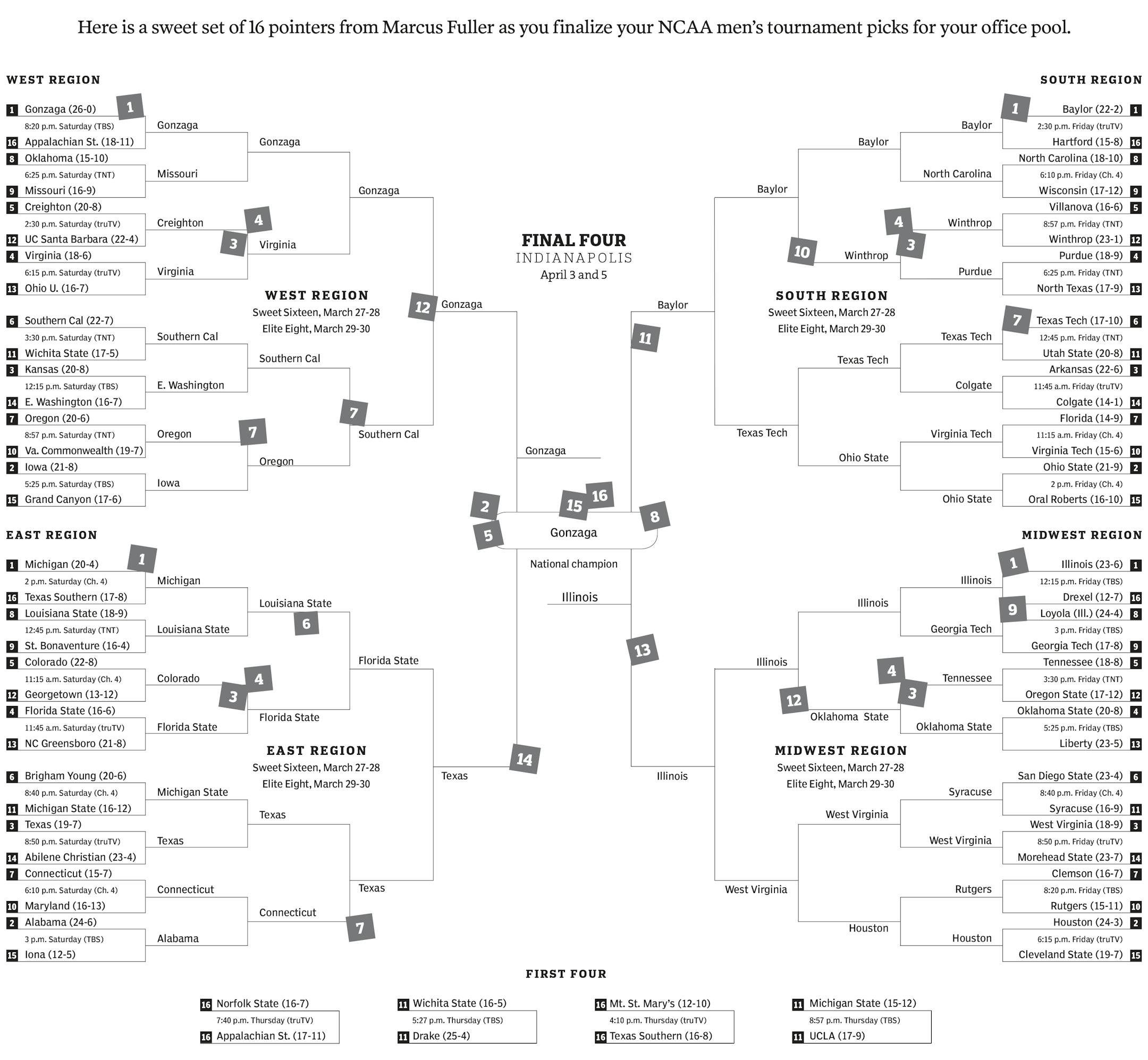 1. Let's start with the best teams. In 2011, zero No. 1 seeds made the Final Four, the only time that's happened in the past 13 years. That is not happening again this year. Gonzaga, Baylor, Illinois and Michigan all are solid Final Four picks. If you're looking to leave one out: The Wolverines are the most vulnerable not to make it from that bunch after senior leader Isaiah Livers suffered a foot injury in the Big Ten tournament.