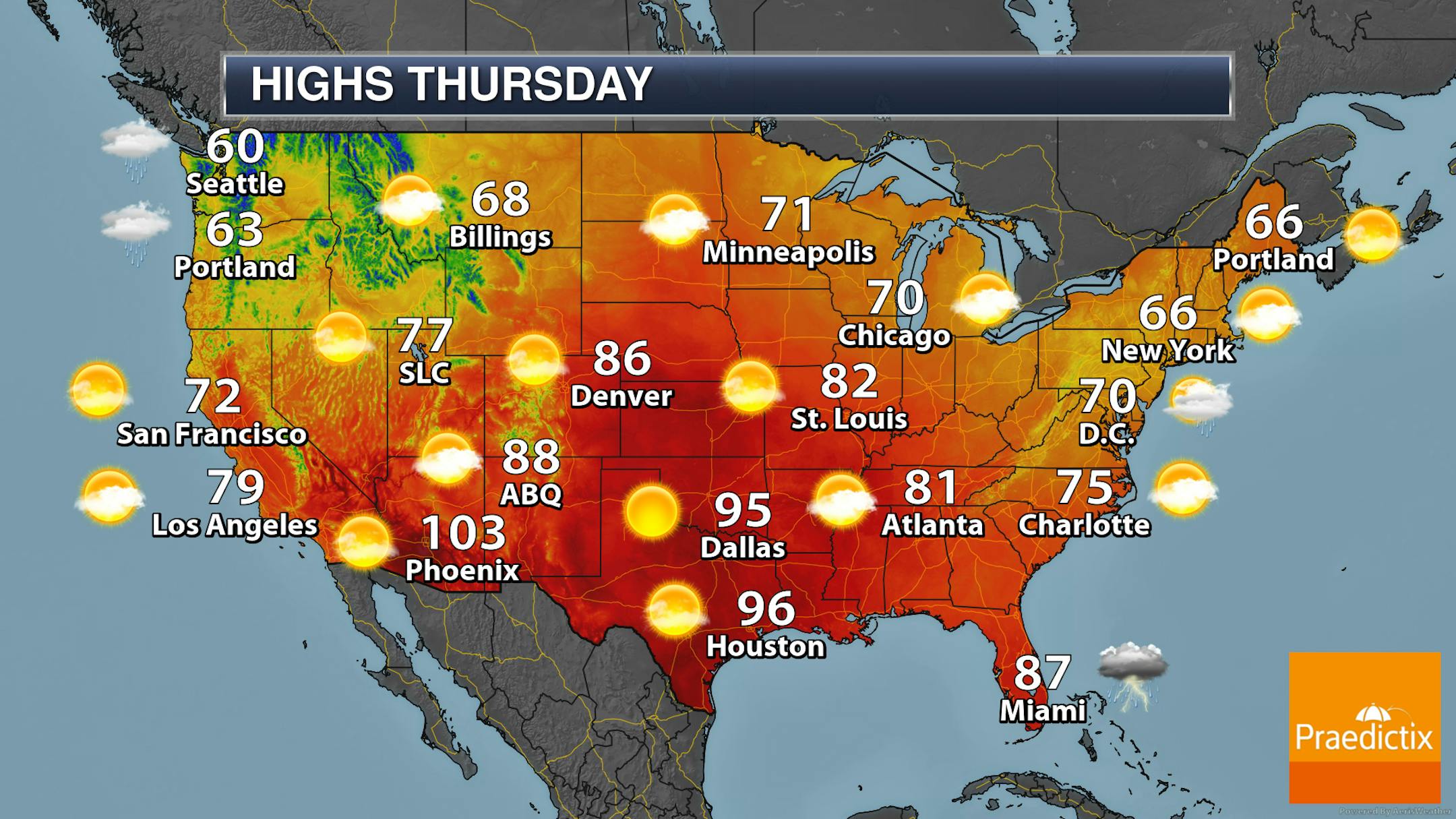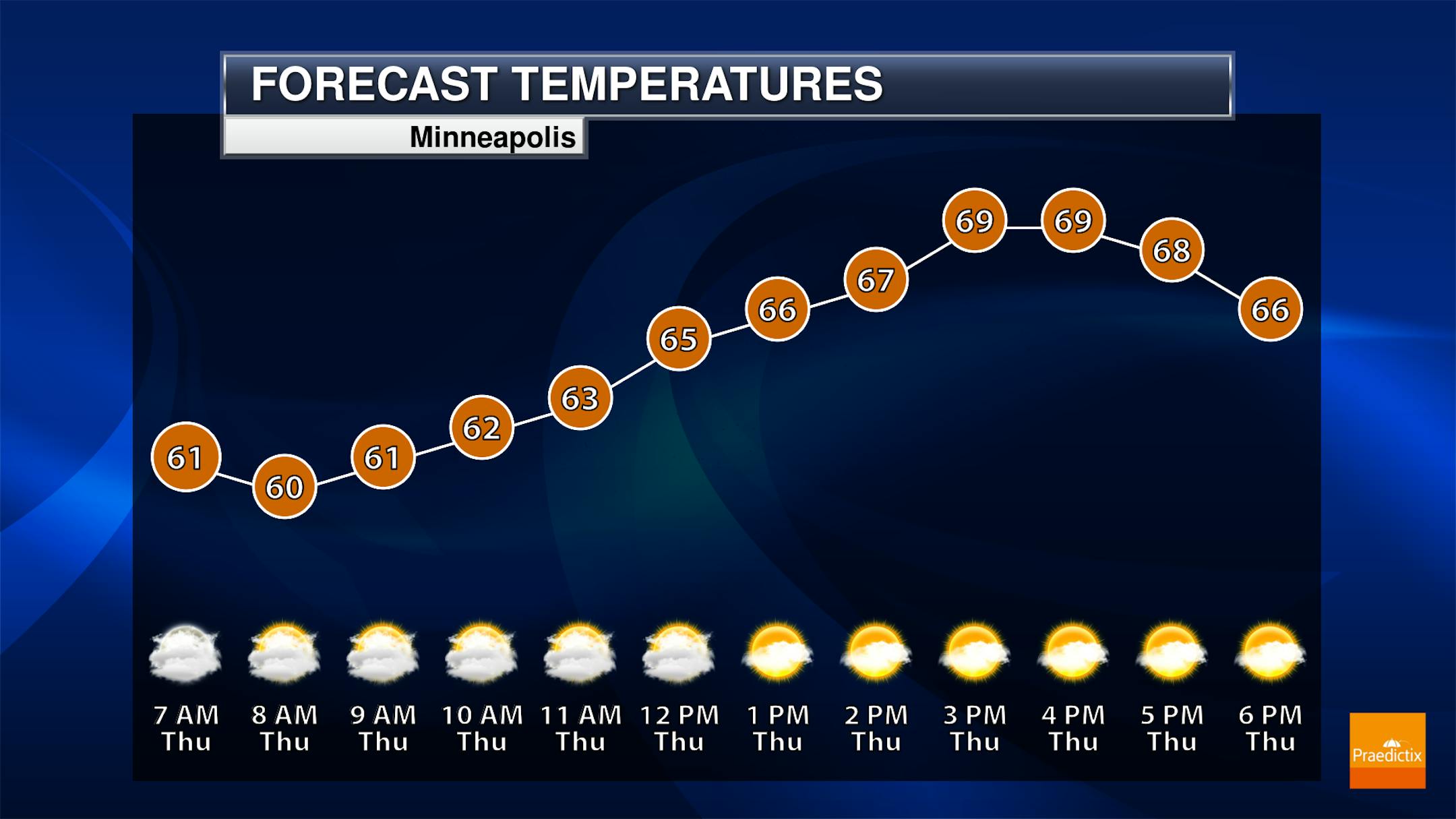 Thursday will be a day with slowly decreasing clouds in the Twin Cities - so cloudier conditions in the morning, with some sunnier peeks working in later in the day. Morning temperatures start off around 60F with highs in the low 70s - another day where it'll be nice to have the window open (at least most of the day).