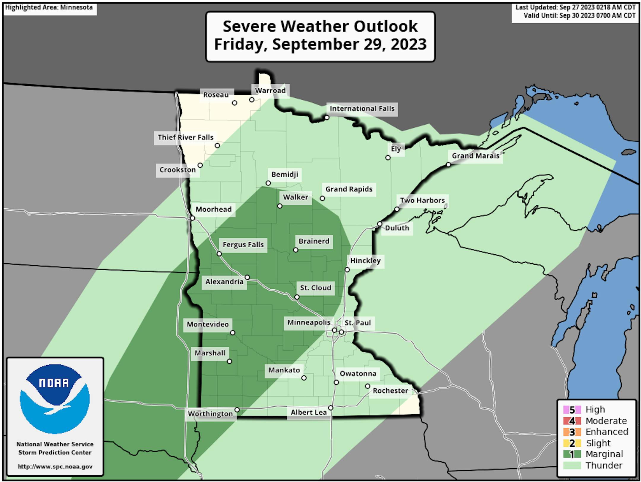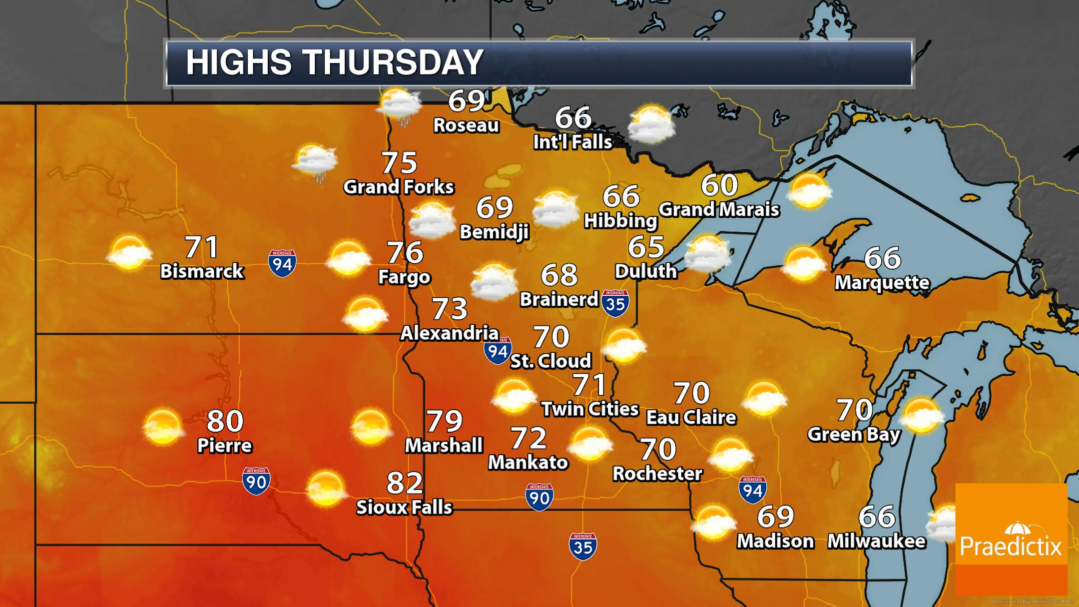 Another mainly cloudy day is expected across much of the state on Thursday, with the best chance of clearing skies into the afternoon hours across portions of southwestern Minnesota. Highs range from near 60F along the North Shore to near 80F in southwestern Minnesota where the longest period of sunshine occurs.