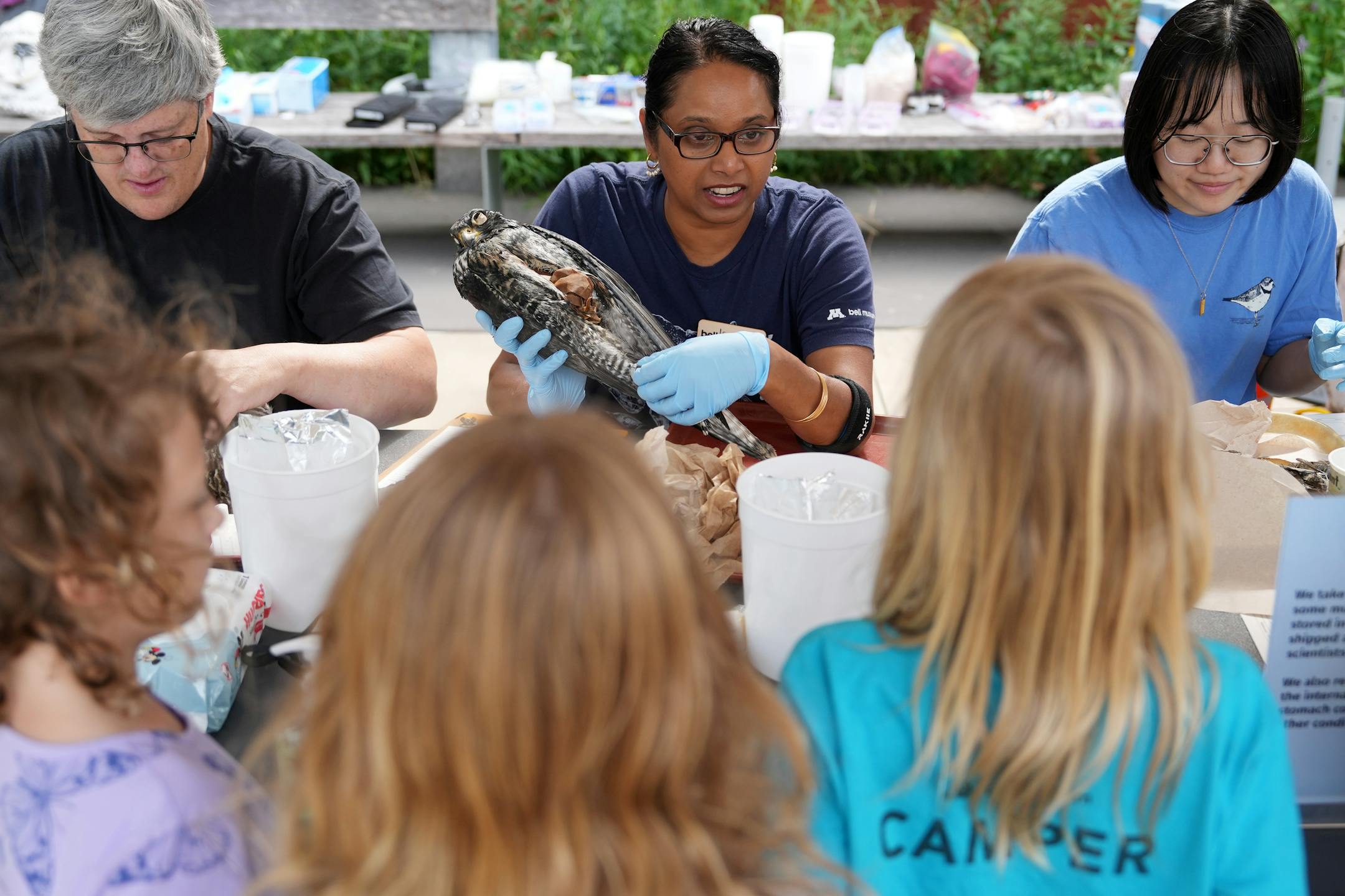 On Tuesday, the expedition opened with dissection of an otter, sending wafts of fishy odors onto the August breeze. More specimens on the table under the big tent this week include a swan, a groundhog and a porcupine. From Thursday to Saturday, the plant presentation will be replaced with a fish exhibition.