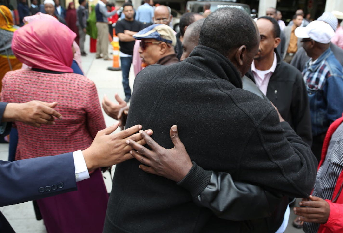 Abdirahman Mohamed, son of shooting victim Abdi Haji Mohamed Liiban, is consoled by community members. KYNDELL HARKNESS/STAR TRIBUNE