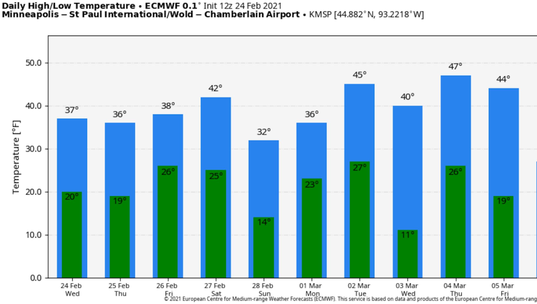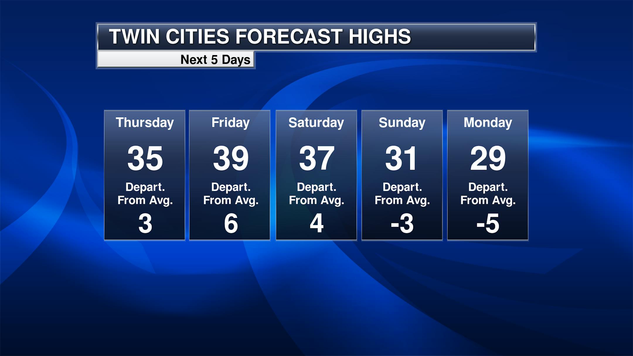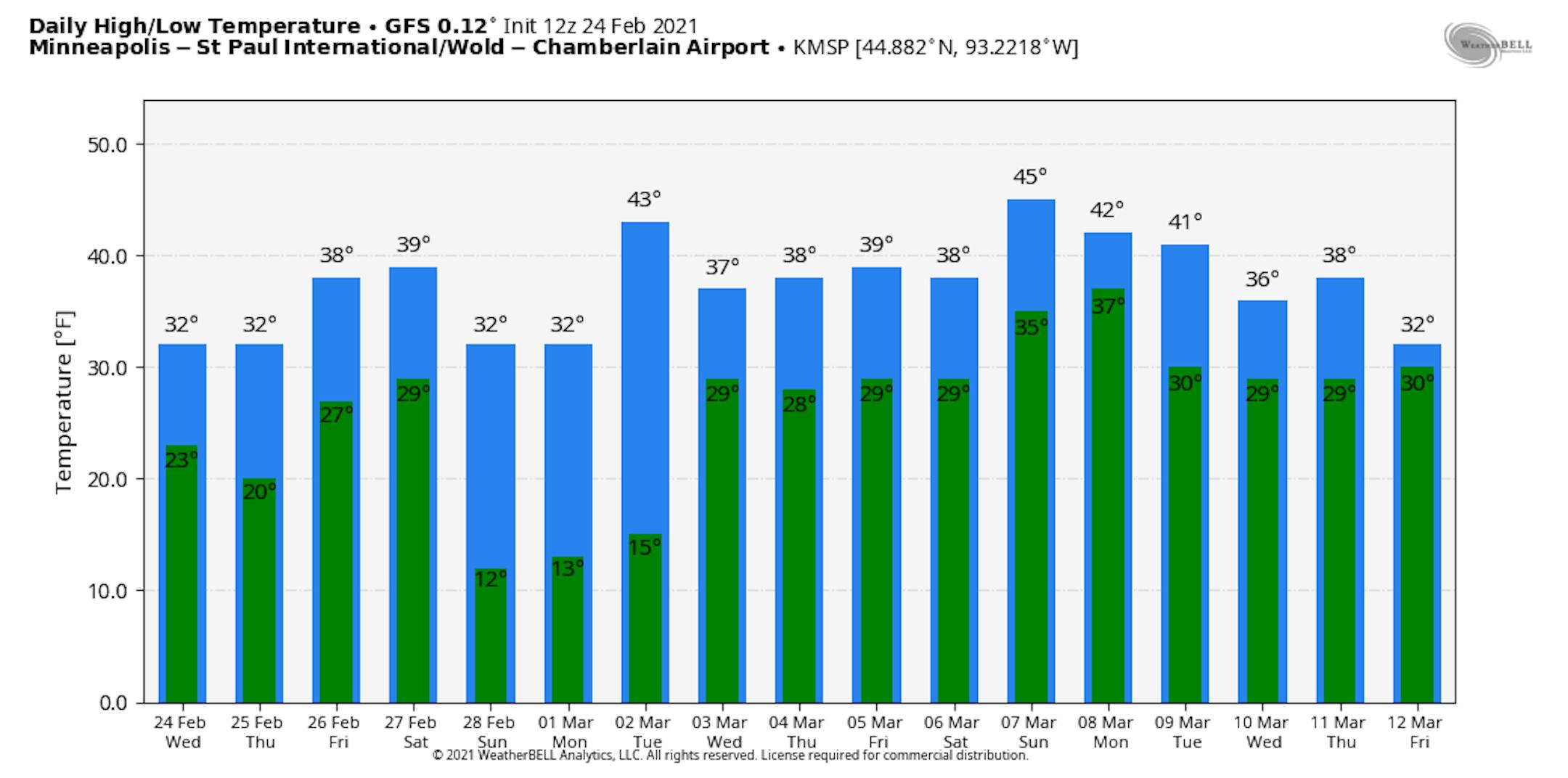Over the next few days, highs will remain above average in the Twin Cities in the mid to upper 30s. A cold front swinging on through Saturday will help knock temperatures back down to only around 30F for Sunday and Monday.