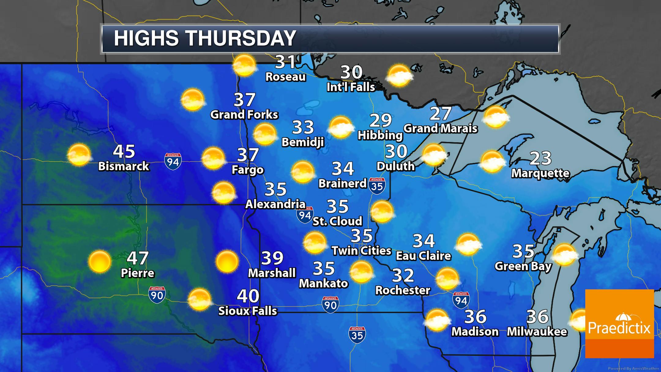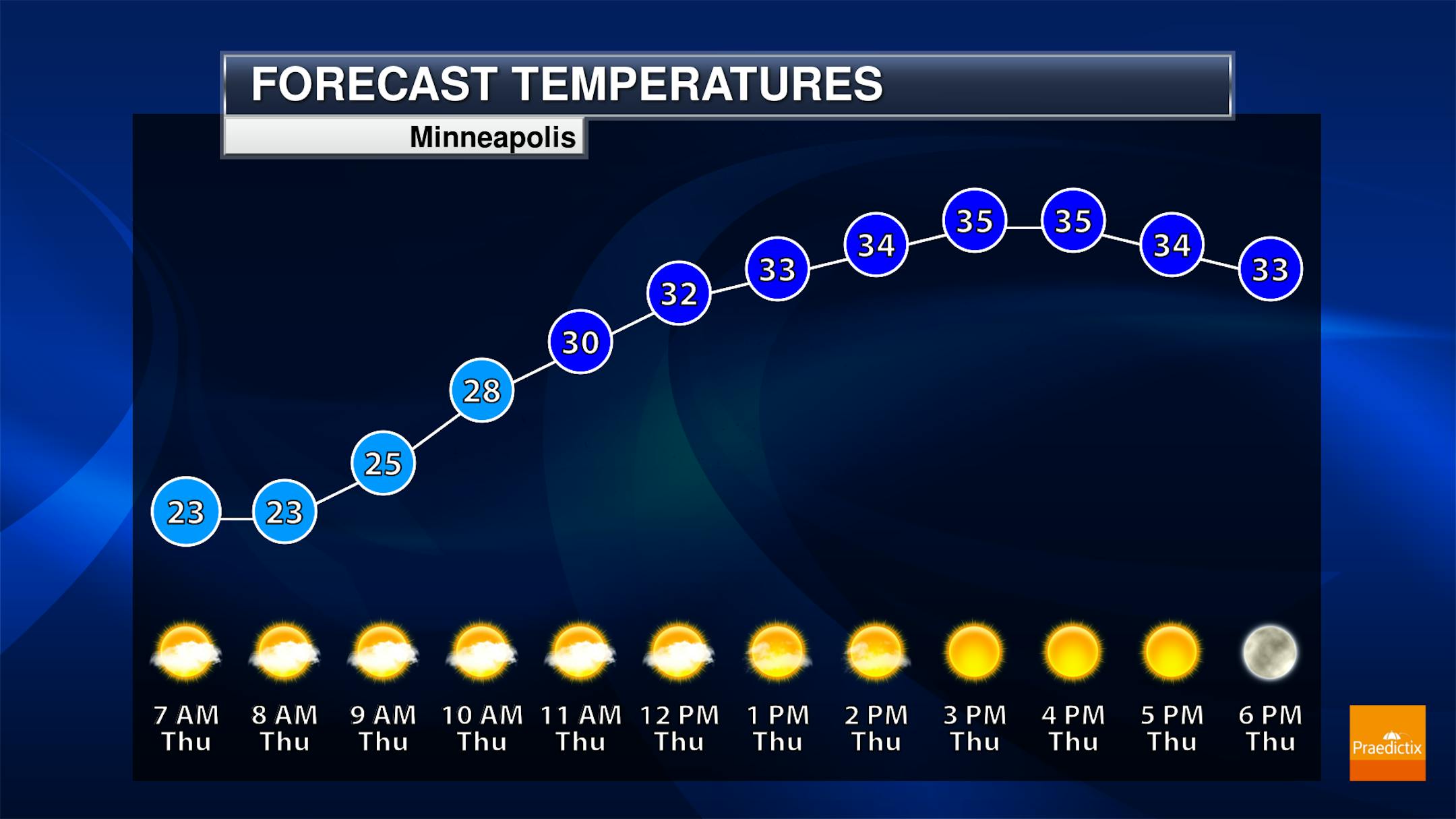 As we look statewide on your Thursday, partly to mostly sunny skies can be expected with highs climbing into the 30s in most locations. These highs will be up to 10F degrees above average out in western Minnesota, with near-average temperatures in eastern portions of the state and in western Wisconsin.