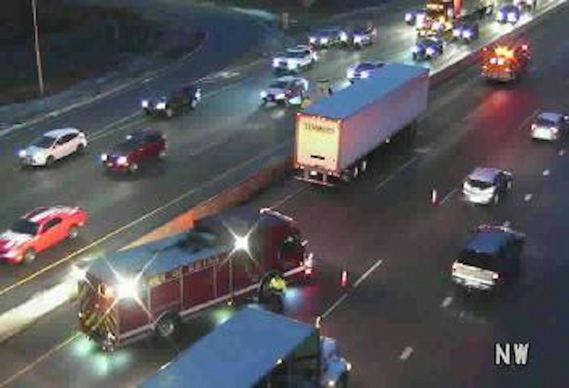 On Hwy. 100, a semitrailer truck smashed into the center median wall on northbound Hwy. 100 at 70th Street in Edina. The wreck occurred just after 7 a.m., but the effects are still being felt more than an hour later. Both sides of the highway are impacted and it's 45 minutes from I-94 down to I-494 at 8:30 a.m.