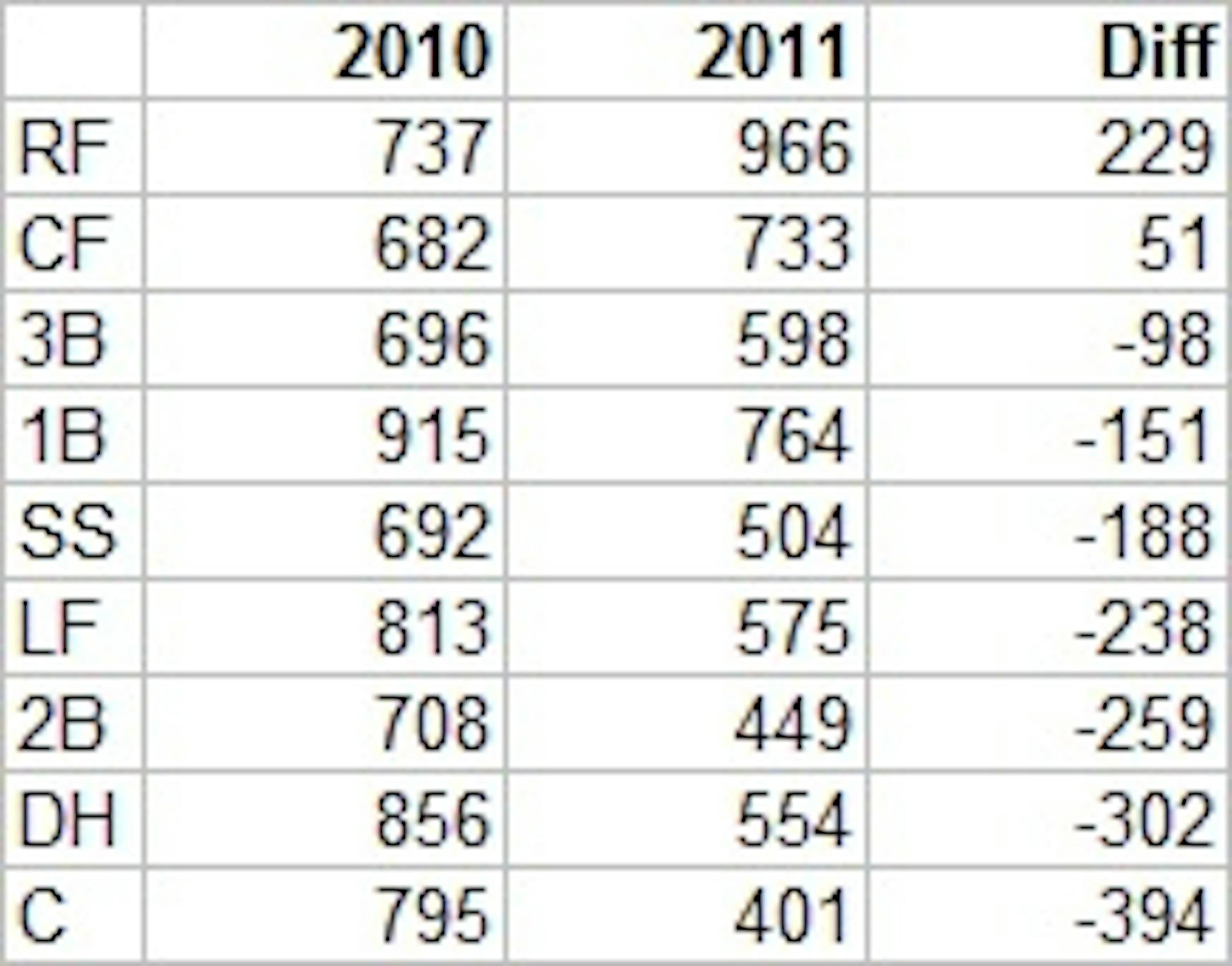 I watch the games. I can read the stats. I've seen the ineptitude and the disabled list and the standings and the anger. I've seen that it isn't just that they're losing, it's how they're losing. And still, I keep coming back to: 94 wins. That's how many wins the Twins had last year, and this is essentially the same team. The rotation is almost exactly the same. The lineup, except for a couple of middle infielders, is the same. The bullpen is not, but the bullpen hasn't been a huge problem. So how has this team gone from a team that legitimately won 94 games last year to a team that looks THIS hapless. Let's see if we can find out. We'll start with the offense today…. Last year's Twins team ranked 5th in the American League in offense, scoring 781 runs, or 4.82 per game. This year's Twins team ranks last with 85 runs, which is an average of just 3.15 per game. At that rate, the Twins would score 270 runs less than last year. It would also be slightly less than Seattle's impotent offense last year, which was damn near historical, and one hundred runs less than any other American League team. But the makeup of the offense hasn't changed that much from last year. The only regulars missing are JJ Hardy, who ranked 10th in Runs Created on the team, and Orlando Hudson, who ranked 8th. Together, those two were worth about 105 runs – and some of those should be made up by Casilla and the mix of second basemen. So what's going on? Certainly injuries are part of the problem. The Twins top two offensive producers last year (again, using Runs Created) were Delmon Young and Joe Mauer – and they're both out right now. Justin Morneau, despite missing half the season, was also a huge run producer, accounting for 75 runs, good for 5th on the team, and he's missed time this year, too. Jim Thome has also been out for almost a week and ranked seventh last year. Add up those four guys, and they were responsible for about 325 runs last year. That's some big time pain. But on top of that, all those guys, and several more, are really struggling. The stories stack on top of each other when you look at how each position is hurting OPS by position: