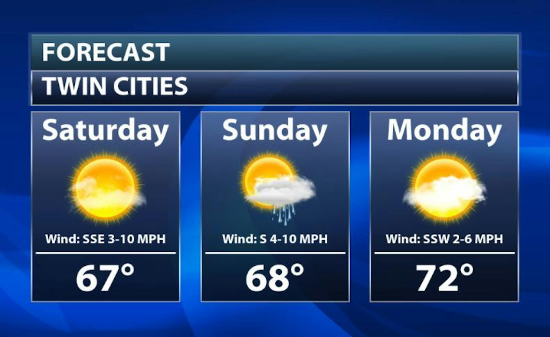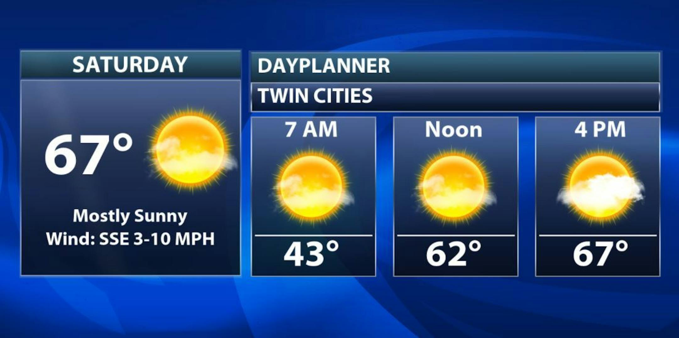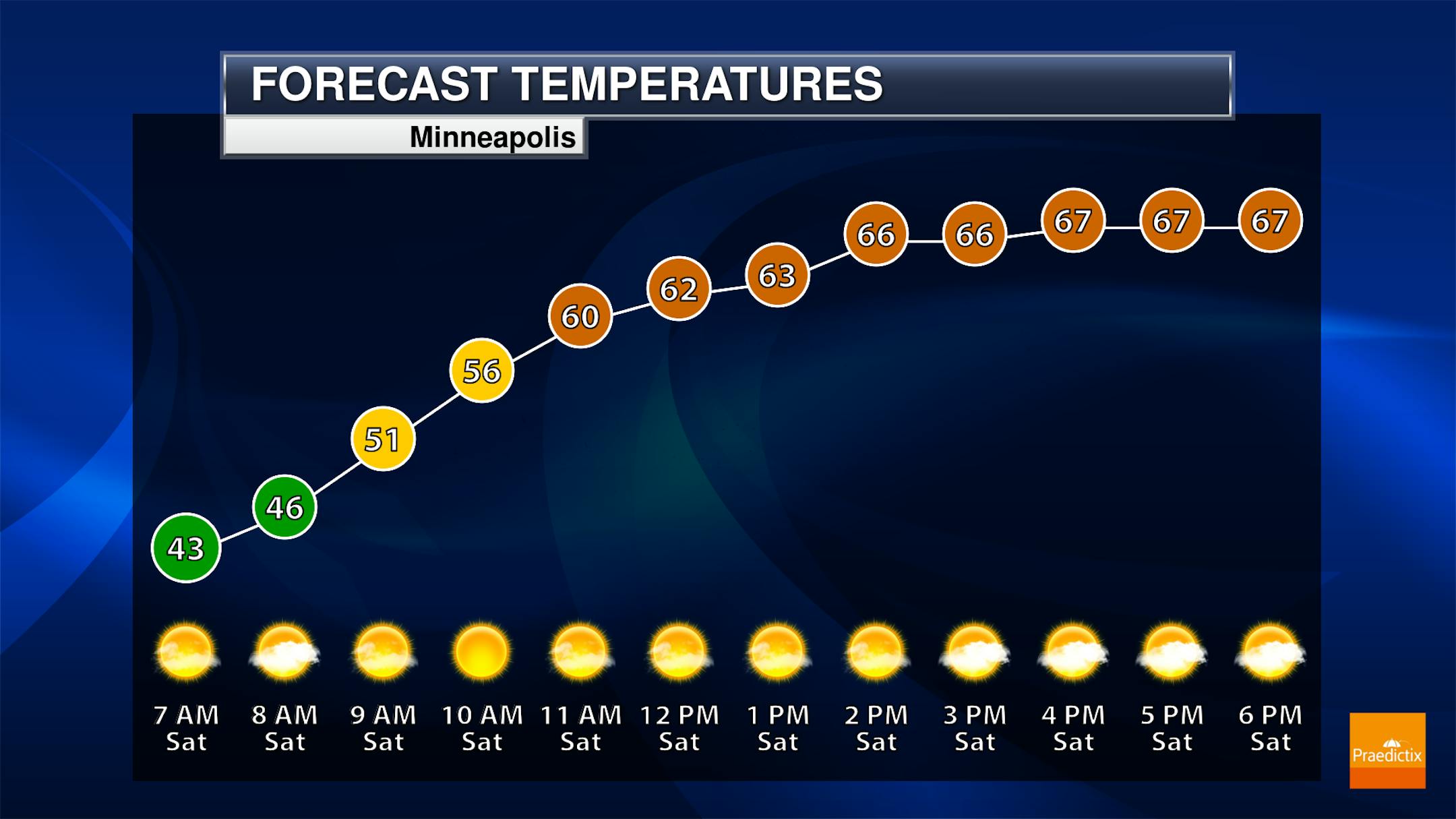 The meteograms for Minneapolis on Saturday shows temps warming from the lower 40s early in the morning to the mid/upper 60s by mid/late afternoon. It'll be mostly sunny to start with more clouds building in later in the day. South to Southeasterly winds could gust up 15mph to 20mph at times during the afternoon.