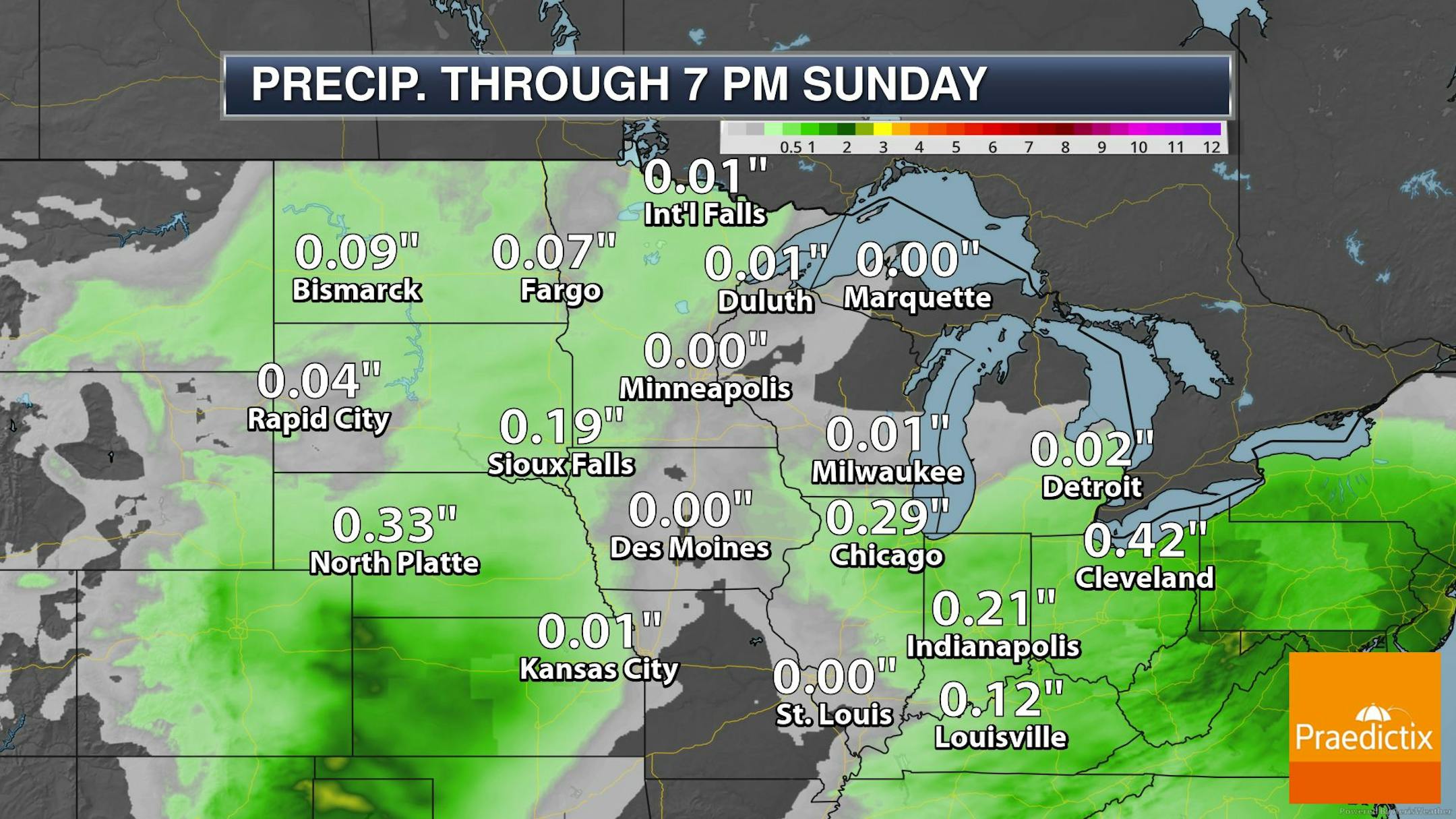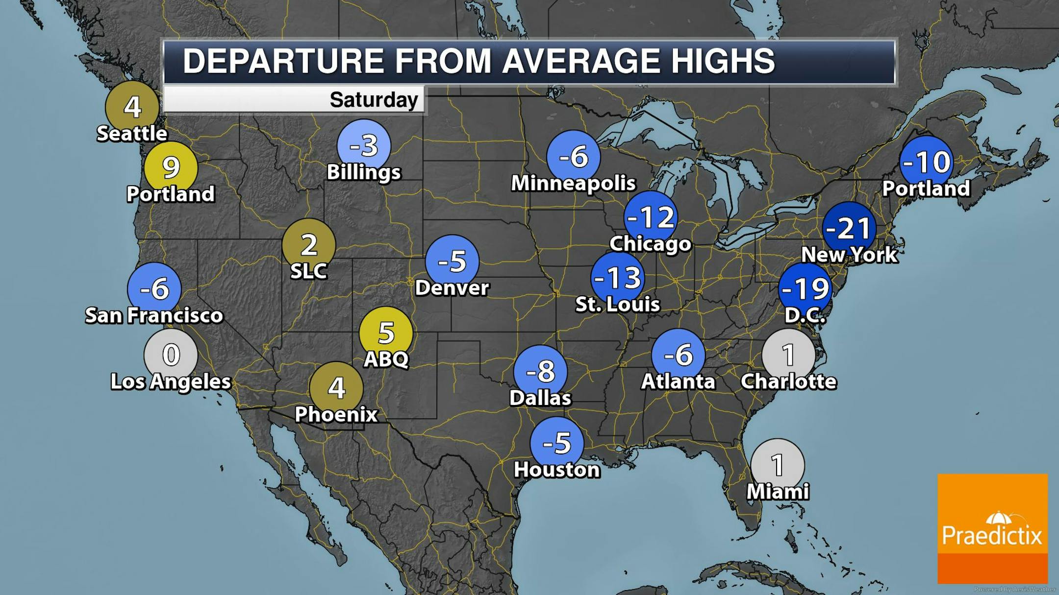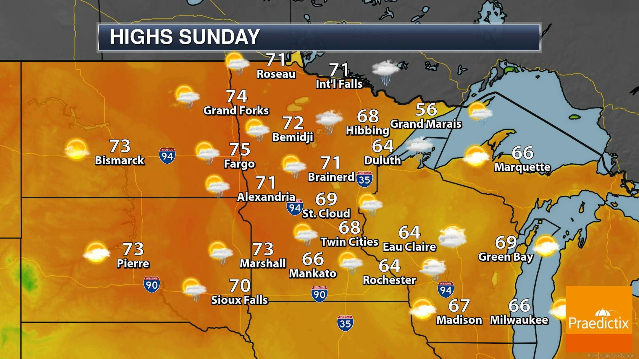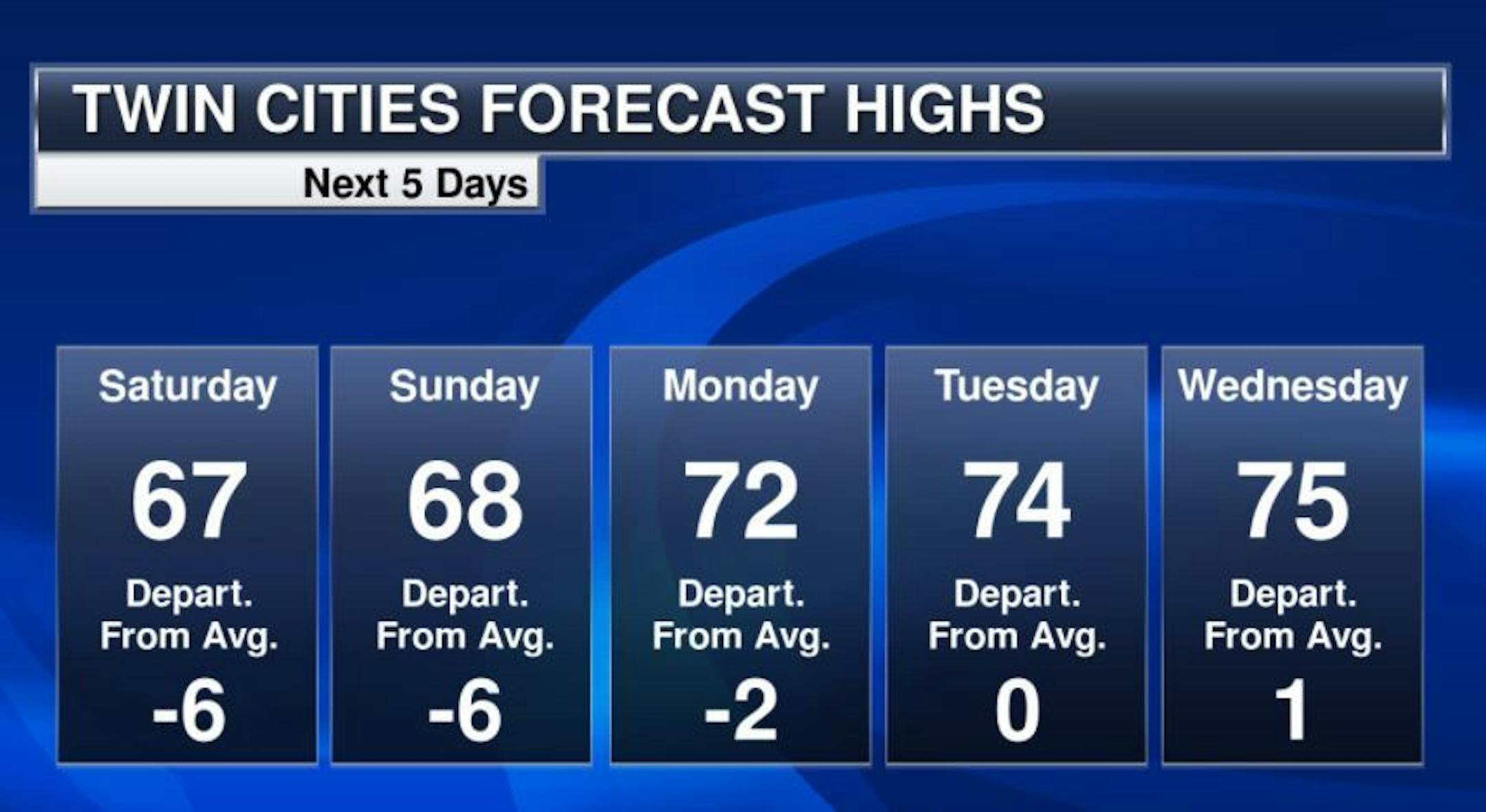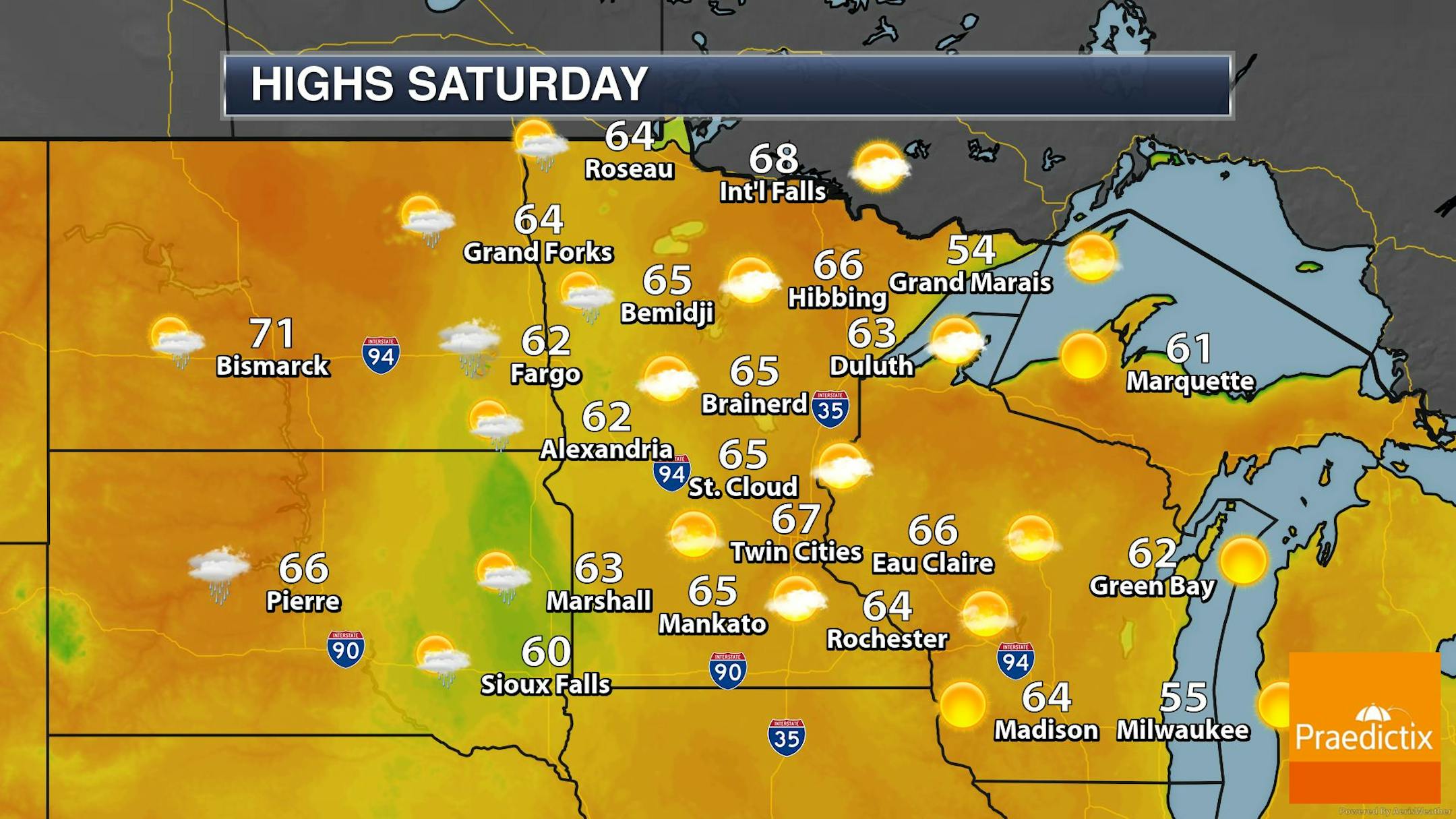 The weather outlook across the region on Saturday show temps warming into the 60s across the state, which will be nearly -5F to -10F below average. There is a chance for a few showers across the eastern Dakotas and western MN later in the day, which may hold temps back just a bit.