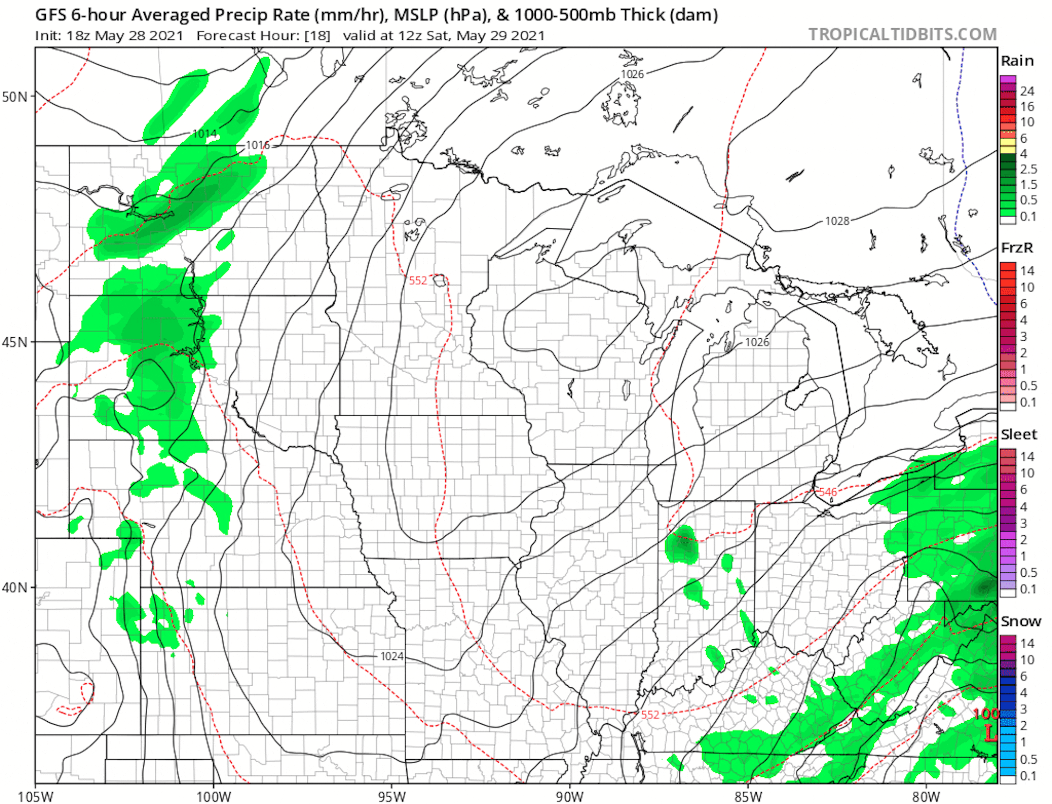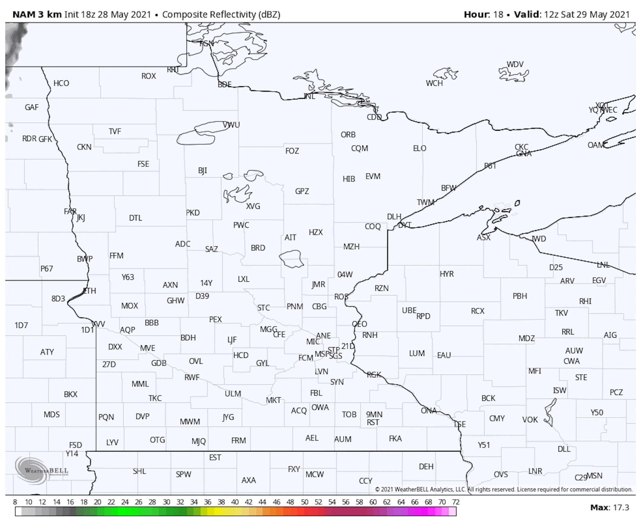 The weather outlook for the Twin Cities on Saturday shows mostly dry and quiet weather in place through much of the day. Temps will be running about -5F to -10F below average, with chilly temps in the morning. Rain chances should hold off until late Saturday and Saturday night.