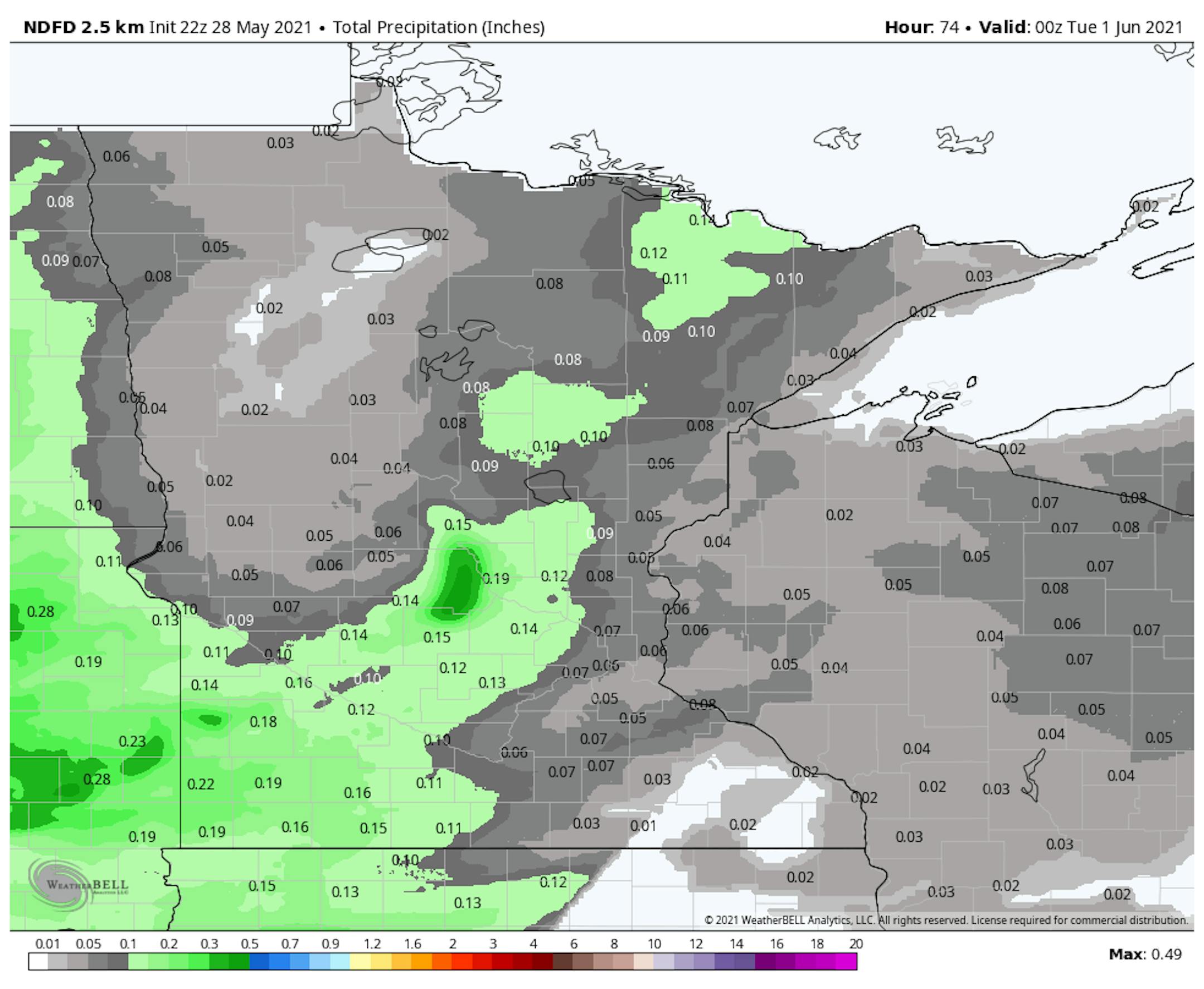 The rainfall potential through AM Monday shows up to a couple of tenths of an inch across parts of central and western Minnesota with isolated heavier amounts possible in any thunderstorms that develop across the region. The good news is that it won't be a washout this weekend, but there could be a few cool and showery periods mixed in at times over the next few days.
