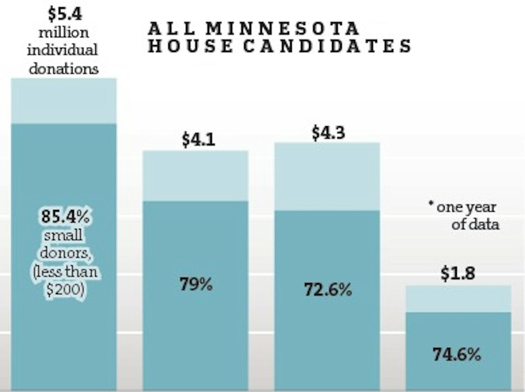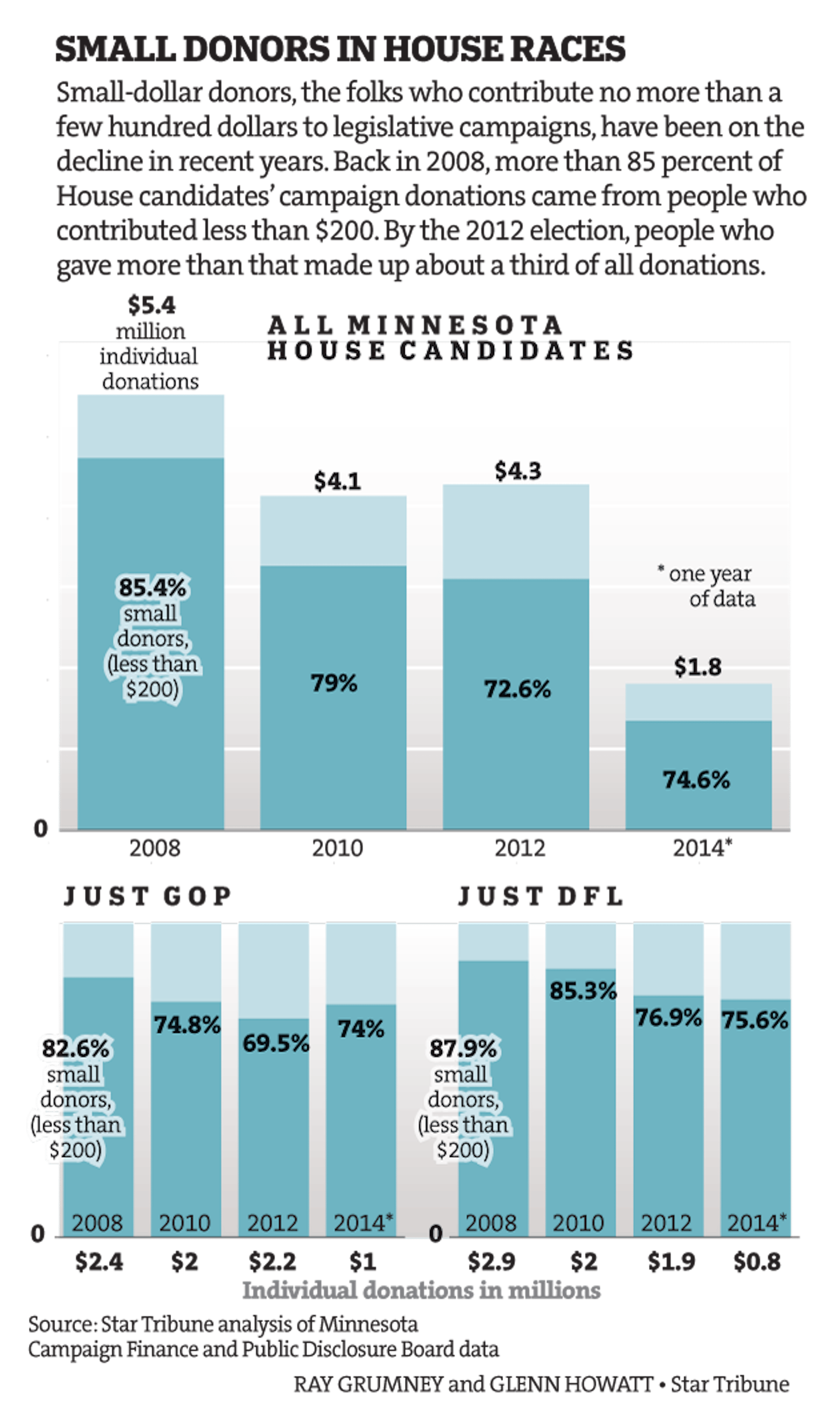Small-dollar donors, the folks who contribute no more than a few hundred dollars to legislative campaigns, have been on the decline in recent years. Back in 2008, more than 85 percent of House candidates' campaign donations came from people who contributed less than $200. By the 2012 election, people who gave more than that made up about a third of all donations.