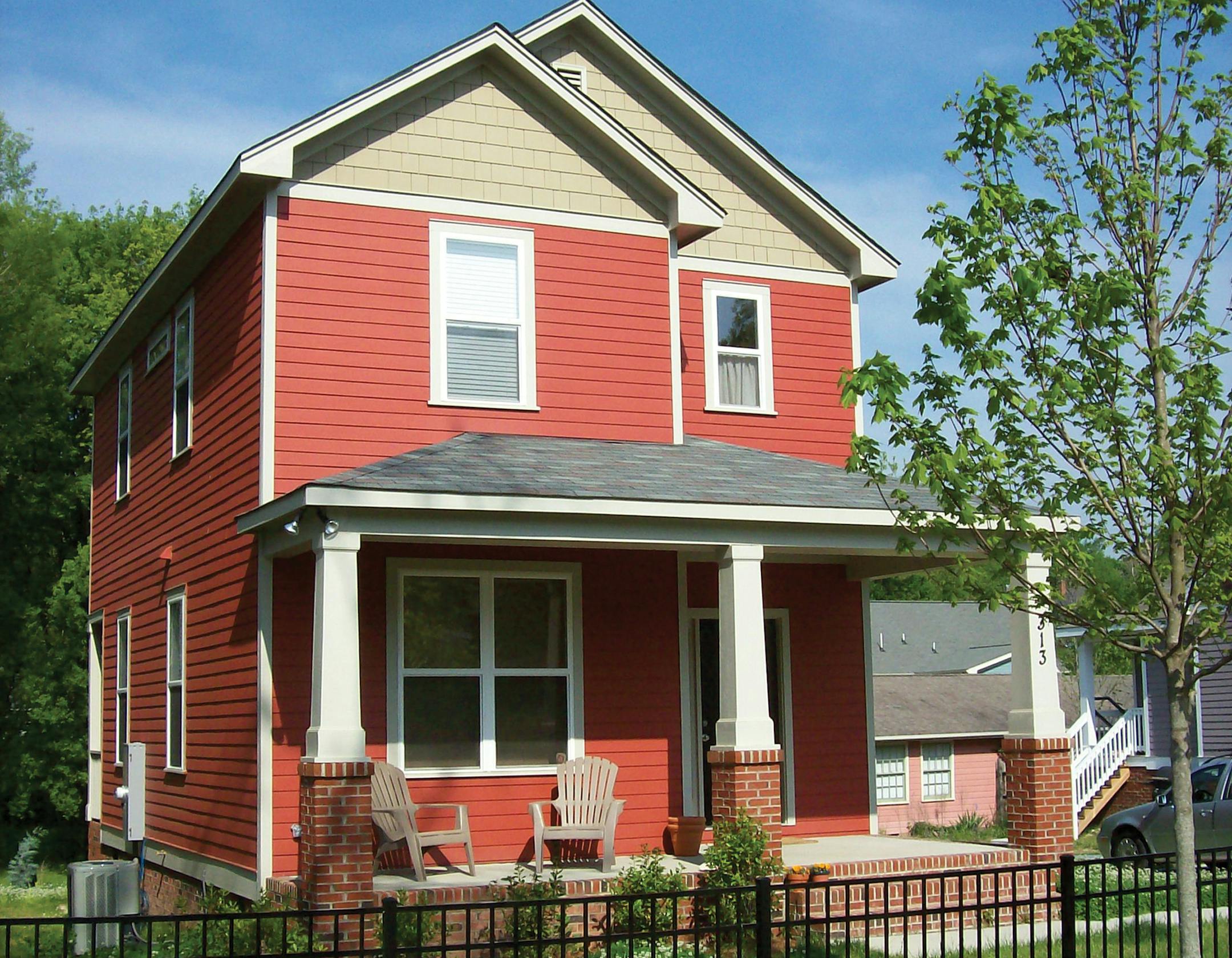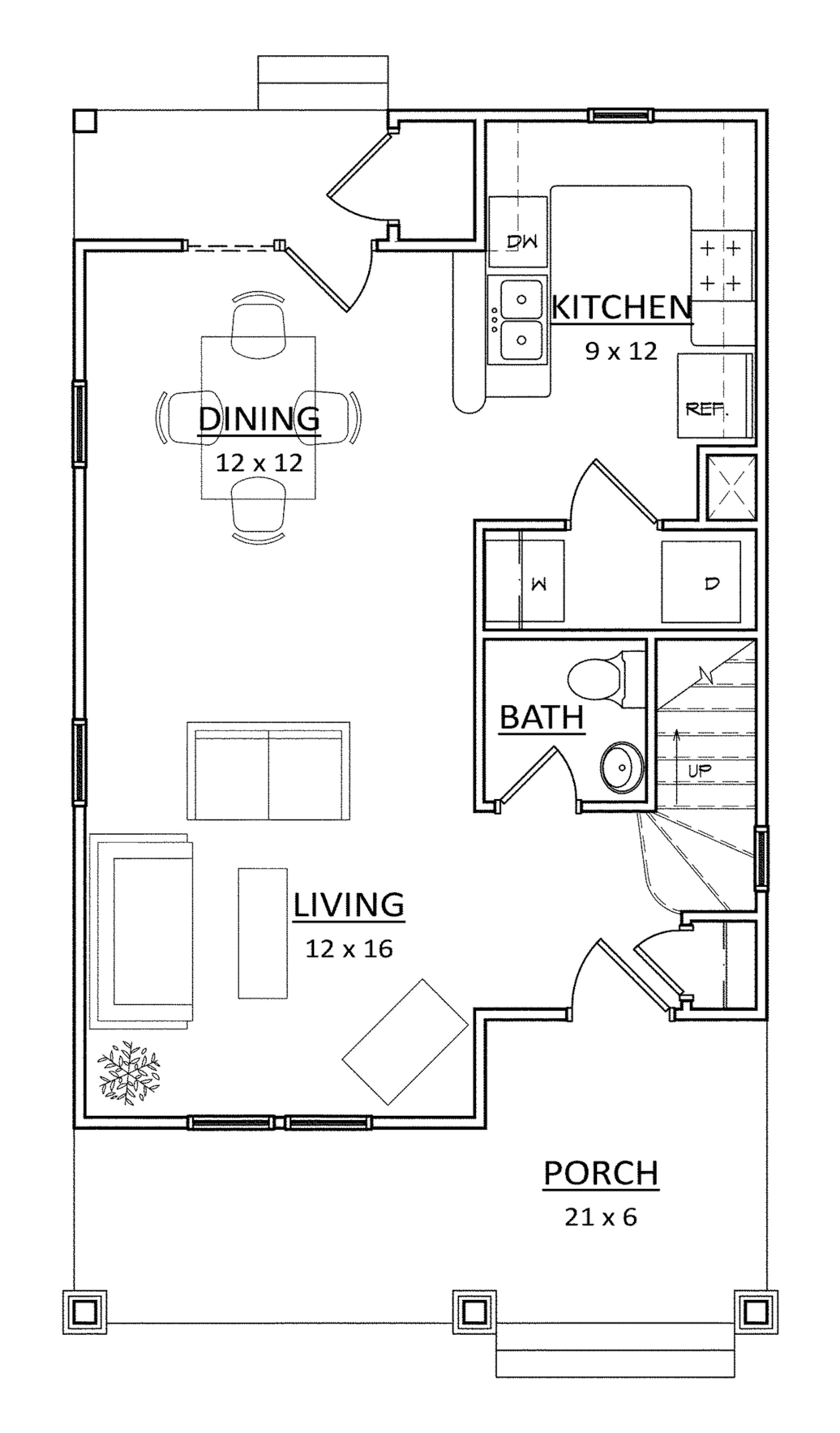 This 21-foot-wide plan extends space visually with a very open layout inside and a welcoming wide porch outside. The living room flows into the dining room, which is served by the kitchen's snack counter. Upstairs, the master suite boasts a walk-in closet and full bath, with the two secondary bedrooms using a hall bath. The dining area also has access to a back porch.