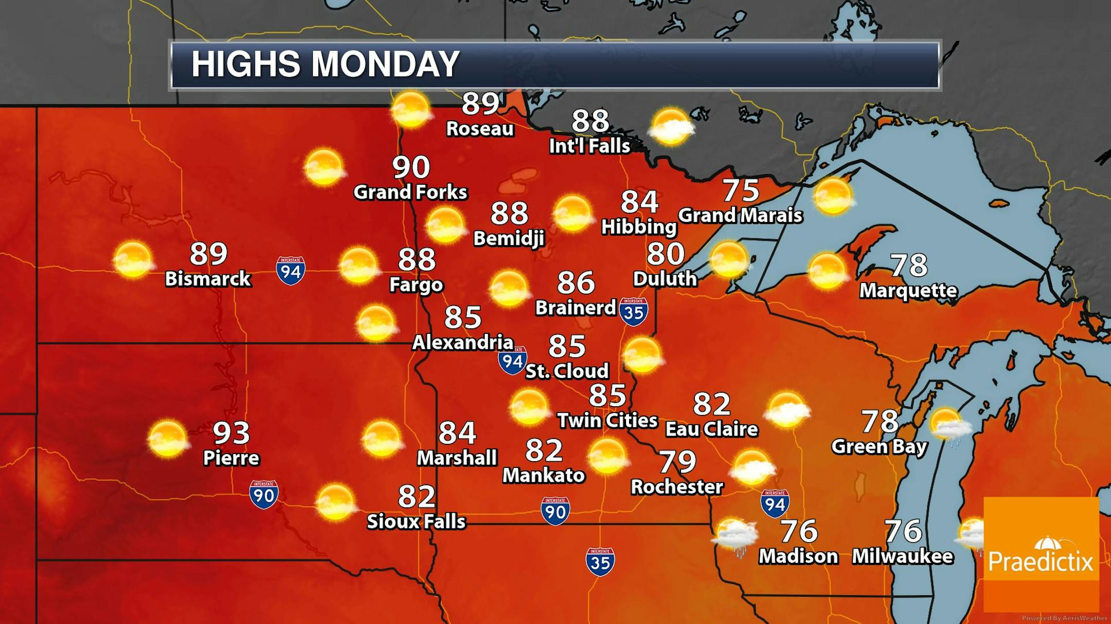 Skies on Sunday where sunny, but were hazy due to wildfires burning in Canada. At times, the air did smell a bit smoky, but air qualities remained in the moderate levels. Below is a satellite loop around midday Sunday and you can see the hazy smoke layer drifting south into Minnesota from Ontario Canada.