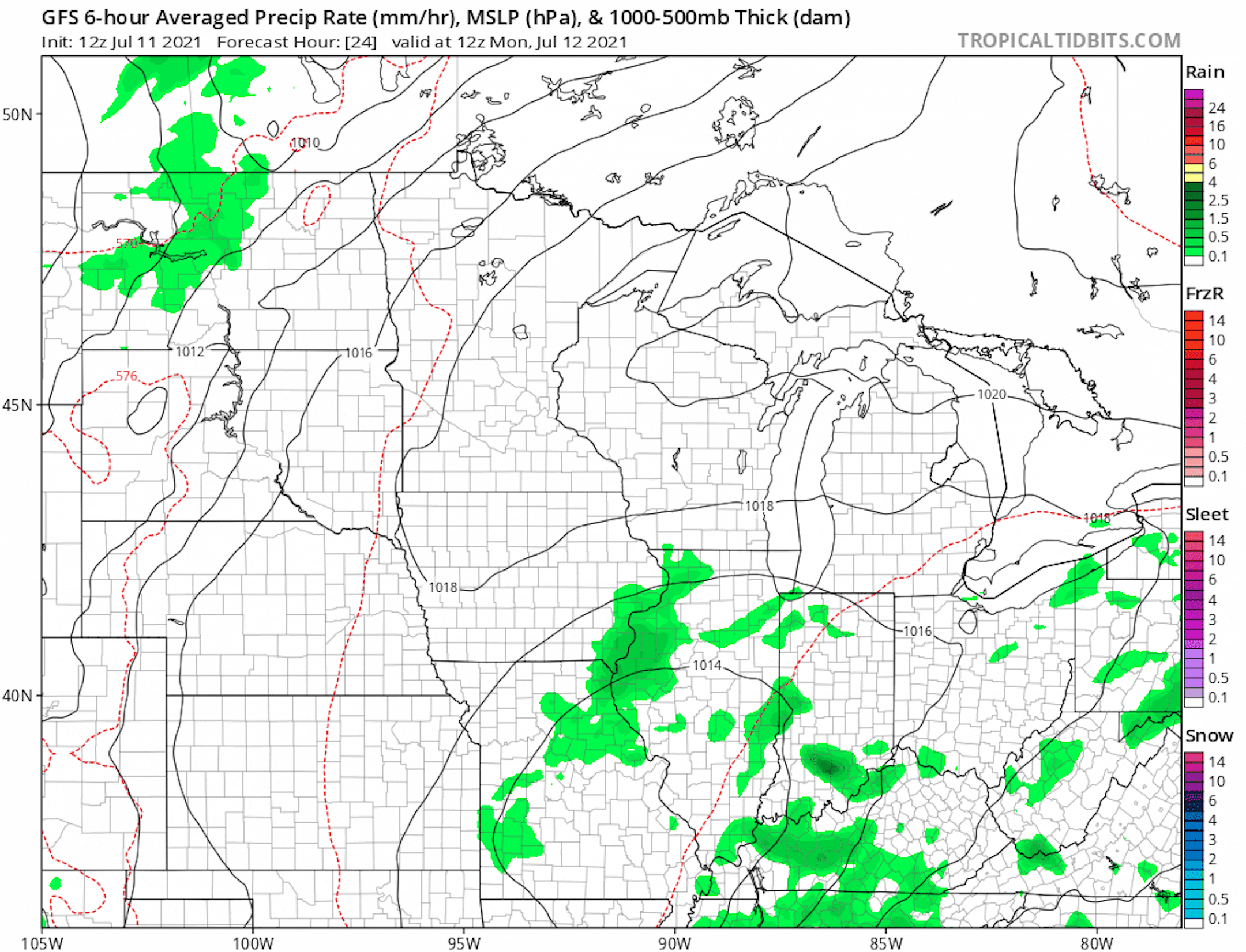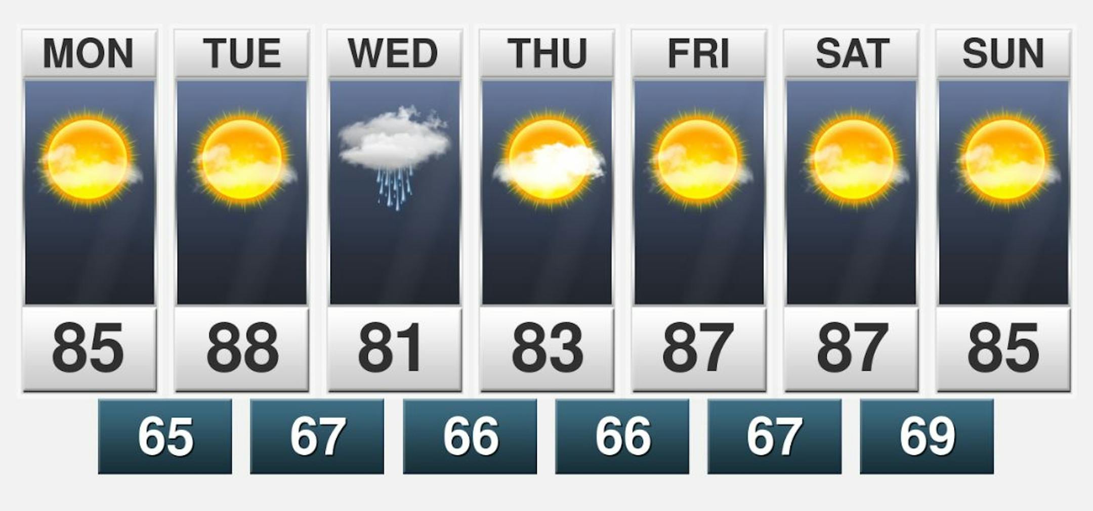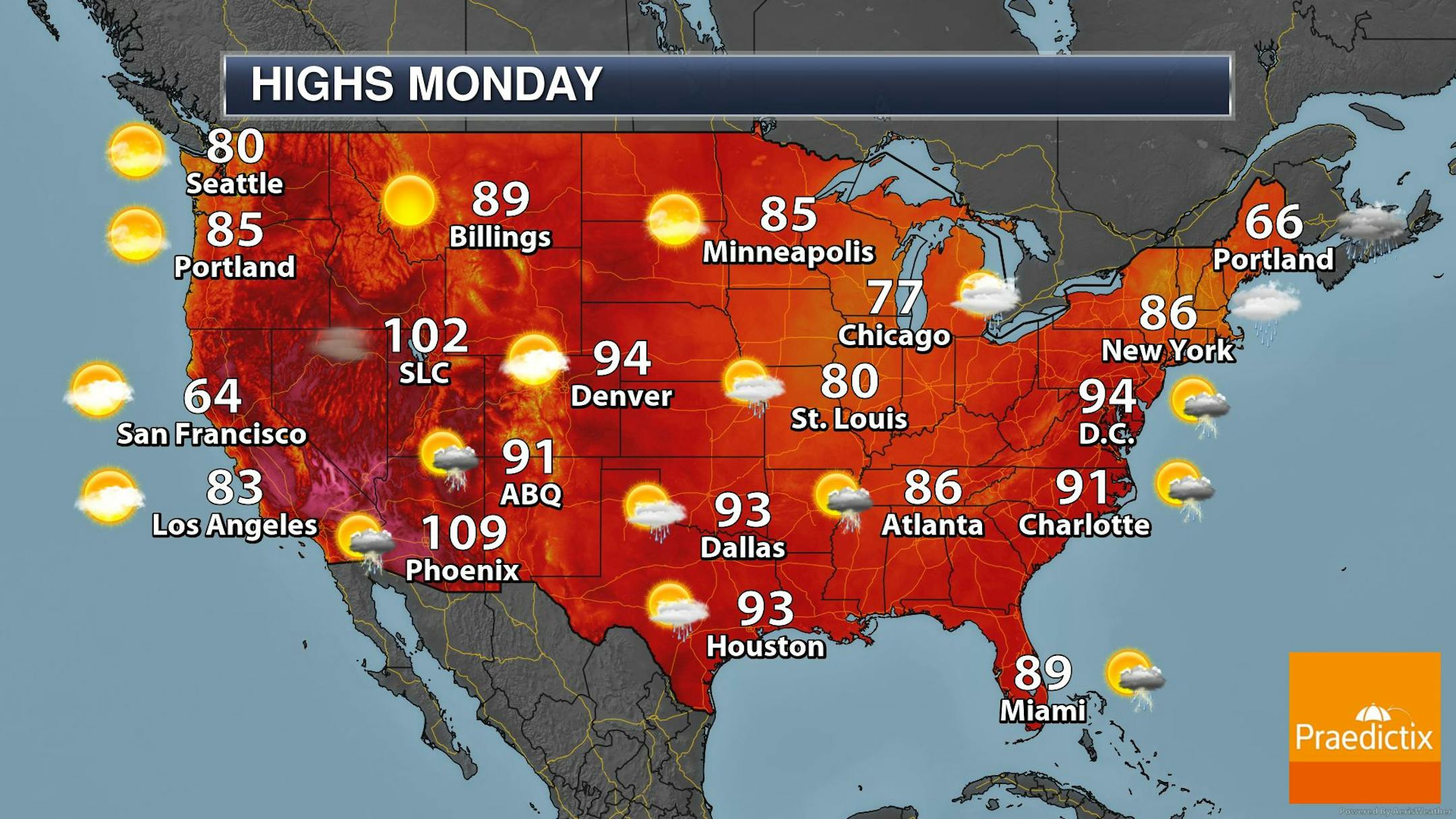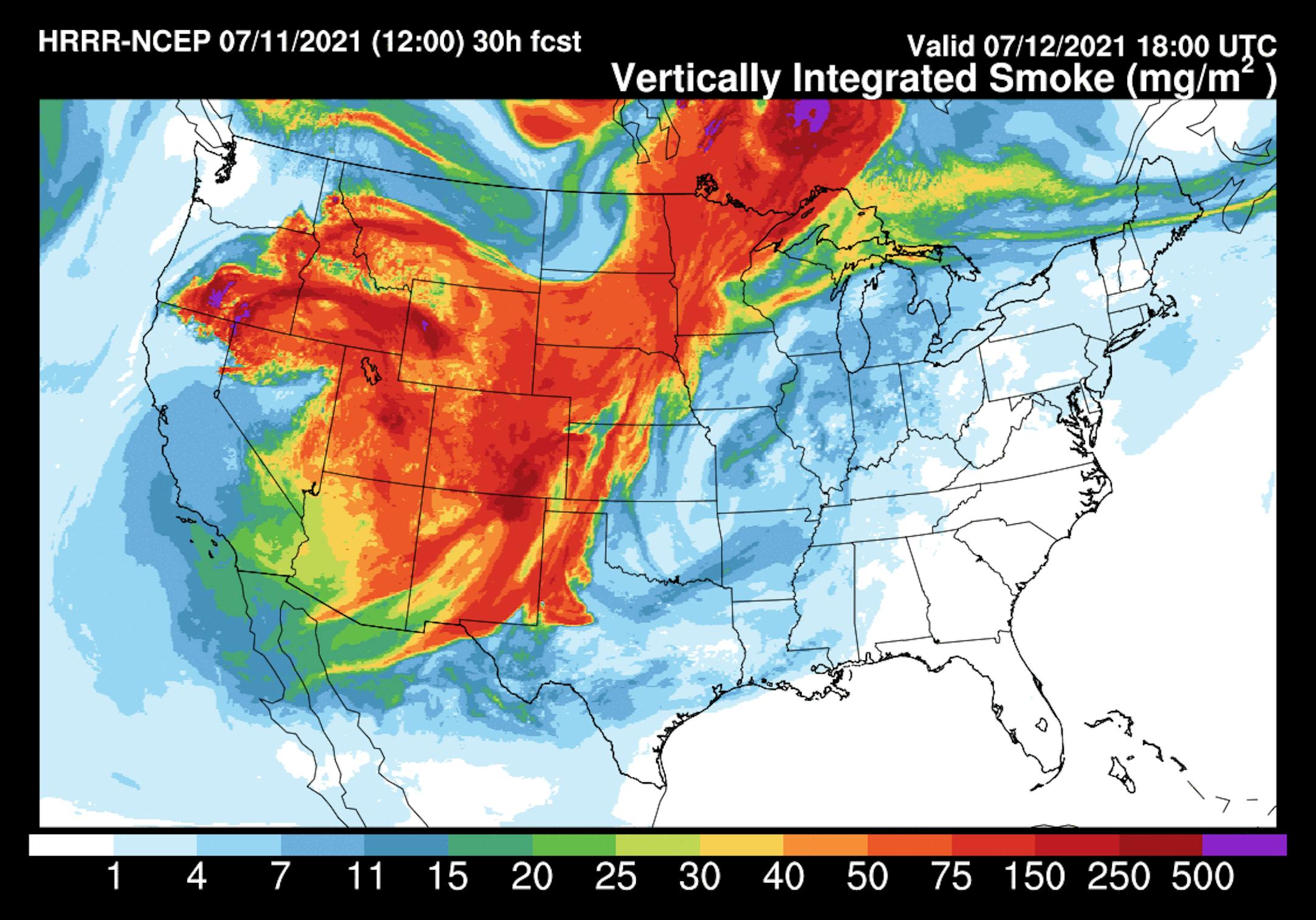 Here is NOAA's HRRR smoke analysis forecast for midday Monday and note the brighter red areas across the Western US and into the Midwest, this is where hazy/smoky skies will be found once again. Sunrise & sunsets will appear quite red/orange in these areas.