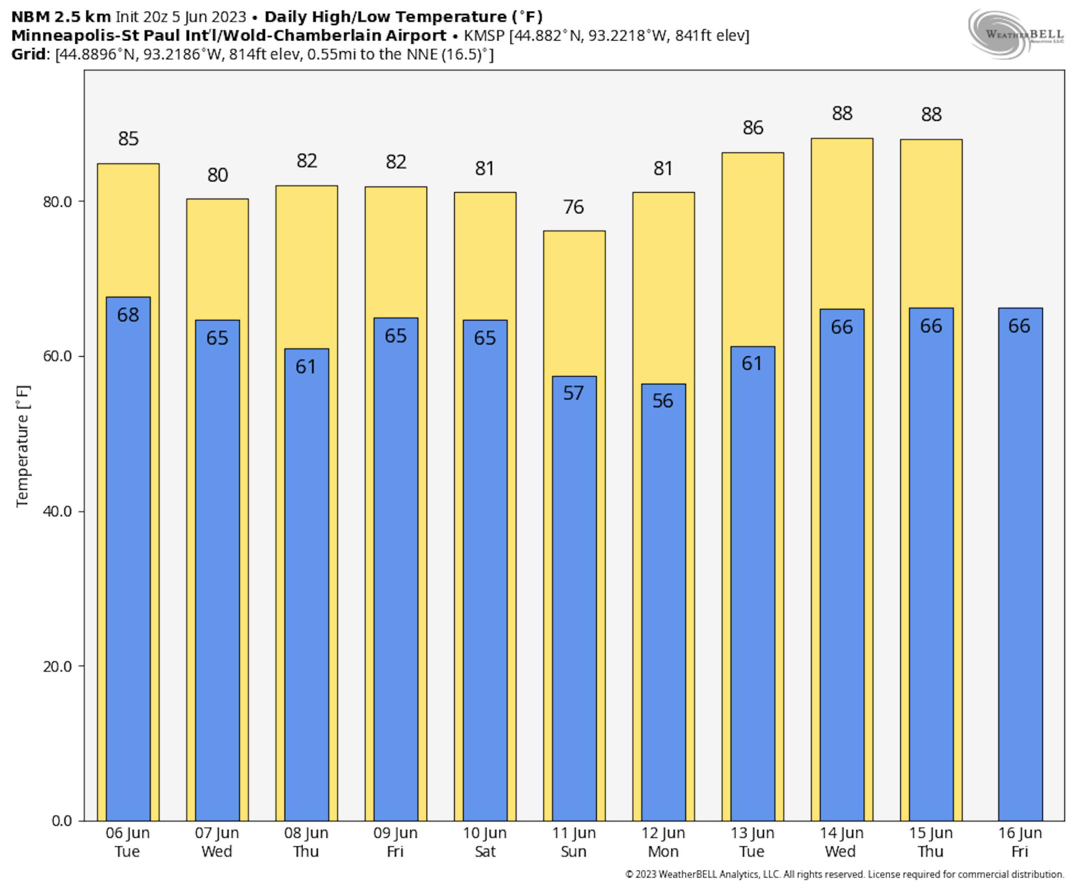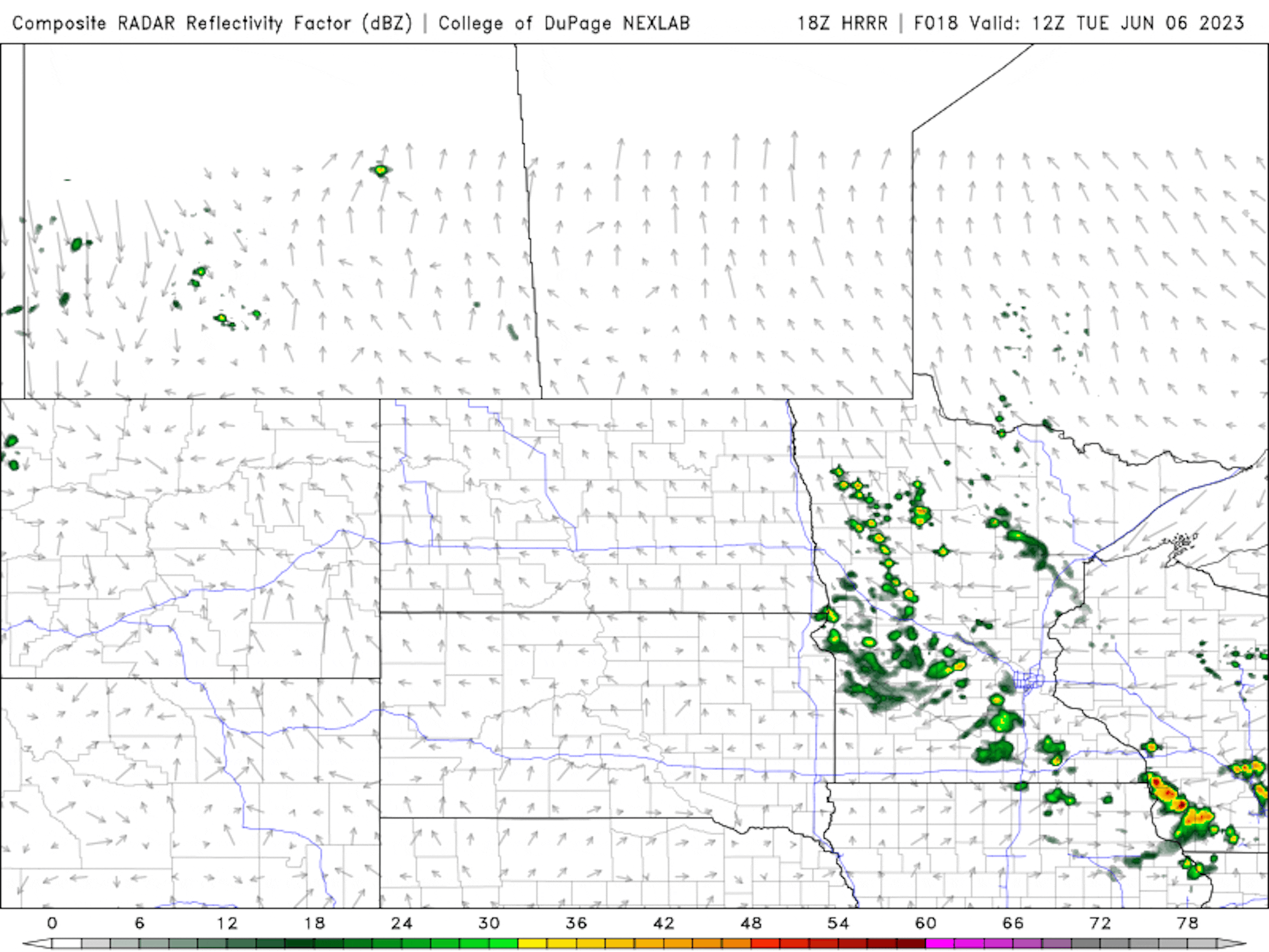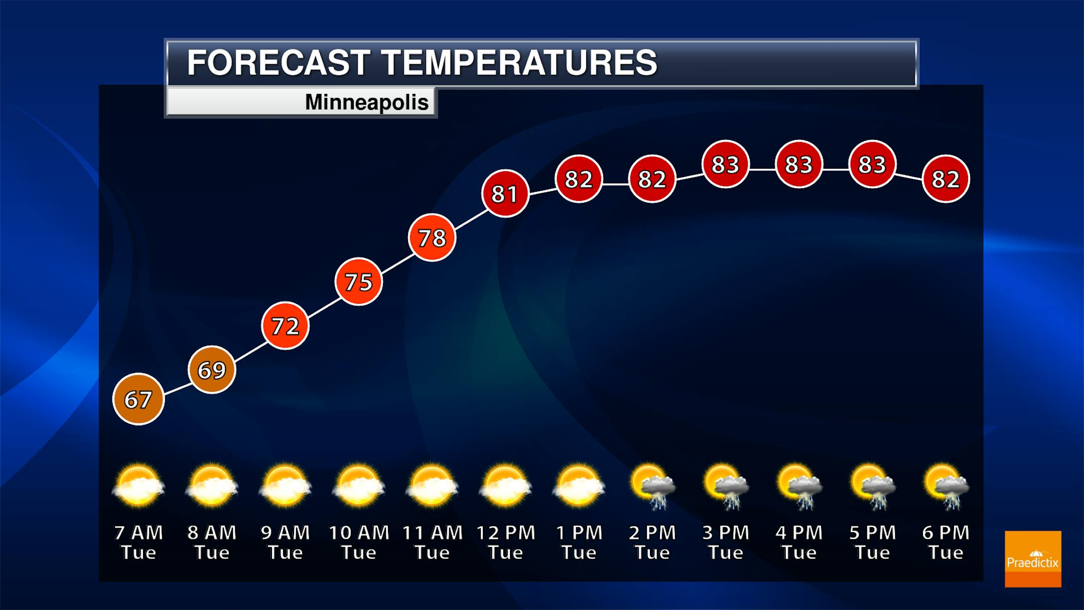 The weather outlook for the Twin Cities on Tuesday, June 6th shows spotty showers and storms possible once again in the afternoon. Temps will warm into the mid 90s with dewpoints still hanging on in the lower 60s.