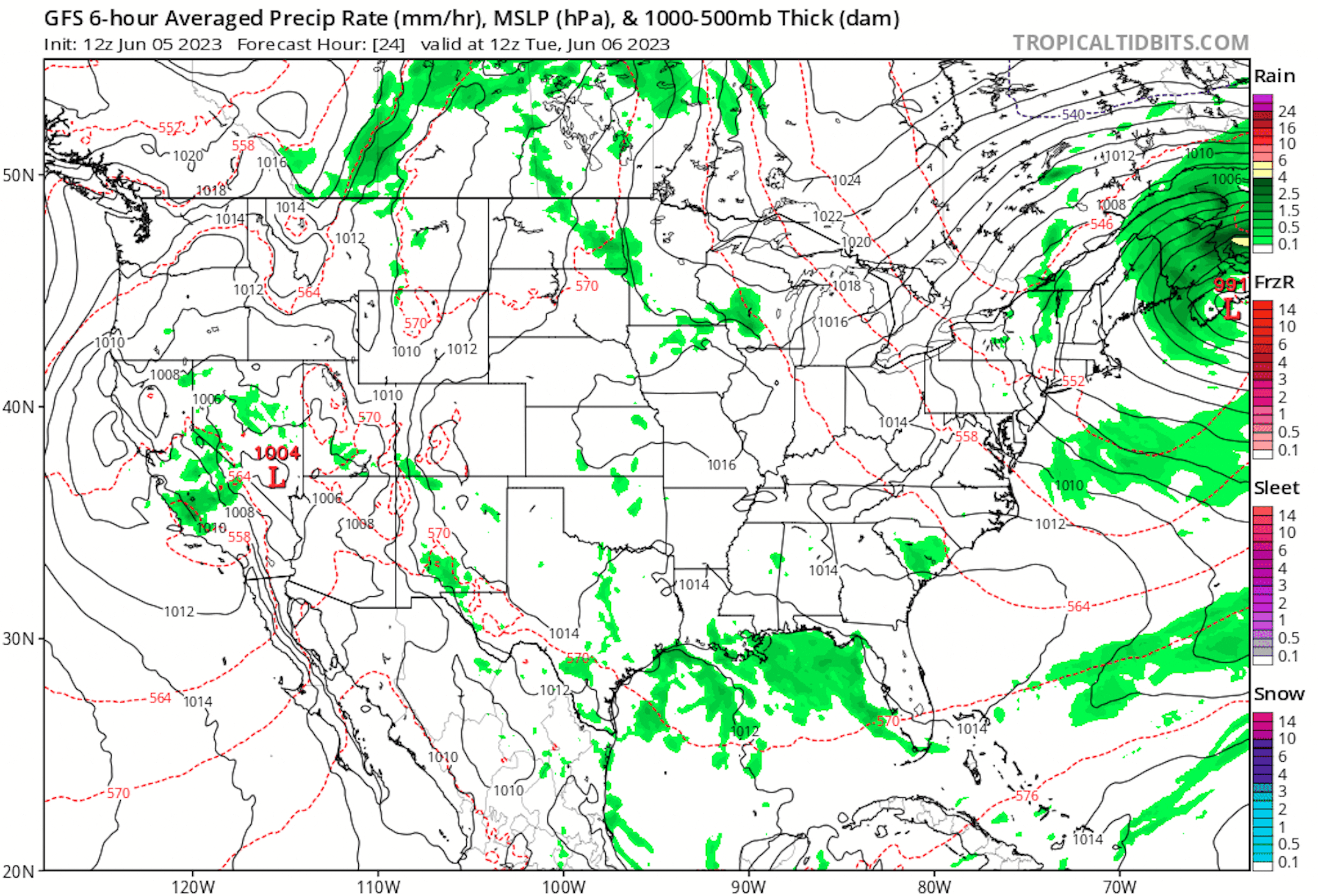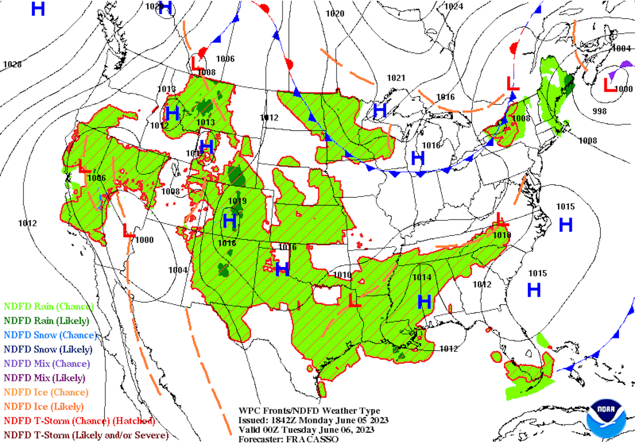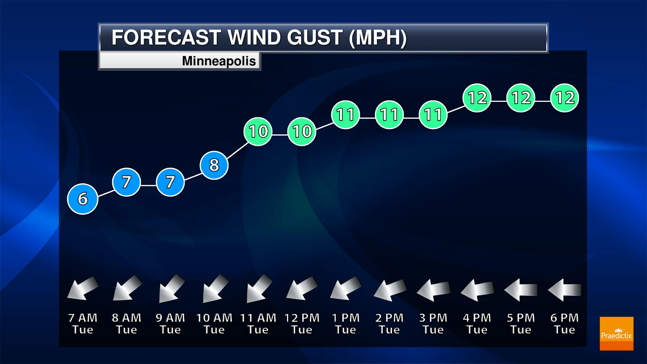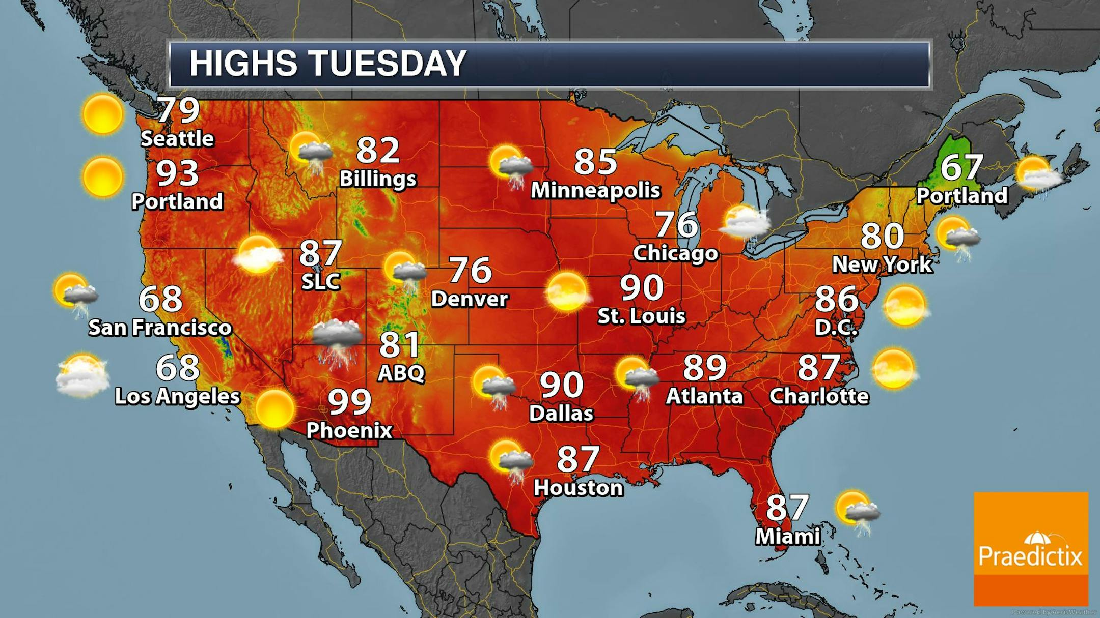 The weather outlook for the Twin Cities on Tuesday, June 6th shows spotty showers and storms possible once again in the afternoon. Temps will warm into the mid 90s with dewpoints still hanging on in the lower 60s.